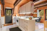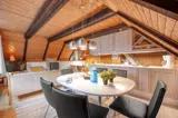 Die Küche ist mit Kühlschrank ausgestattet. Außerdem gibt es 4 elektrische Kochplatten, Umluftofen, Mikrowelle.