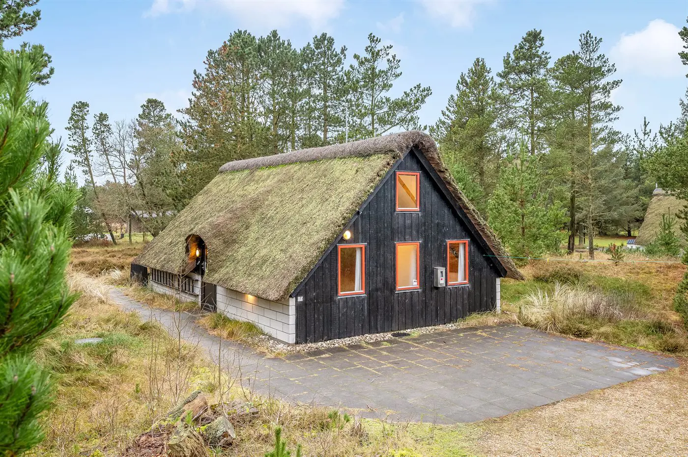 Ferienhaus auf einem leicht hügeligen Dünengrundstück. Zusätzlich zu den rund 60 m² Grundfläche verfügt das Haus über einen 25 m² großen Obergeschoß mit einem Doppelbett, das über eine Treppe zugänglich ist.