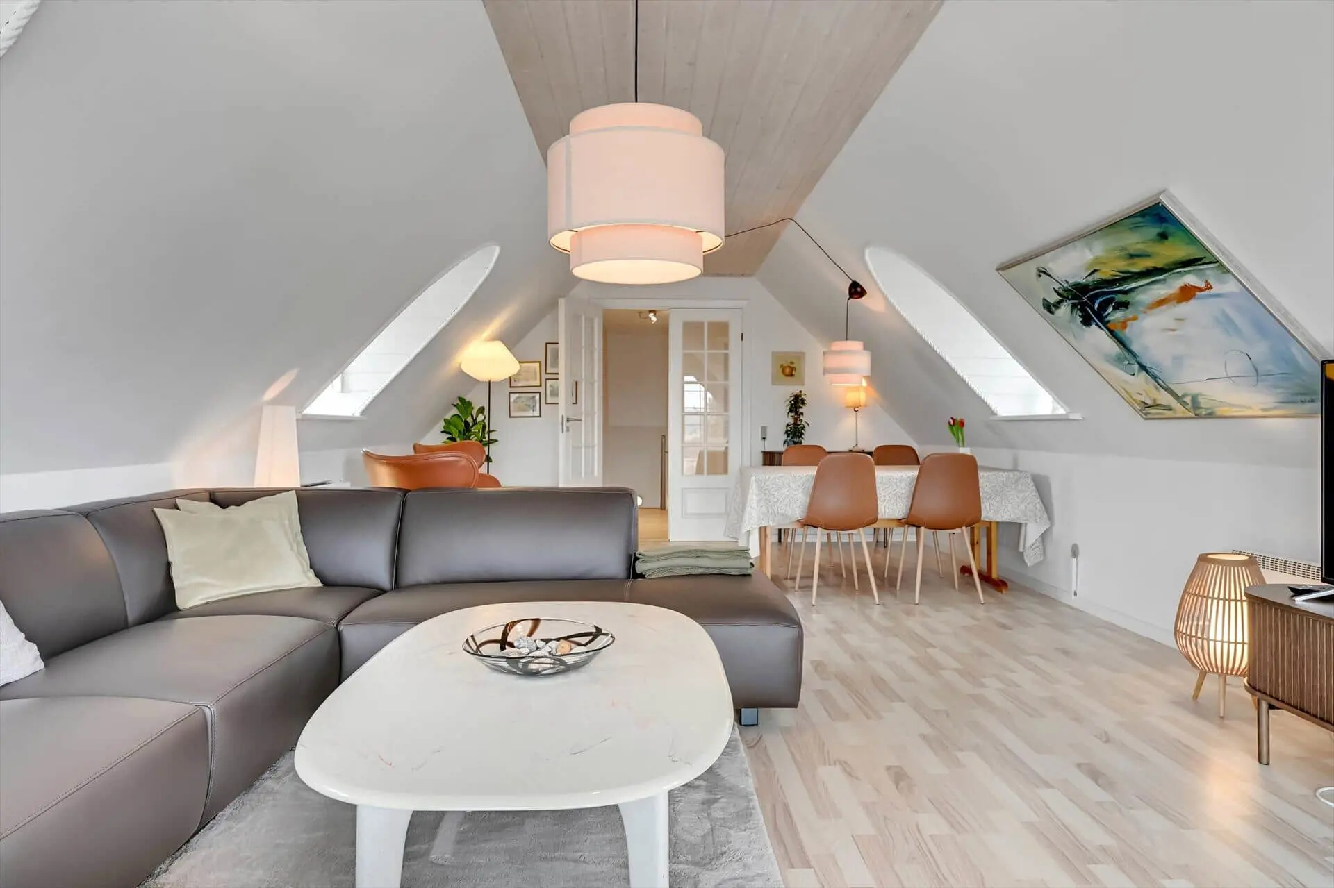 Im Erdgeschoss befindet sich die große, schöne Wohnküche mit unglaublich viel Platz, sowie der Essbereich mit Brennofen. Von hier aus haben Sie auch Zugang zur Terrasse. Von der Küche gelangen Sie direkt in den Poolbereich. Beim Baden im 33 Quadratmeter großen Pool und Whirlpool, trägt der direkte Ausblick auf den Leuchtturm zu Ihrer Entspannung bei. Der Pool wird aus Energiespargründen zum Teil durch die Wärmepumpe beheizt. Die Sauna und ein großes Badezimmer schließen unmittelbar an den Poolraum an. Des weiteren befinden sich im Erdgeschoss zwei gute Schlafzimmer mit Doppelbetten. Im Obergeschoss befinden sich zwei zusätzliche Schlafräume. Einer davon ist mit einem Etagenbett ausgestattet. Der andere Schlafraum ist sehr geräumig, mit einem Doppelbett ausgestattet und beeindruckt durch seinen Balkon mit prächtiger Aussicht. Der große Wohnraum bietet viel Platz. Vom großen Sofaarrangement aus, können Sie entweder entspannt fernsehen oder den Ausblick genießen. Für die kleinen Urlauber ist im Wohnbereich ein Tisch zum Malen und Spielen untergebracht.