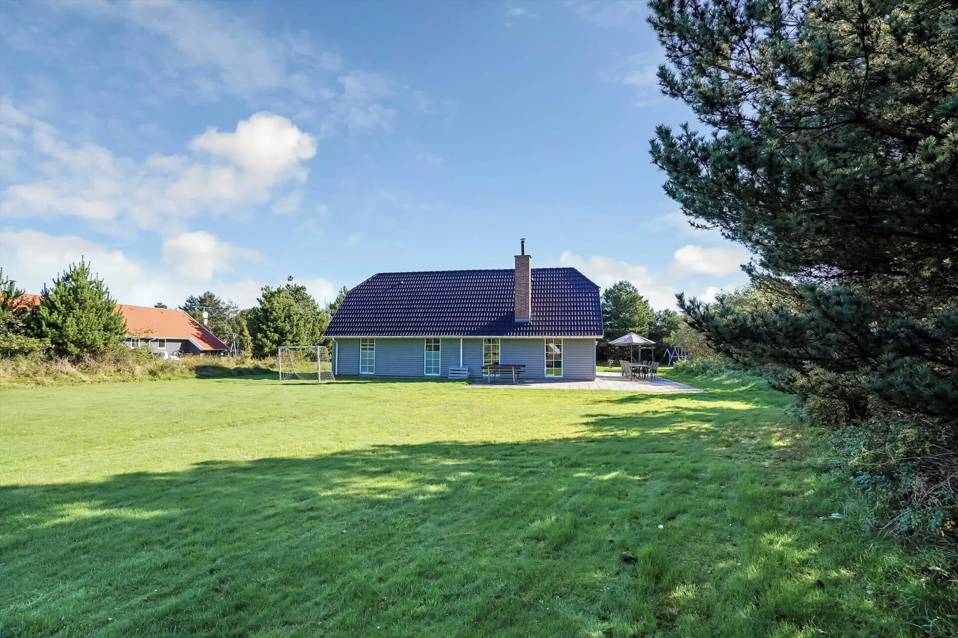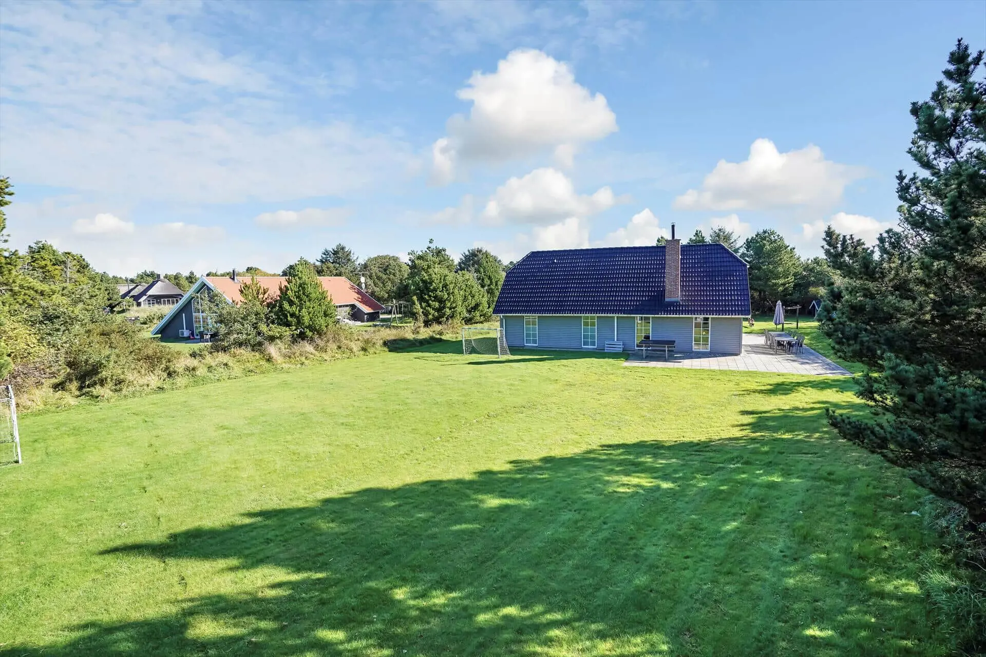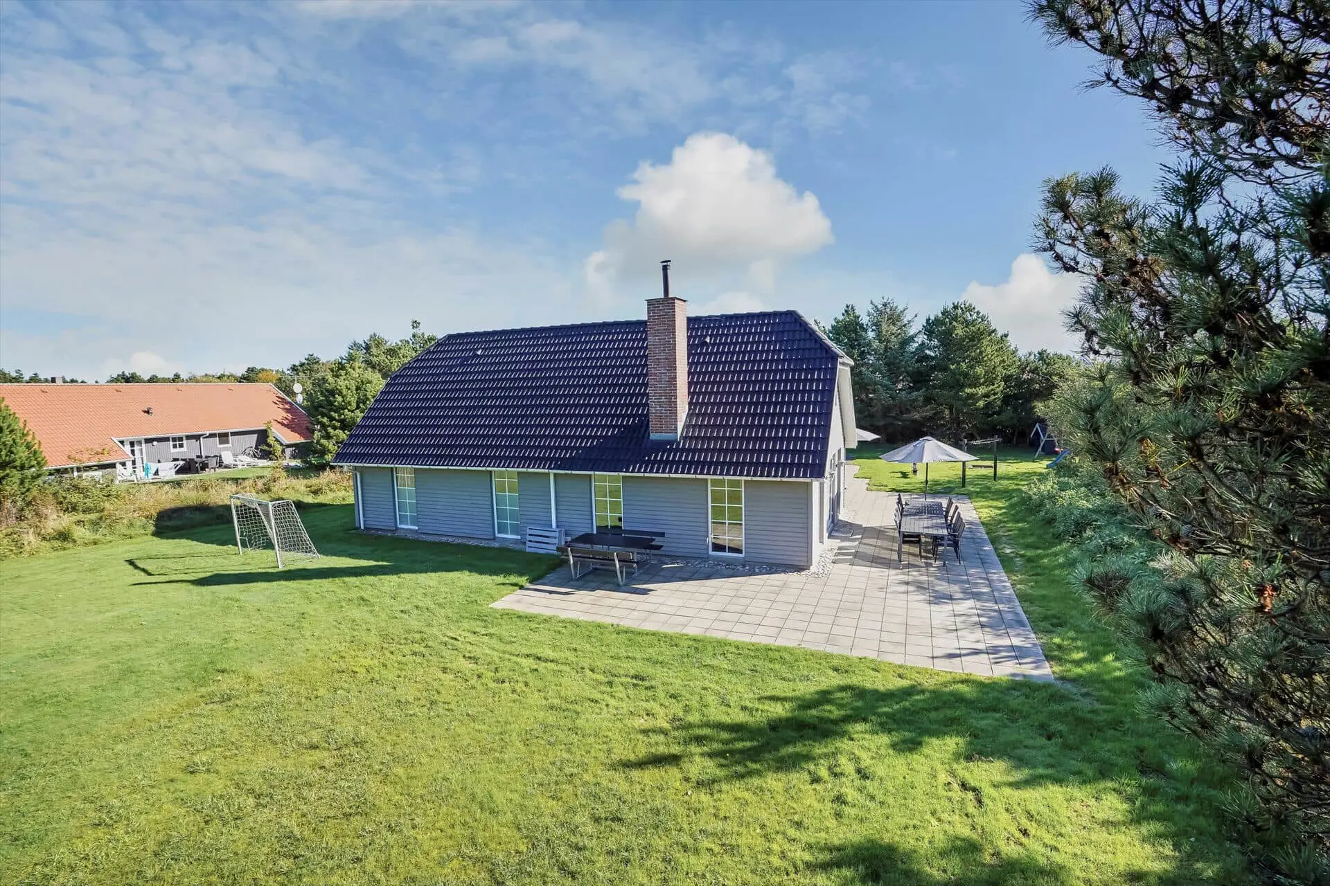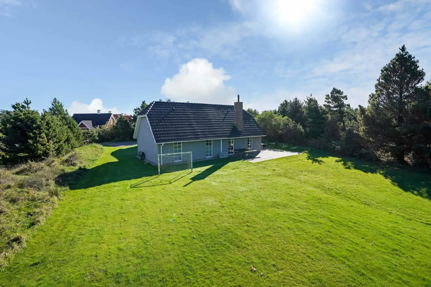 Die Außenbereiche eignen sich genau wie das Innere des Hauses perfekt für zahlreiche Urlaubsgäste. Das große Grundstück liegt ein wenig zurückgezogen vom Weg und bietet Ihnen mit seiner Schotterfläche gute Parkmöglichkeiten. Zu mehreren Seiten hin sind die Grundstücksränder dicht bewachsen, wodurch Sie sich auf den sonnenverwöhnten Terrassenflächen ungestört und nach Herzenslust frei entfalten können. Die weitläufige Grünfläche lädt mit einem Fußballtor zu Ballspielen ein. Dank des vorhandenen Sandkasten, des Spielhauses und der Schaukel ist selbst bei den kleinsten Urlaubern für Spaß und Abwechslung gesorgt.