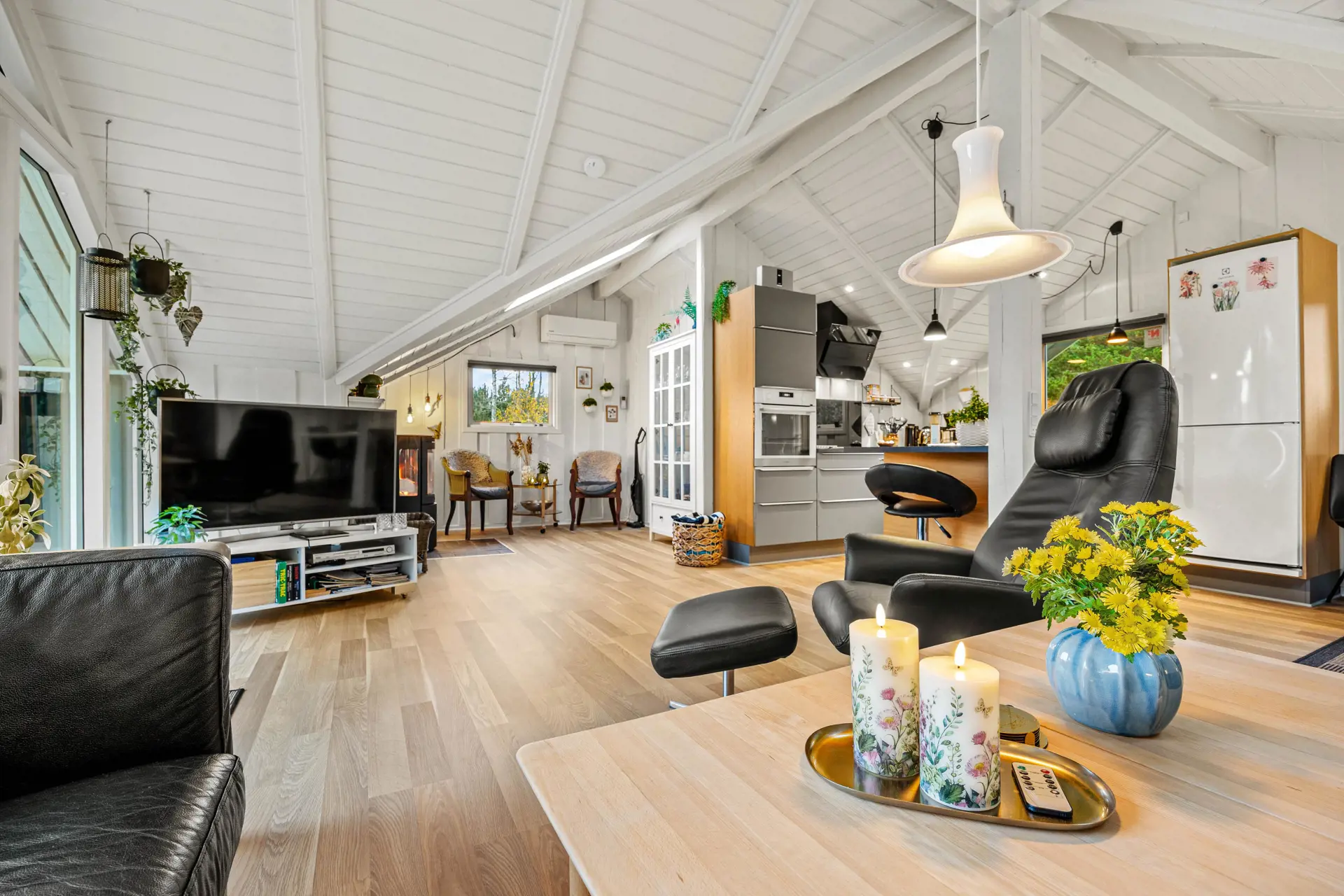 Das Herzstück des Ferienhauses ist der Wohnbereich mit dem Kaminofen, der an kühlen Abenden für wohlige Wärme sorgt.