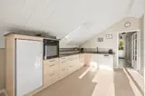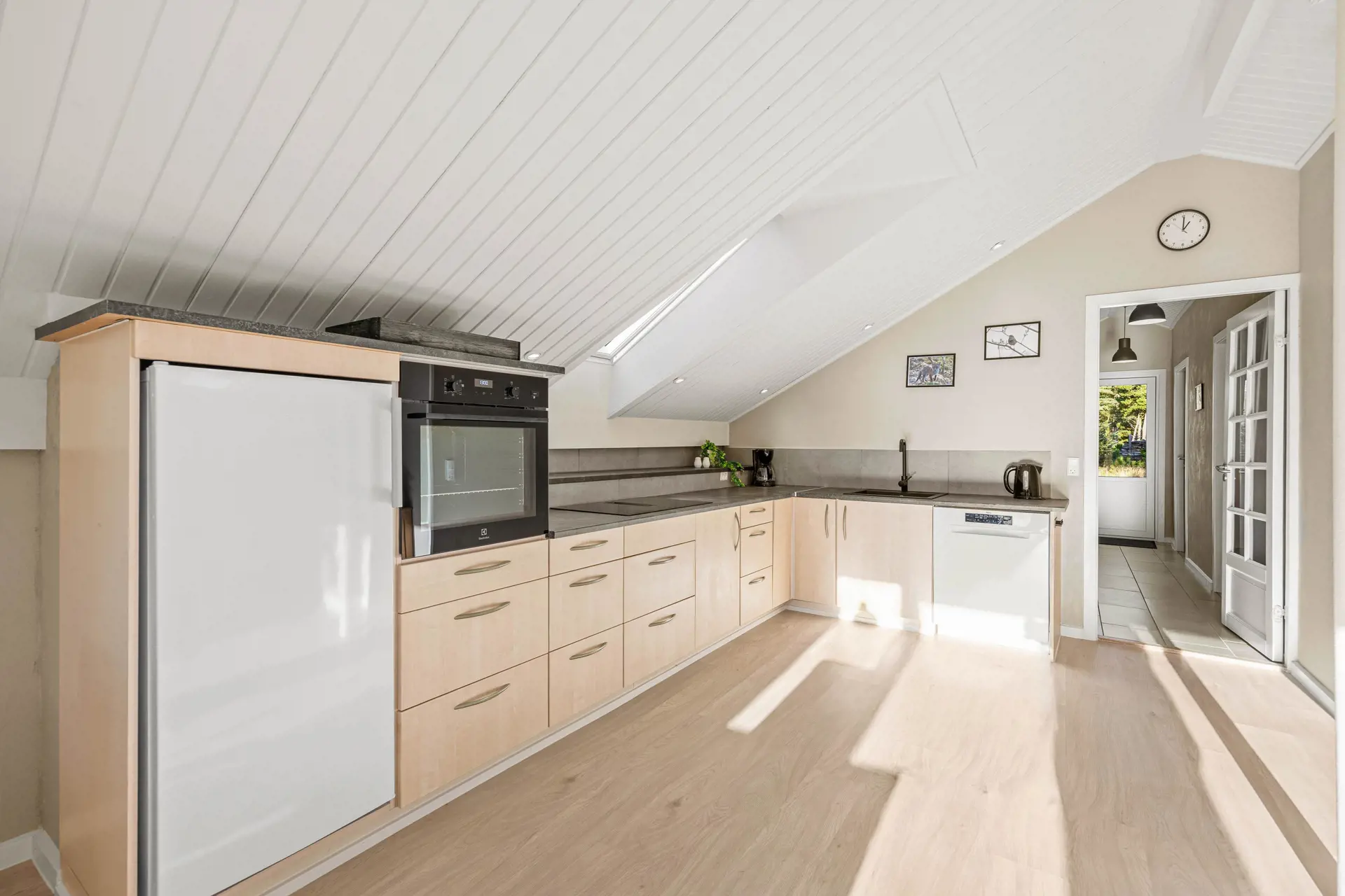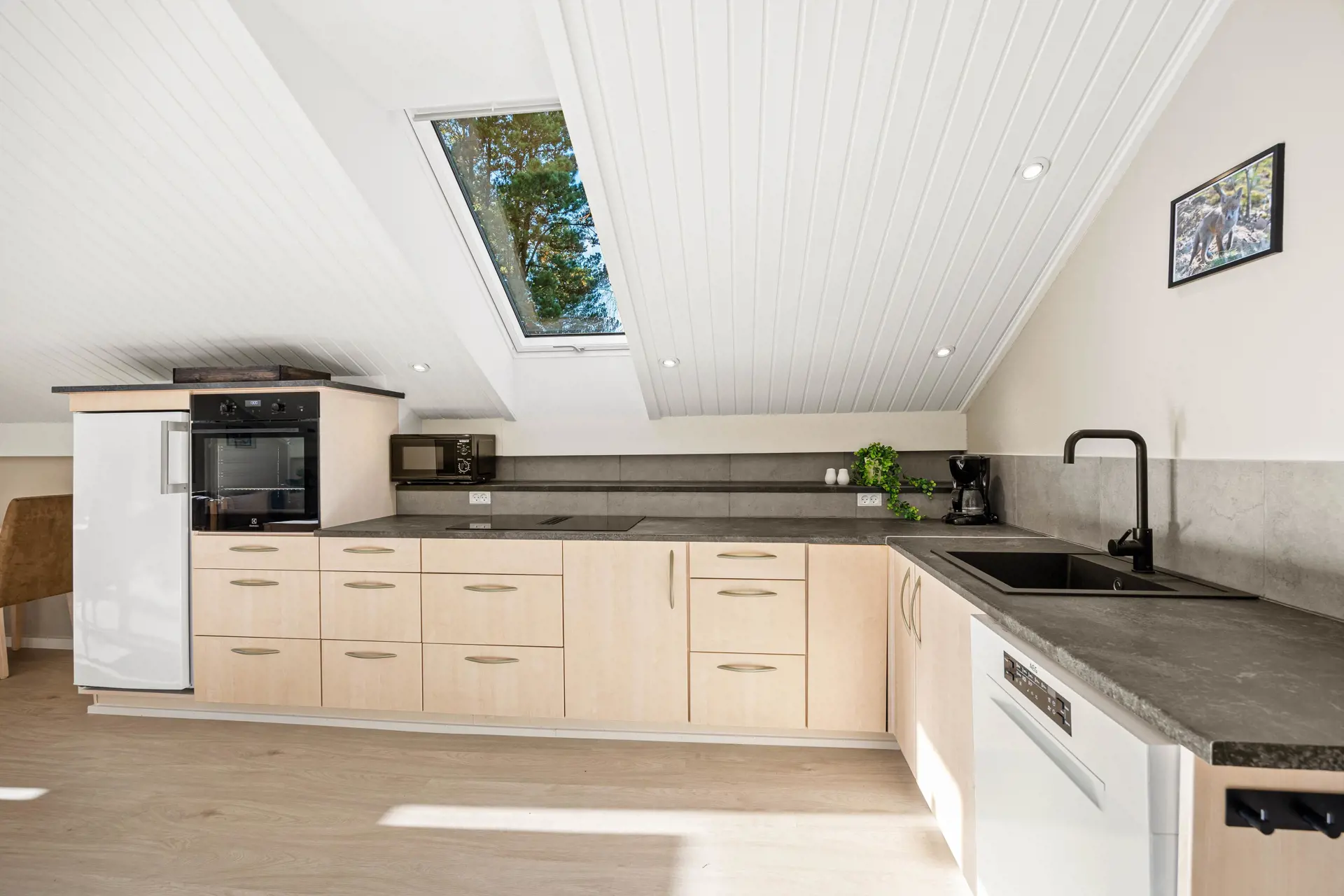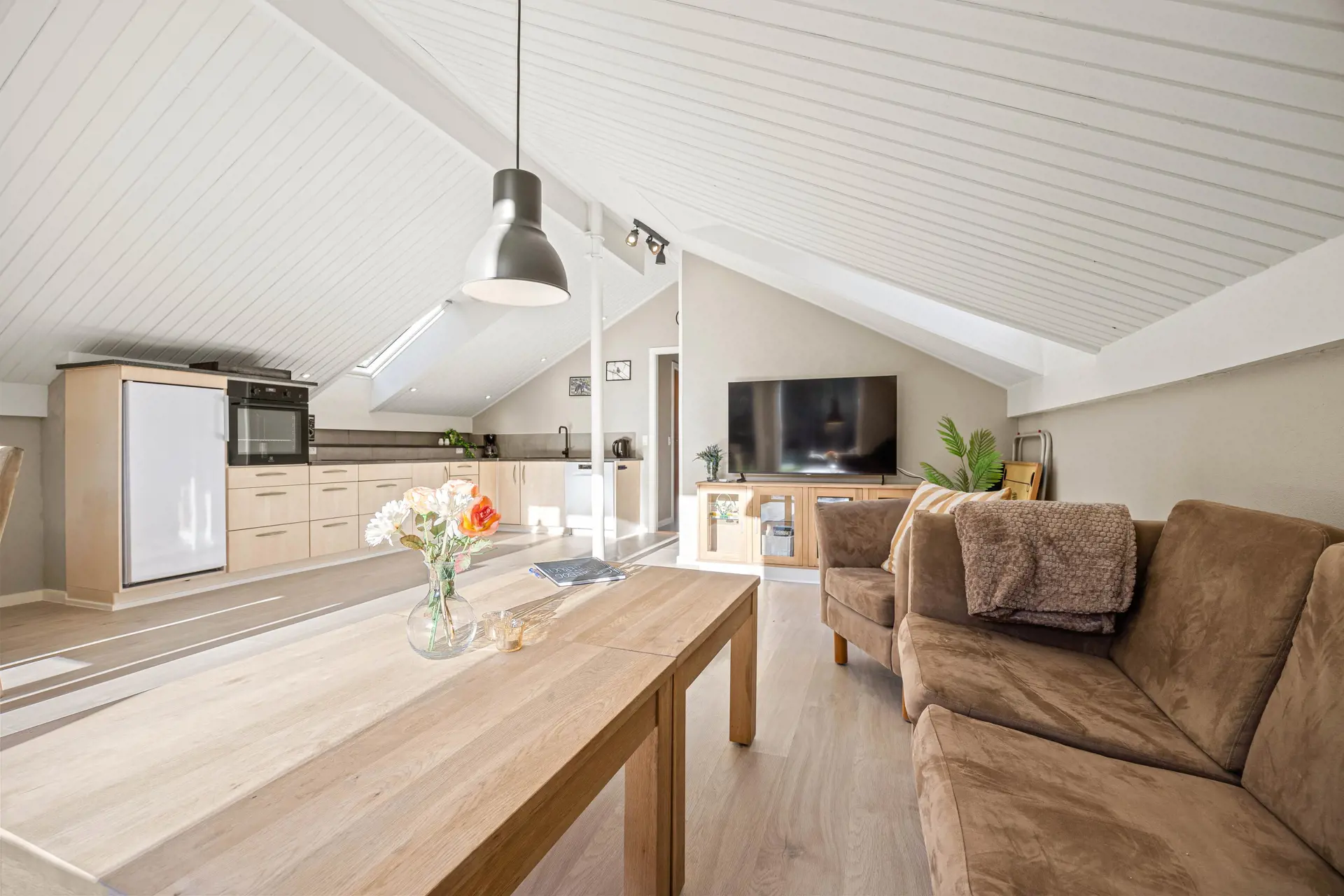 Der helle Küchen- und Wohnbereich ist der natürliche Treffpunkt des Hauses, mit offenen Decken und großen Fensterflächen, die für eine offene und angenehme Atmosphäre sorgen. Hier gibt es viel Platz zum Kochen, gemeinsamen Essen und gemütlichen Beisammensein. Die Küche ist renoviert und ausgestattet mit Geschirrspüler und einem großzügigen 90-Liter-Gefrierschrank, sodass alles Notwendige für den Urlaub leicht untergebracht werden kann.