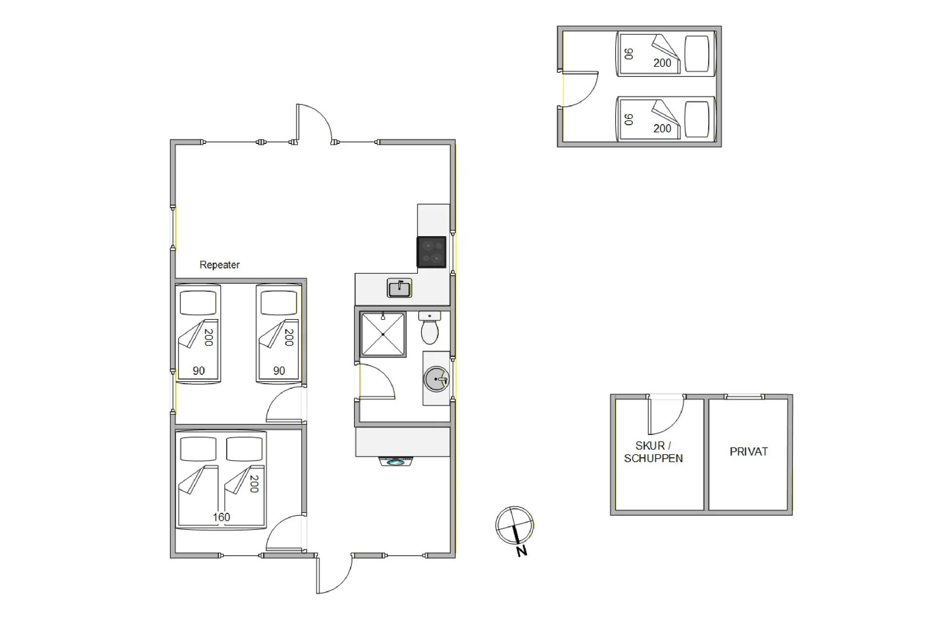 Das Ferienhaus verfügt über 6 Schlafplätze, verteilt auf 2 funktionale Zimmer. Ein Zimmer ist mit einem Doppelbett ausgestattet, das andere mit 4 Einzelbetten – ideal für Kinder oder Gäste. Hinzu kommt der 13 m² große Anbau, der zwei zusätzliche Schlafplätze und etwas mehr Privatsphäre bietet.