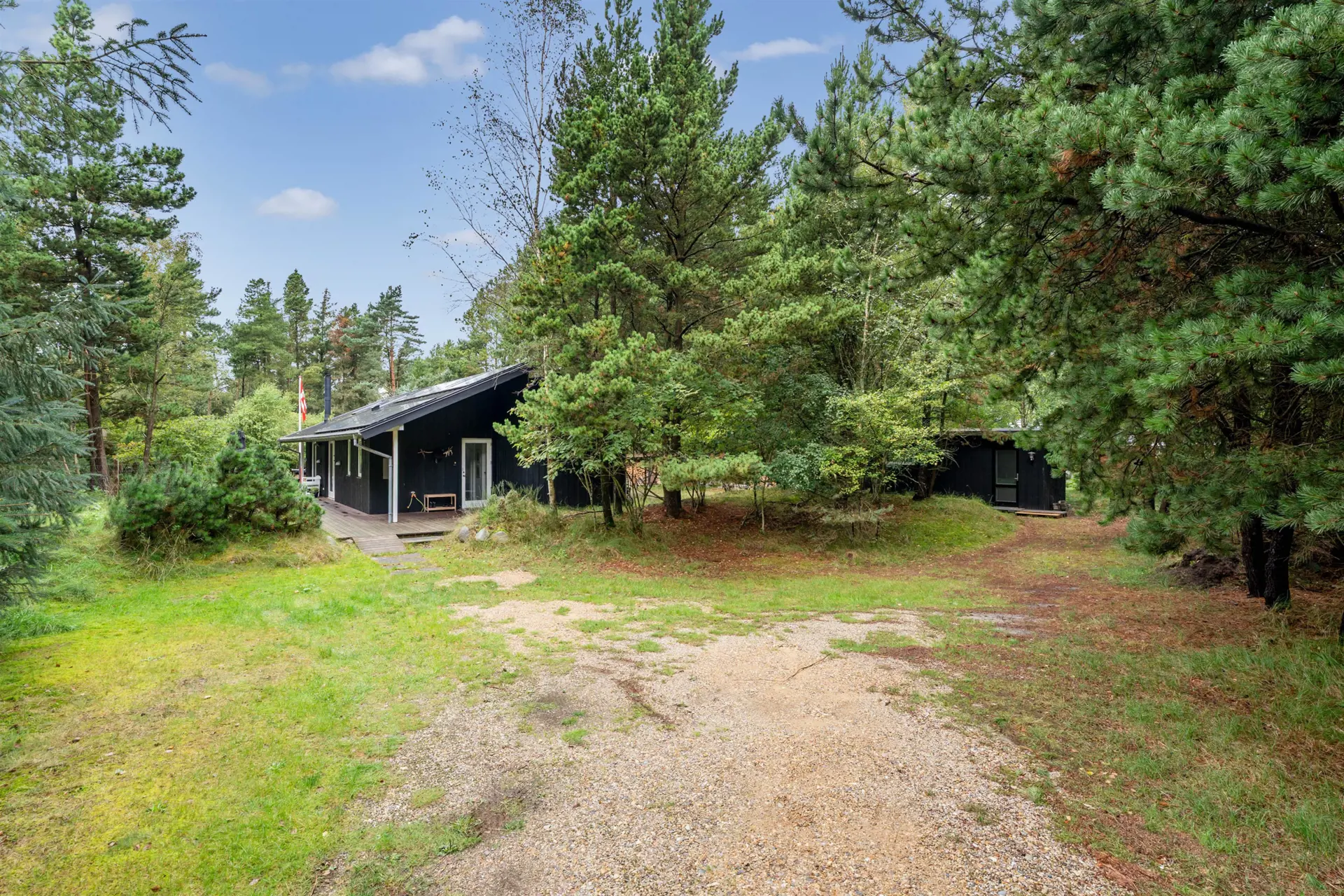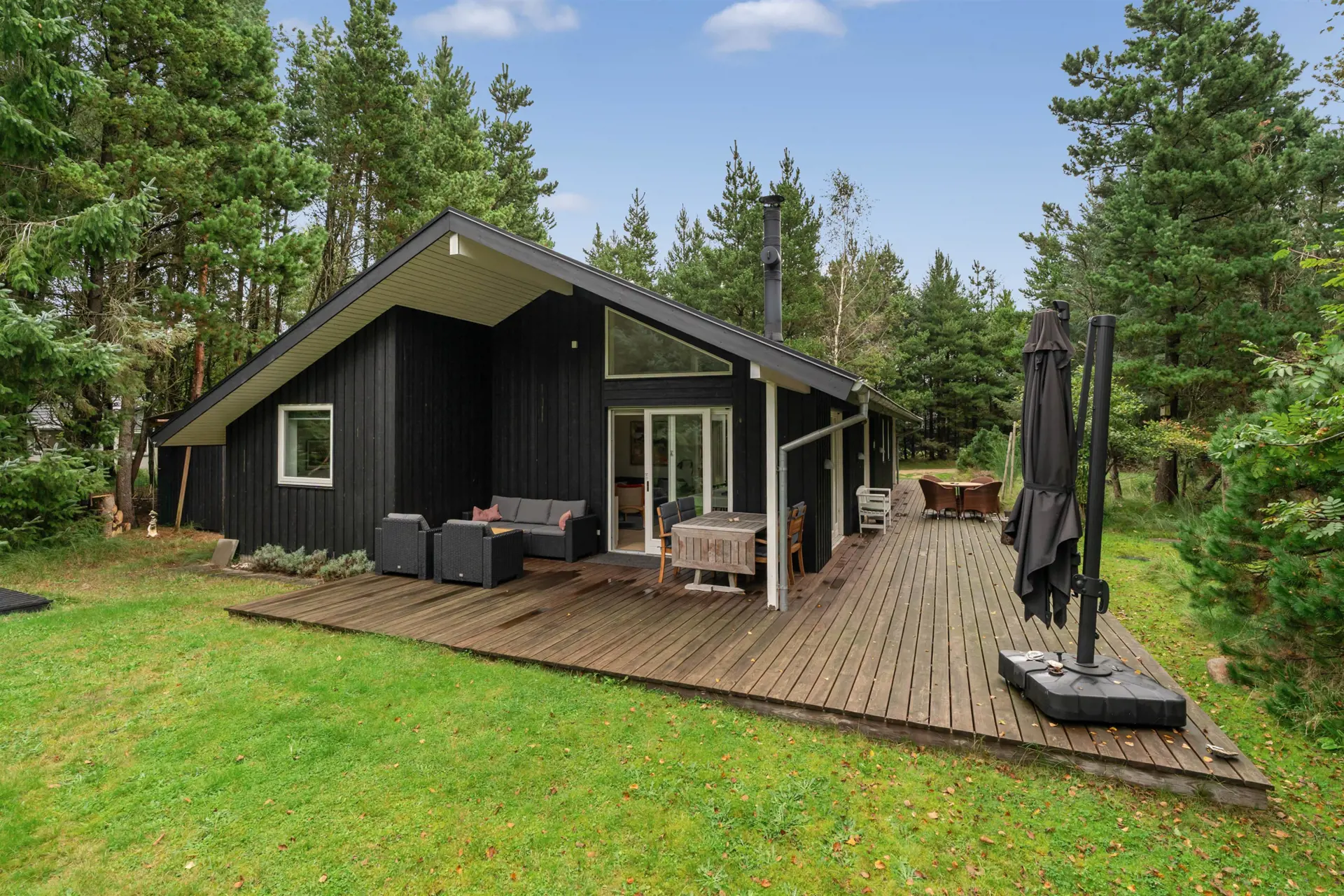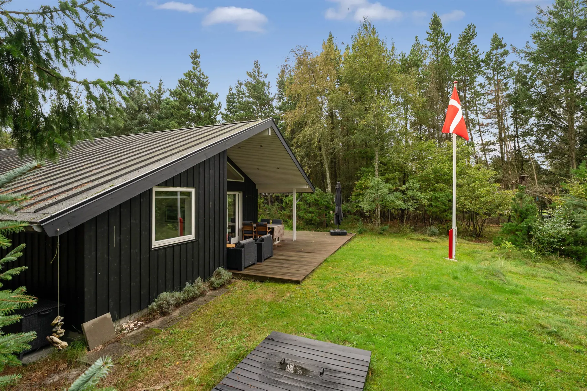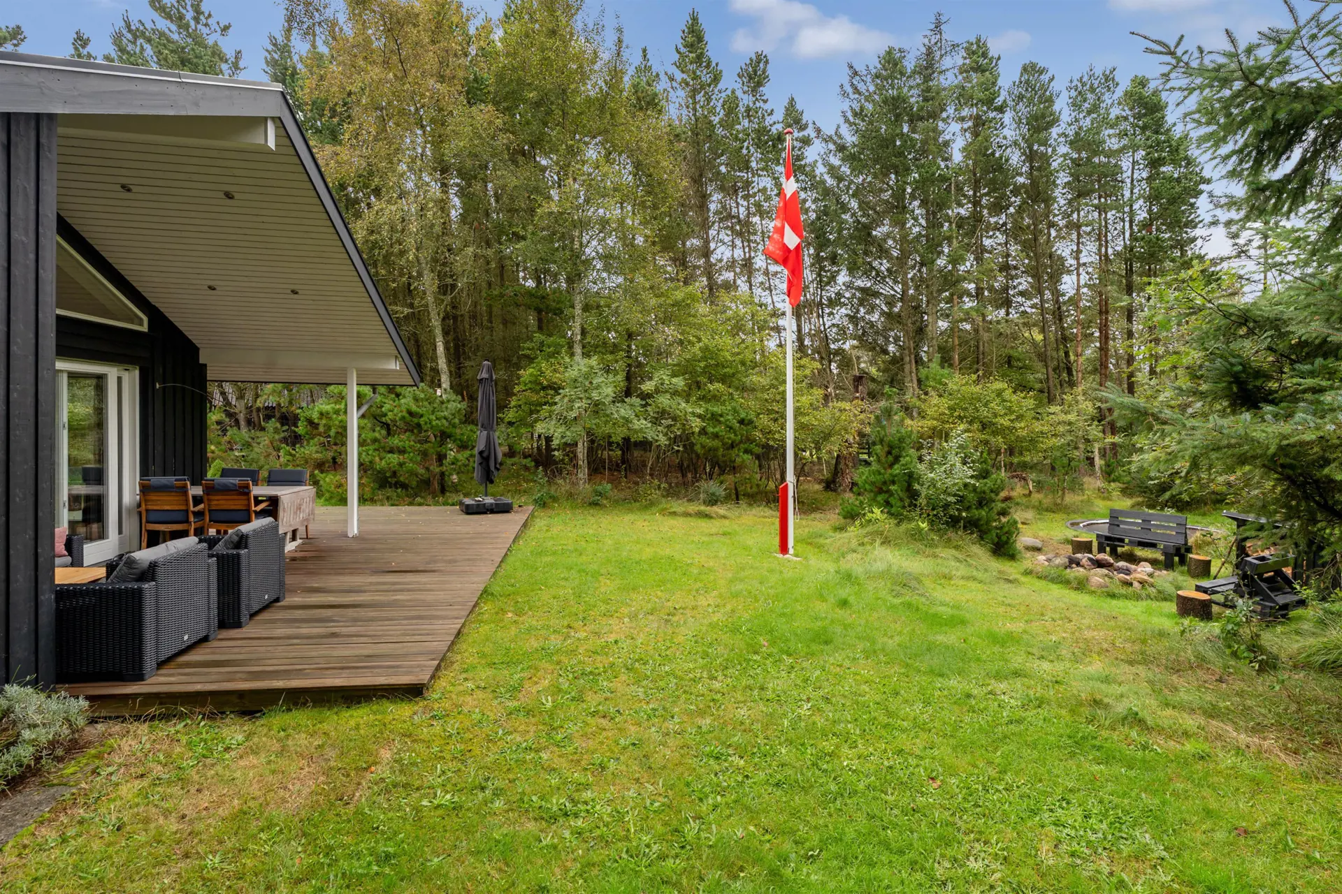 Das 2480 Quadratmeter große Naturgrundstück bietet reichlich Raum für Erholung und Abenteuer. Für die kleinen Gäste gibt es einen Sandkasten und ein Trampolin und dank der komfortablen Gartenmöbel und der überdachten sowie abgeschirmten Terrasse werden die Stunden im Freien in jeder Hinsicht erholsam. Die ganze Familie kann sich auch am Lagerfeuerplatz etwas weiter unten im Garten vergnügen.