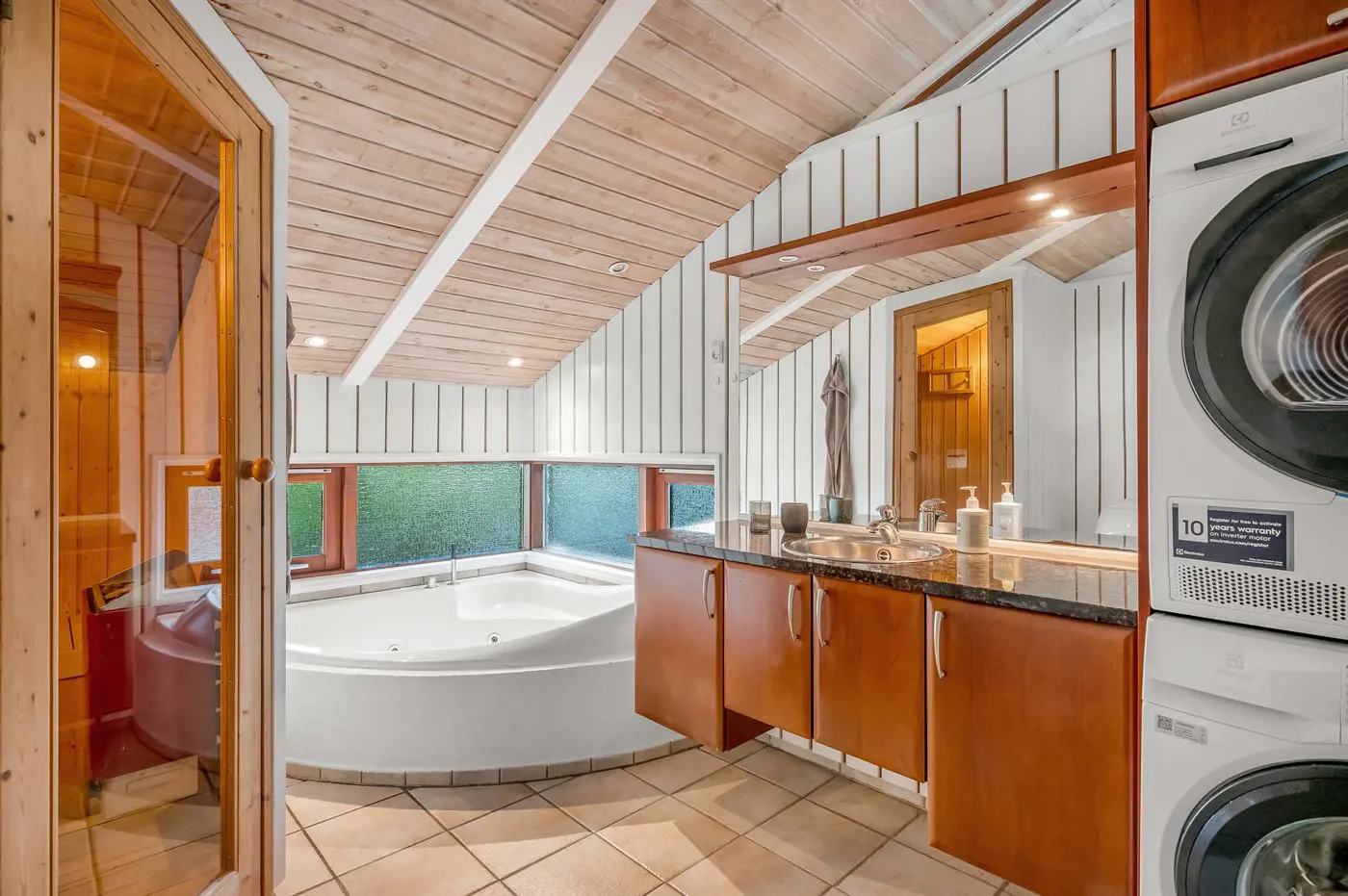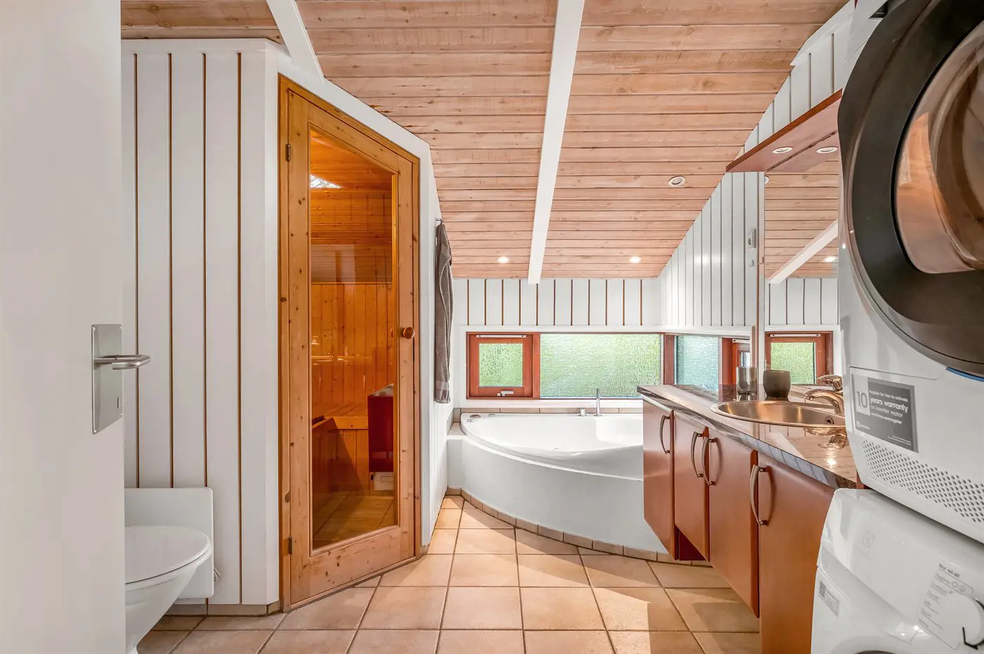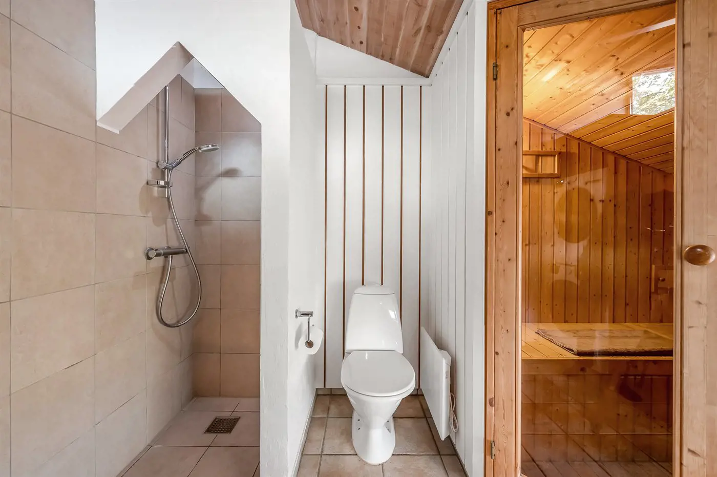 Es gibt 1 Badezimmer mit Duschnische und 1 Toilette.. Fußbodenheizung in 1 Badezimmer. Es steht eine Sauna zur Verfügung in der Sie sich so richtig entspannen können.