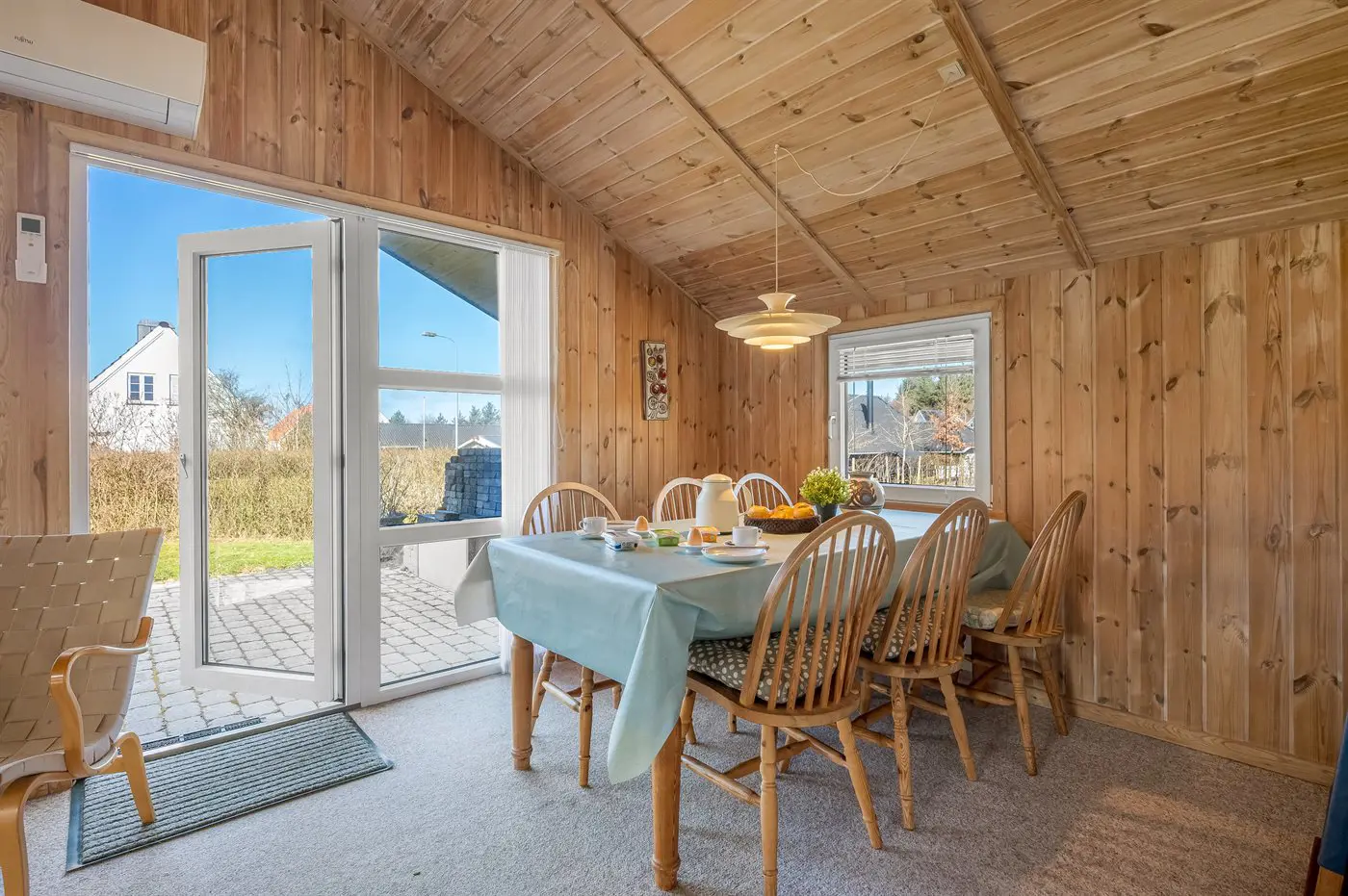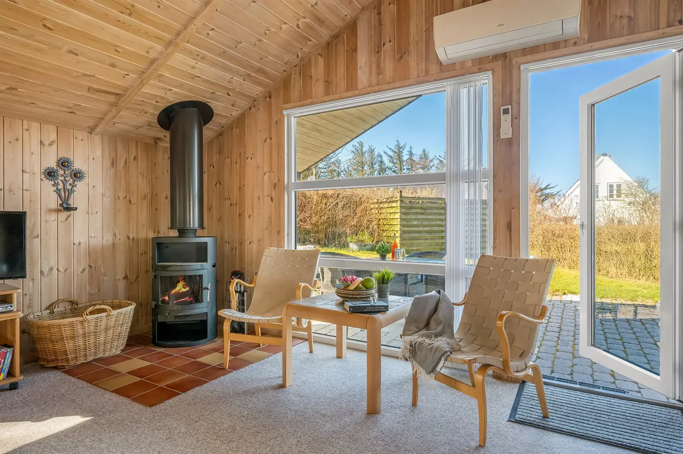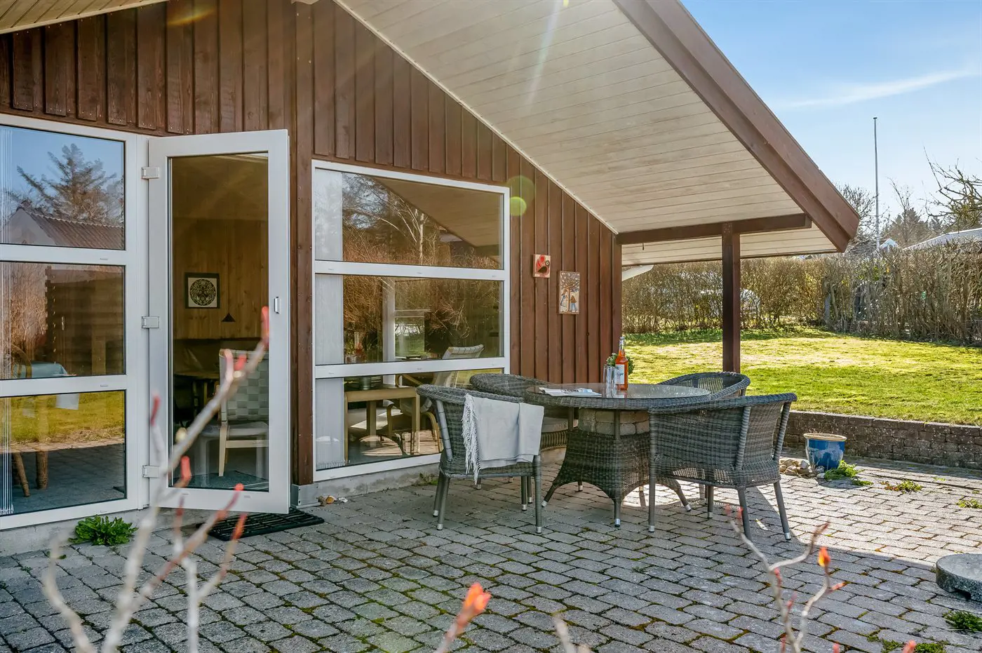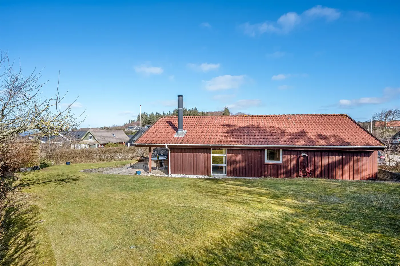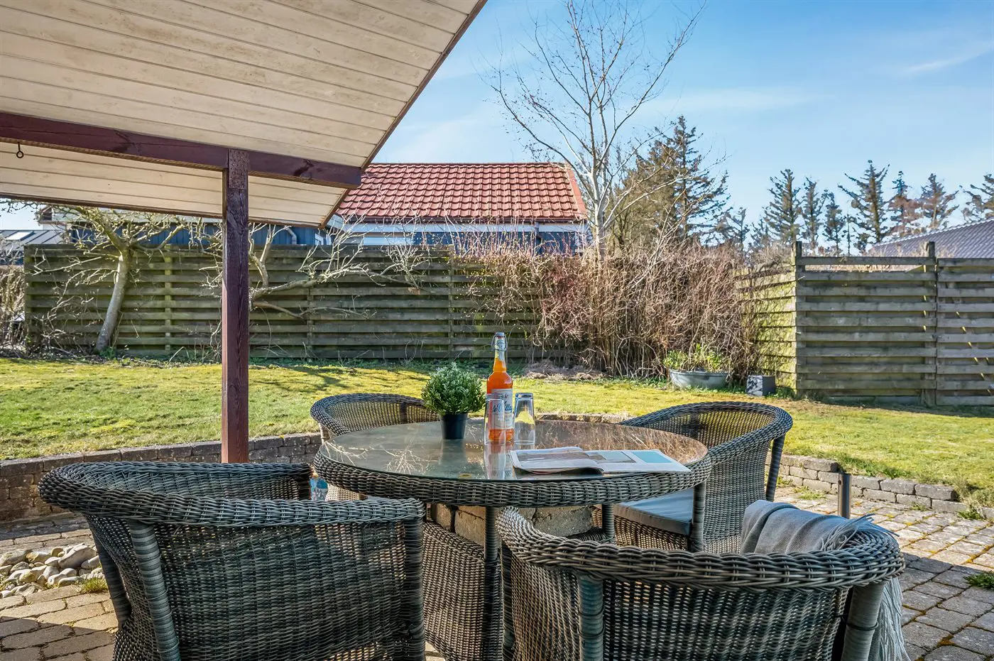 Vom Wohnzimmer aus hast du Zugang zu einer schönen Terrasse, auf der du morgens den Kaffee genießen kannst, an warmen Sommerabenden grillen oder einfach in der Sonne entspannen kannst. Das Grundstück liegt ungestört und bietet gute Möglichkeiten sowohl zum Spielen als auch zum Entspannen an.