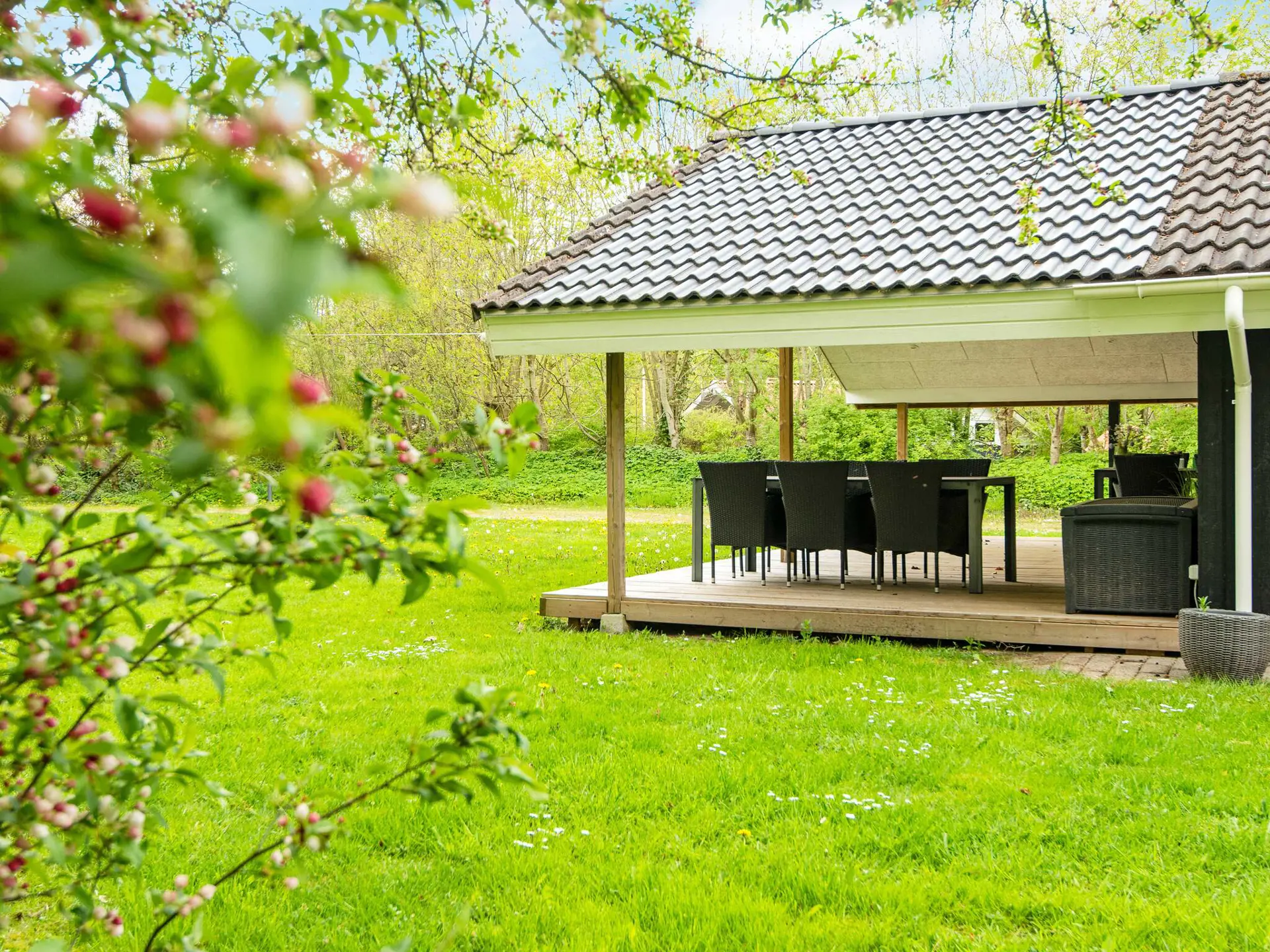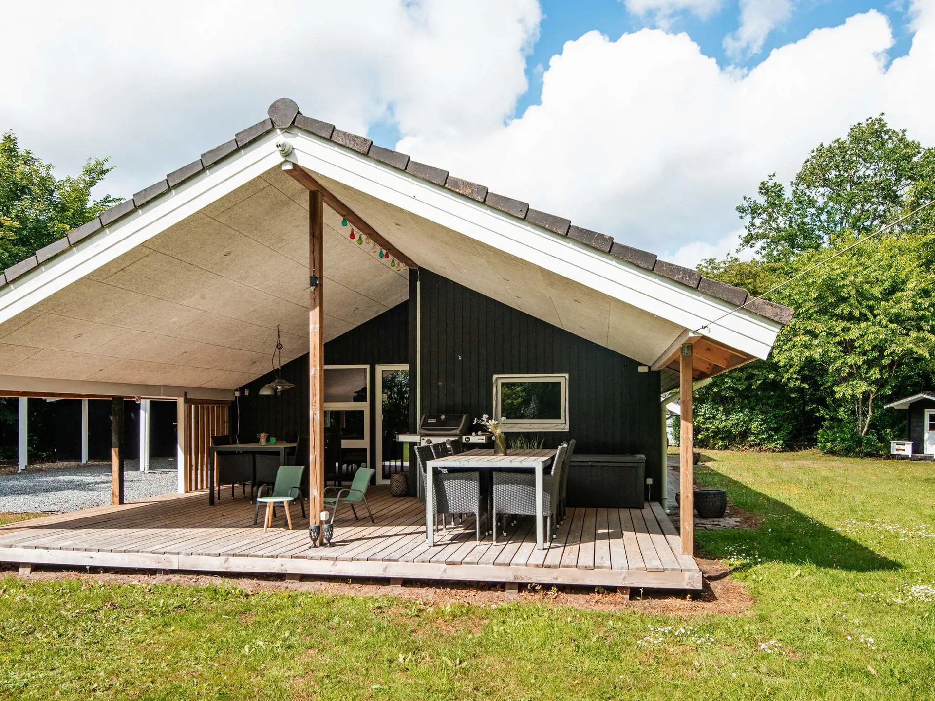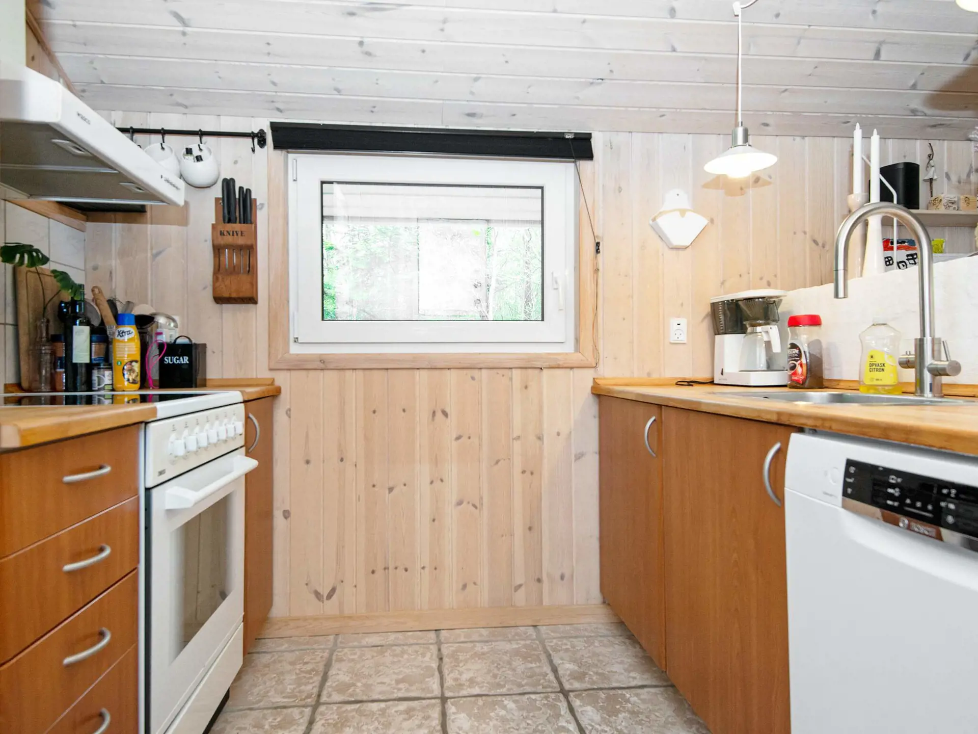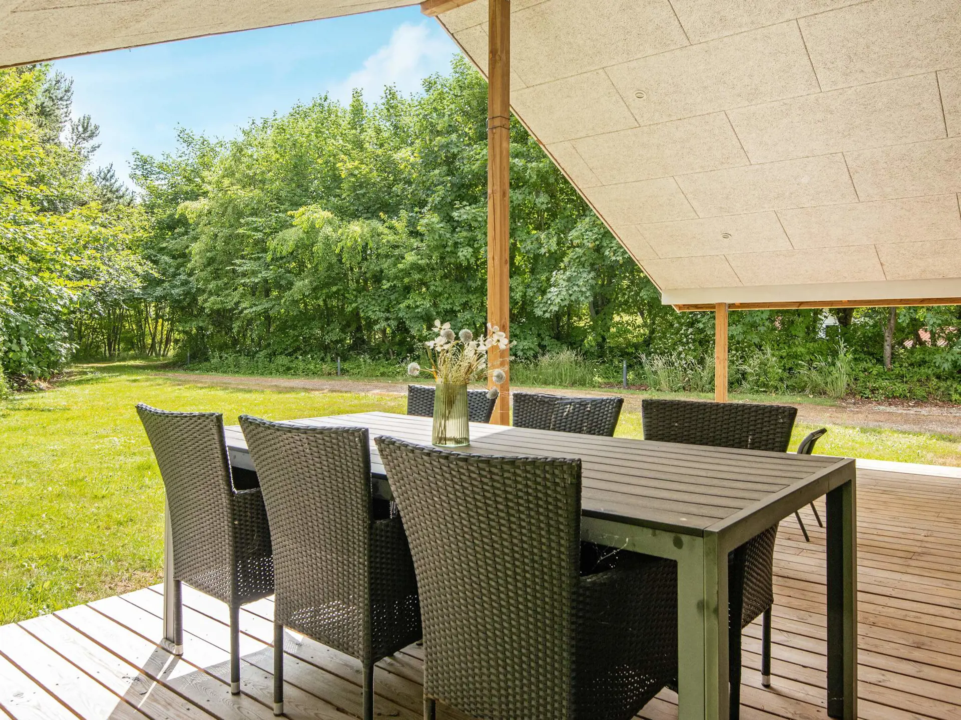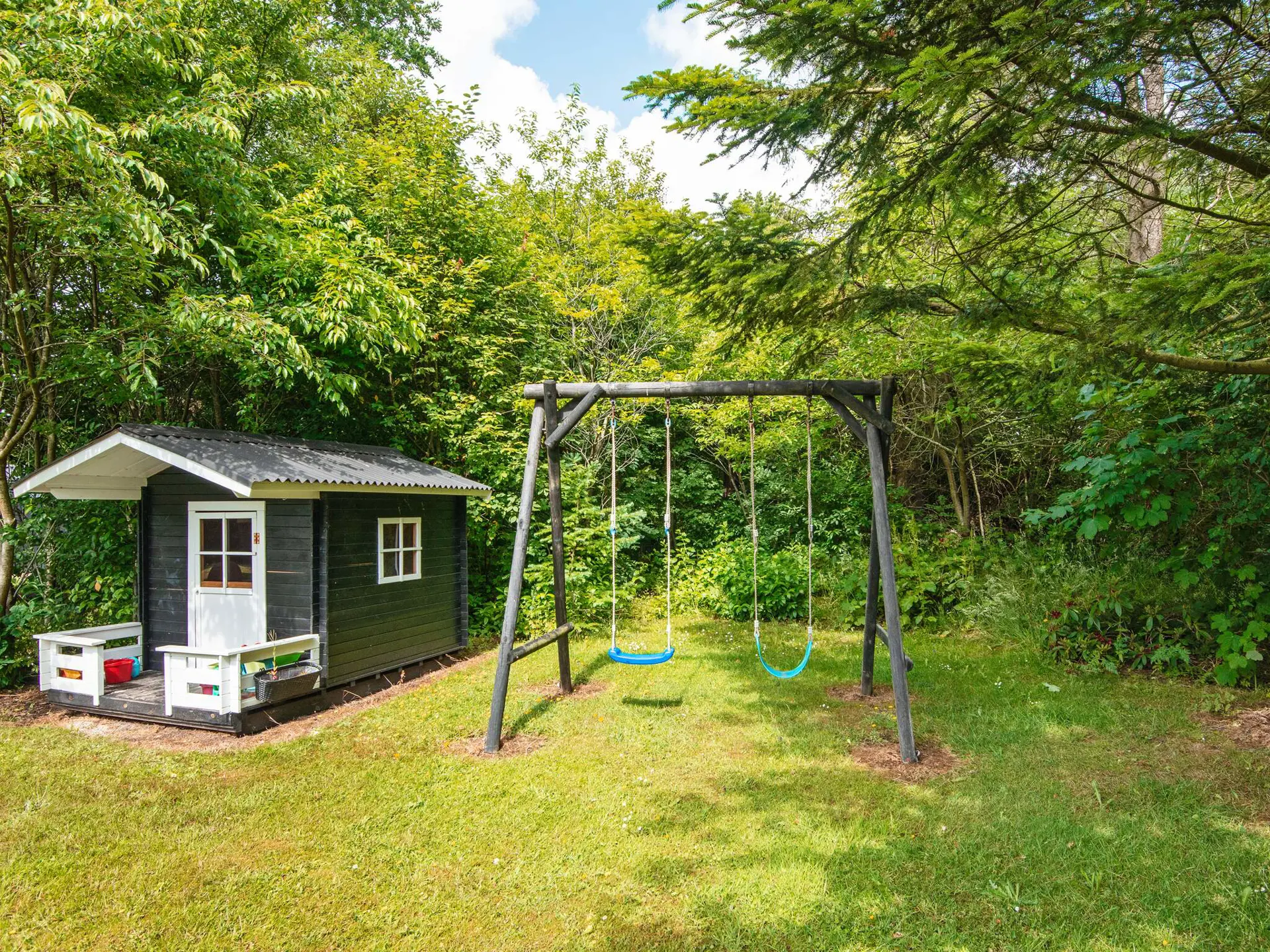 Ringsum das Ferienhaus findet man mehrere Terrassenflächen, auf denen man die Sonnentage sowie die schöne Natur von den guten Gartenmöbeln und Sonnenliegen aus genießen kann. Vom Wohnbereich, der in hellem, typisch skandinavischem Stil eingerichtet ist, haben Sie direkten Zugang zu einer überdachten Terrasse. Für Kinder stehen diverse Spielgeräte bereit, darunter Gartentrampolin (Nutzung nur auf eigenes Risiko), Spielehäuschen, Schaukel und Sandkasten.