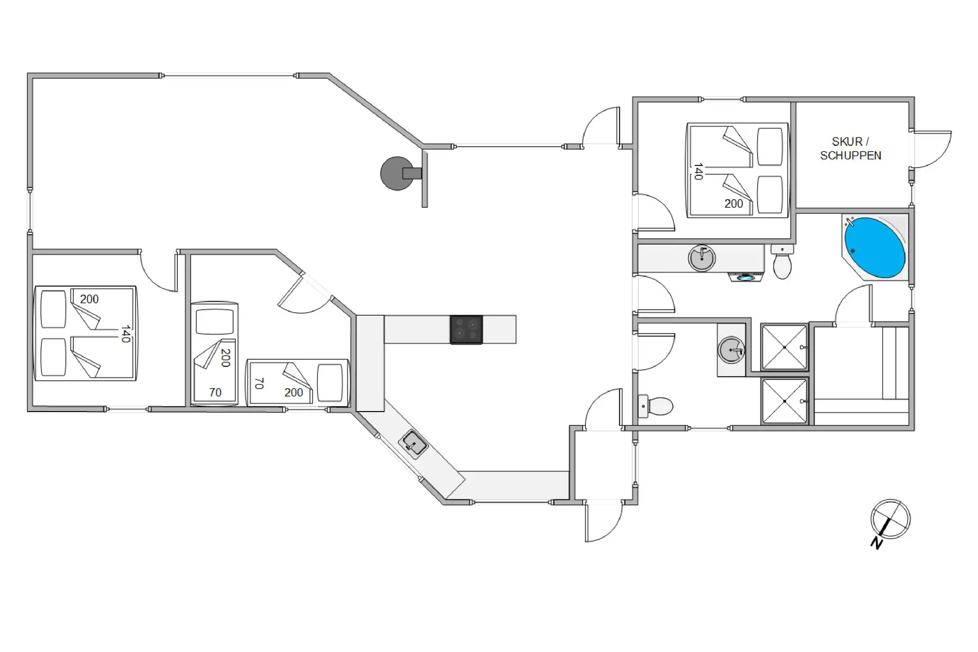 Die gut ausgestattete, offene Küche ist mit einer praktischen Spülmaschine versehen und bietet dir alles, was du für die Zubereitung leckerer Mahlzeiten benötigst. Das Ferienhaus verfügt über 2 praktische Bäder, sodass ihr euch gut aufteilen könnt. Das größere Badezimmer ist mit einer Sauna und einem Whirlpool ausgestattet. Hier könnt ihr ausgiebige Saunagänge oder Bäder im warmen Wasser genießen und die Seele baumeln lassen.