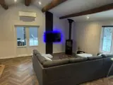 Der Innenbereich des Ferienhauses besticht durch einen stilvollen Wohnbereich mit bequemen Sitzmöbeln, einem Fernseher und einem wärmenden Kaminofen, der für gemütliche Stunden sorgt. Die energiesparende Wärmepumpe garantiert ein angenehmes Raumklima zu jeder Jahreszeit. Macht es euch vorm knisternden Kaminofen gemütlich, schaut einen Film oder lest euer Lieblingsbuch.
