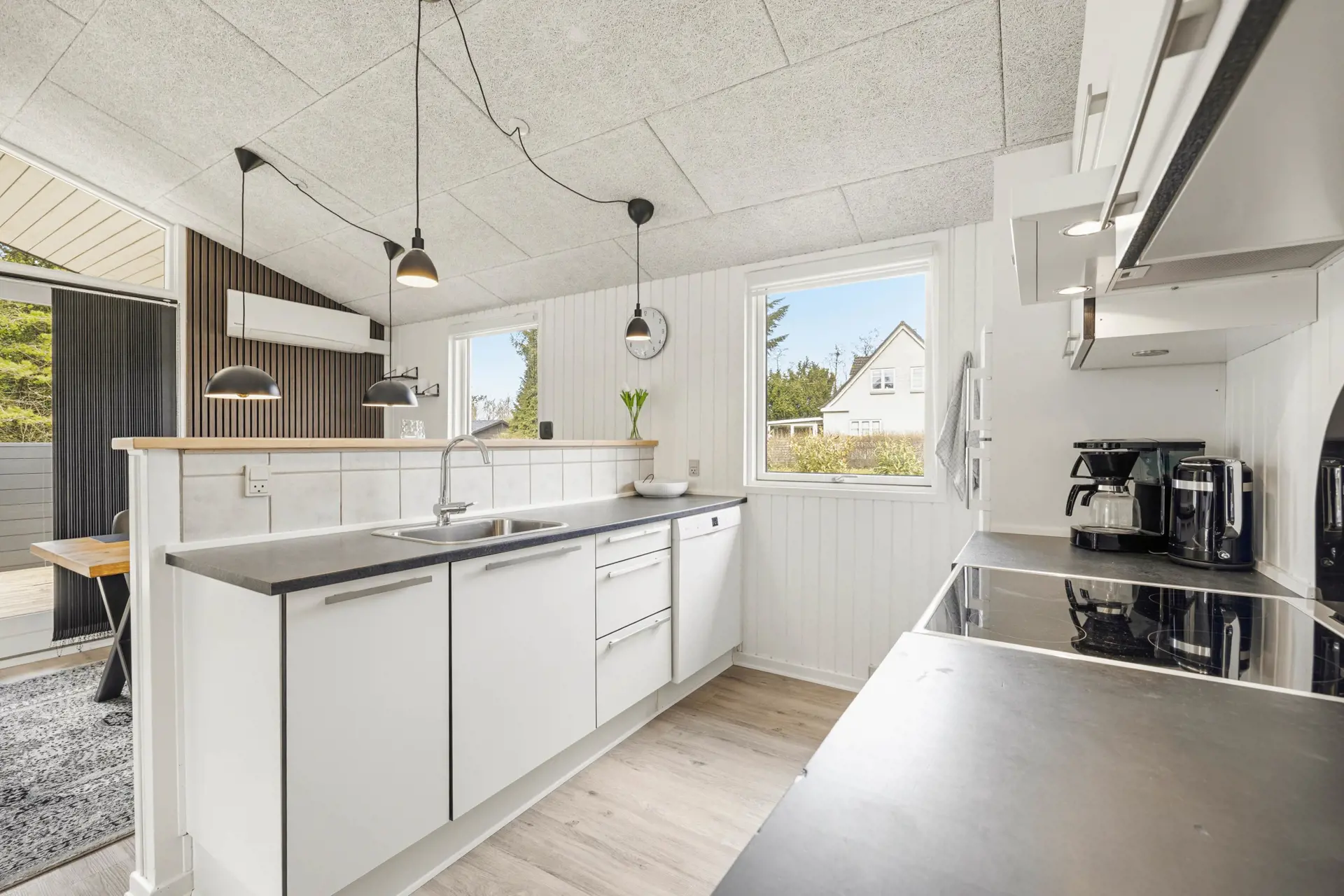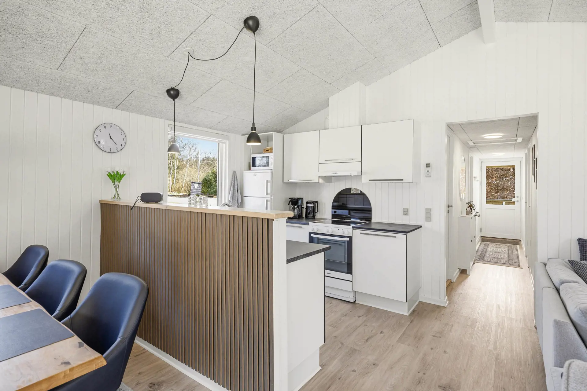 Im Ferienhaus erwartet euch ein einladender Wohnbereich, in dem ihr zusammen abschalten könnt – mit Fernseher für gemütliche Abende und Kaminofen für dieses besondere Knistern, das Urlaubstage noch gemütlicher macht. Für ein angenehmes Raumklima sorgt eine energiesparende Wärmepumpe, die es euch zu jeder Jahreszeit leicht macht, die Temperatur passend einzustellen. In der offenen Küche geht es praktisch weiter: Mit der Spülmaschine bleibt mehr Zeit für Strandpläne.