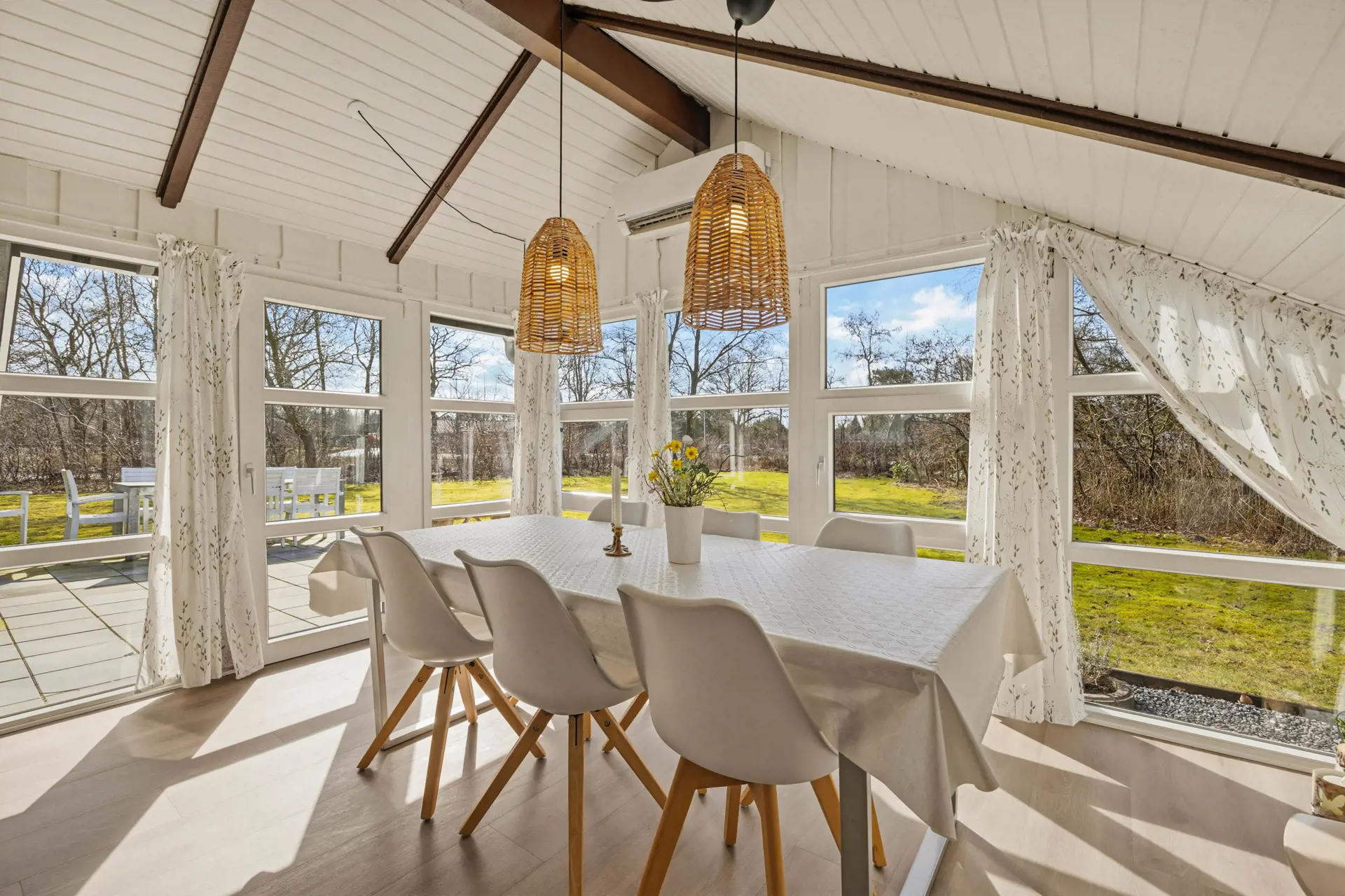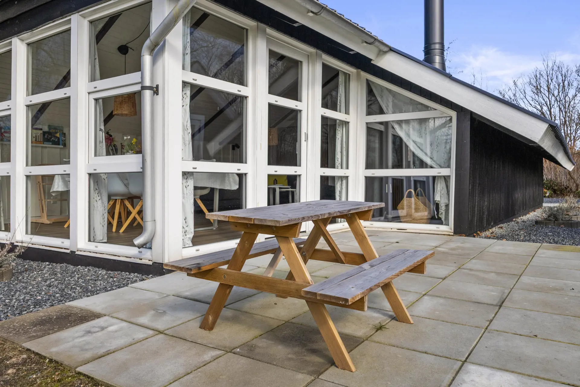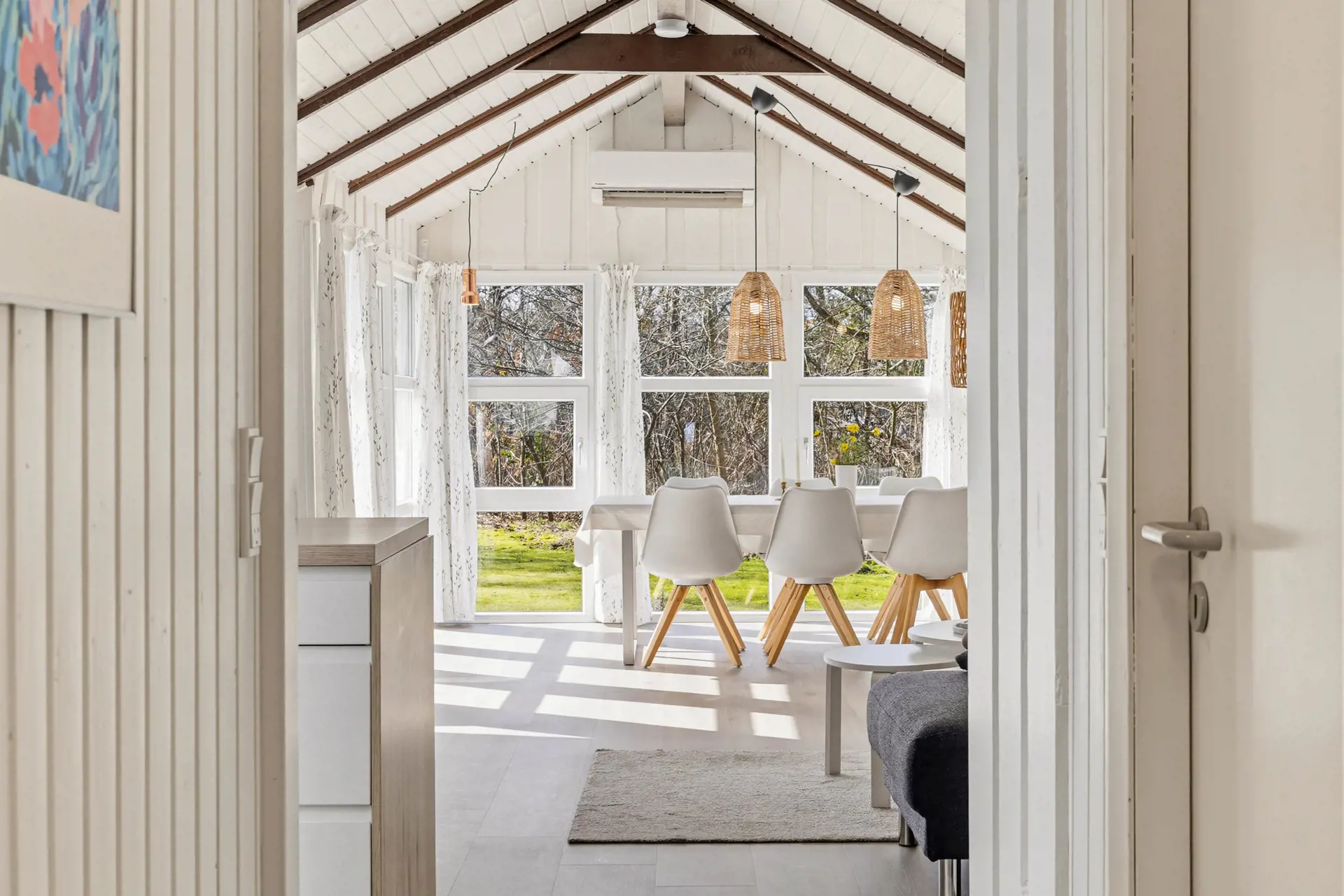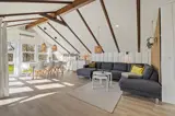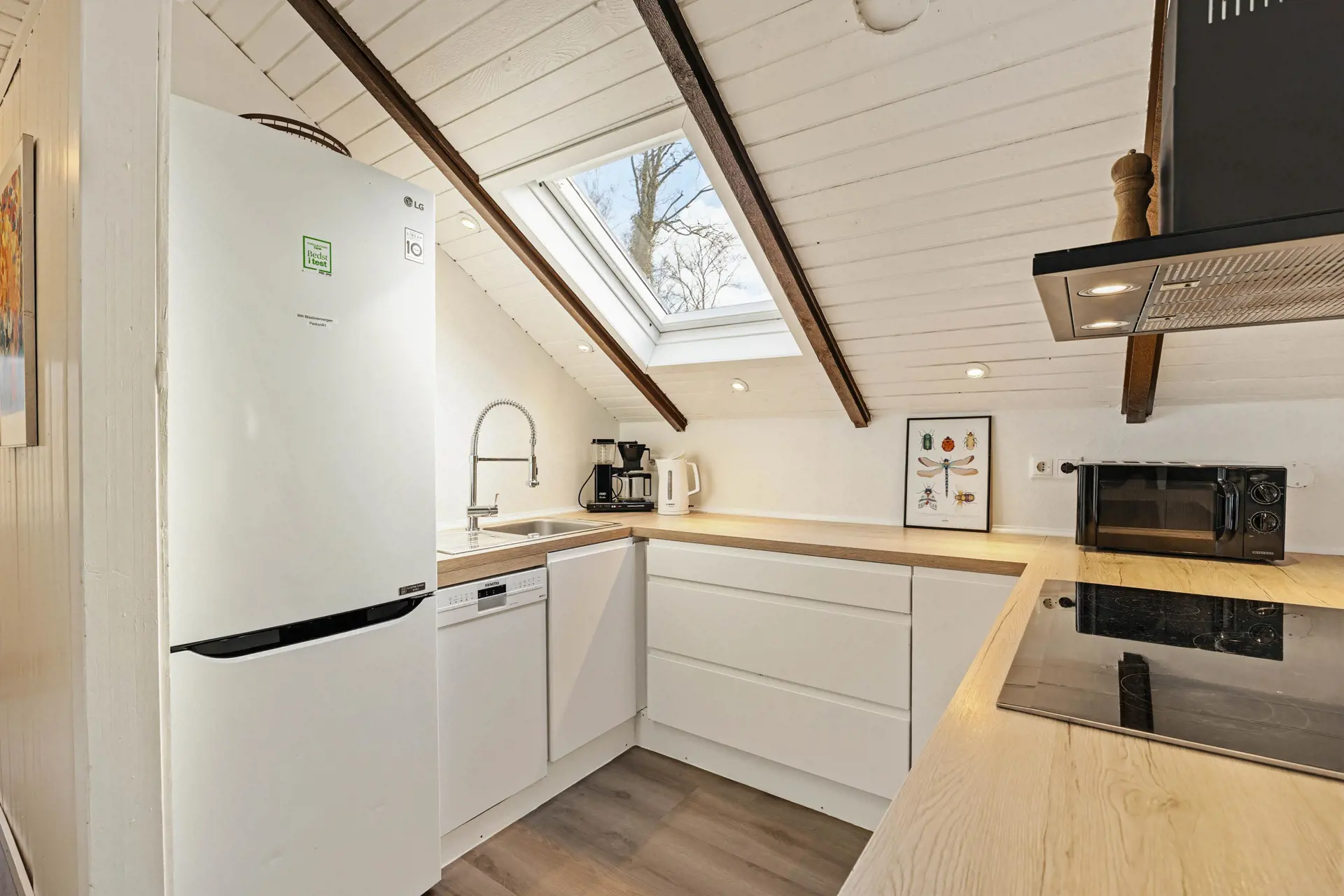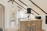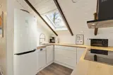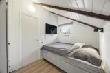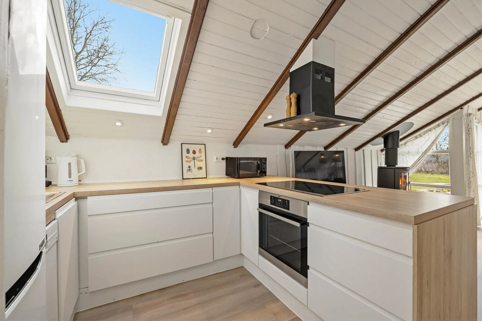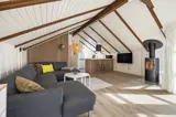 Das Innere des Ferienhauses strahlt typisch dänische Ferienhausstimmung aus. Ein Fernseher sorgt für entspannte Abende auf dem Sofa, und der Kaminofen macht es besonders an kühleren Tagen richtig behaglich. Der offene Wohnbereich vereint Stube, Essplatz und Küche und ist mit charmanten Dachschrägen und einer großen Fensterfront ausgestattet. Mit der energiesparenden Wärmepumpe haltet ihr die Temperatur unkompliziert angenehm.