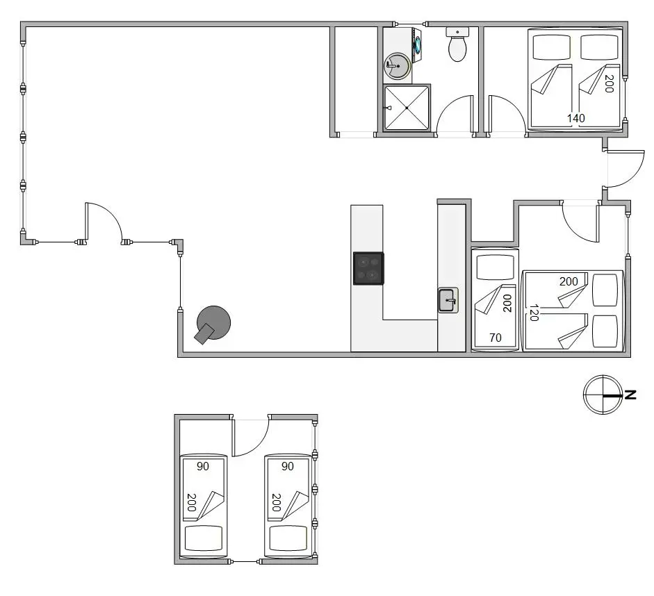 Für die Nacht stehen euch 1 Schlafzimmer mit Doppelbett (140 x 200 cm) zur Verfügung sowie 1 Schlafzimmer mit Doppelbett (120 x 200 cm) und 1 Einzelbett. Zusätzlich findet ihr 2 Einzelbetten im Anbau – perfekt, wenn ihr Schlafenszeiten trennen oder euch ein bisschen mehr Rückzug gönnen möchtet.