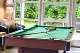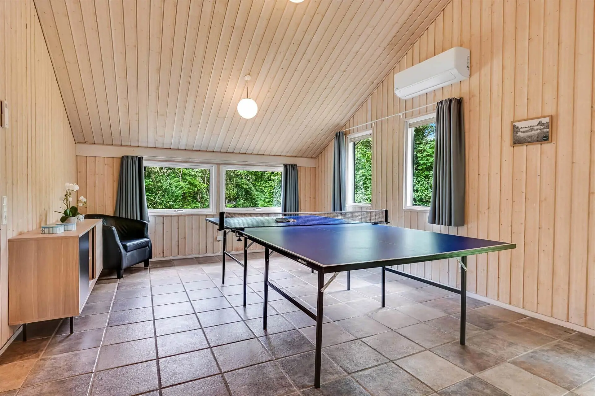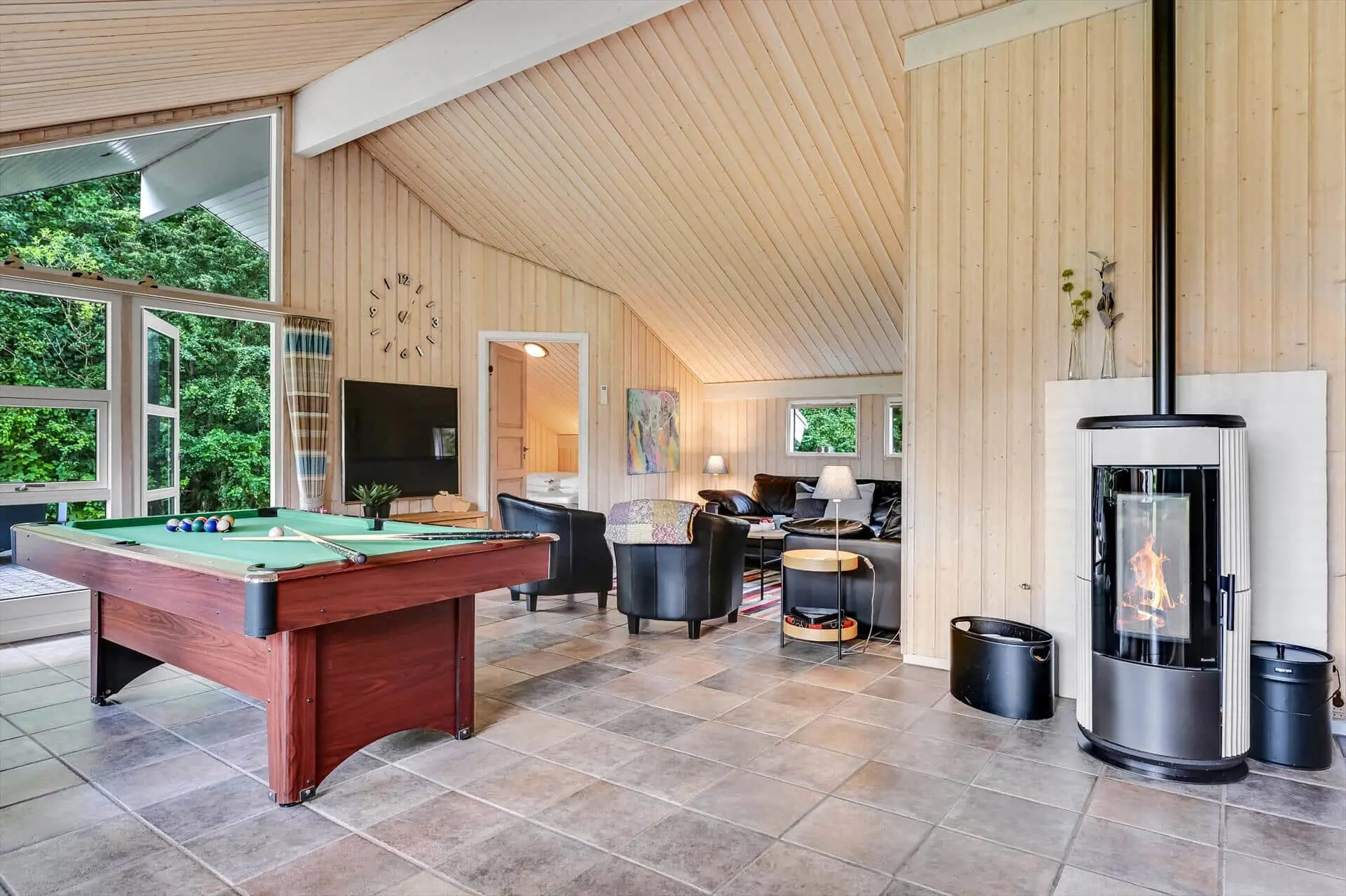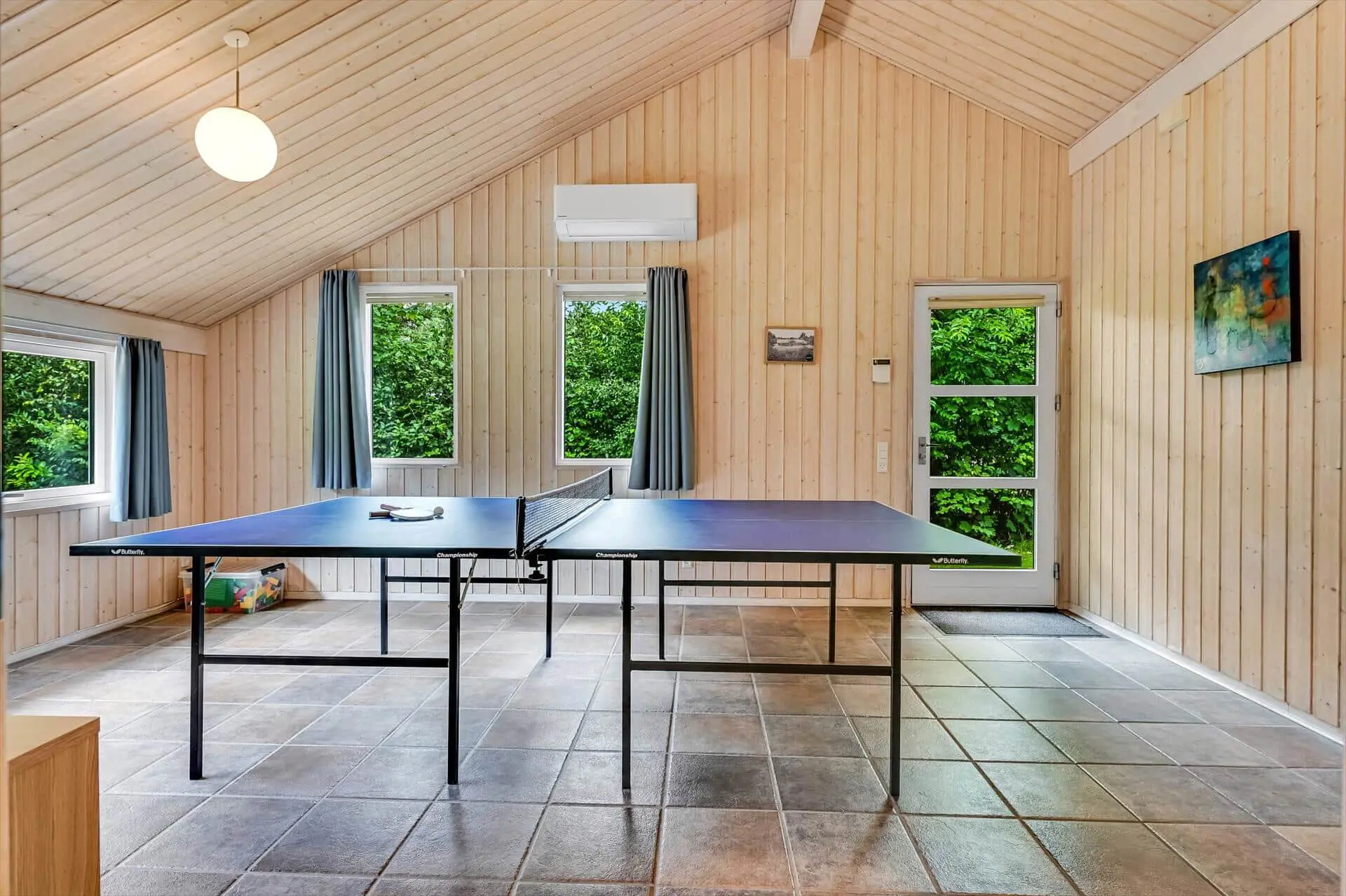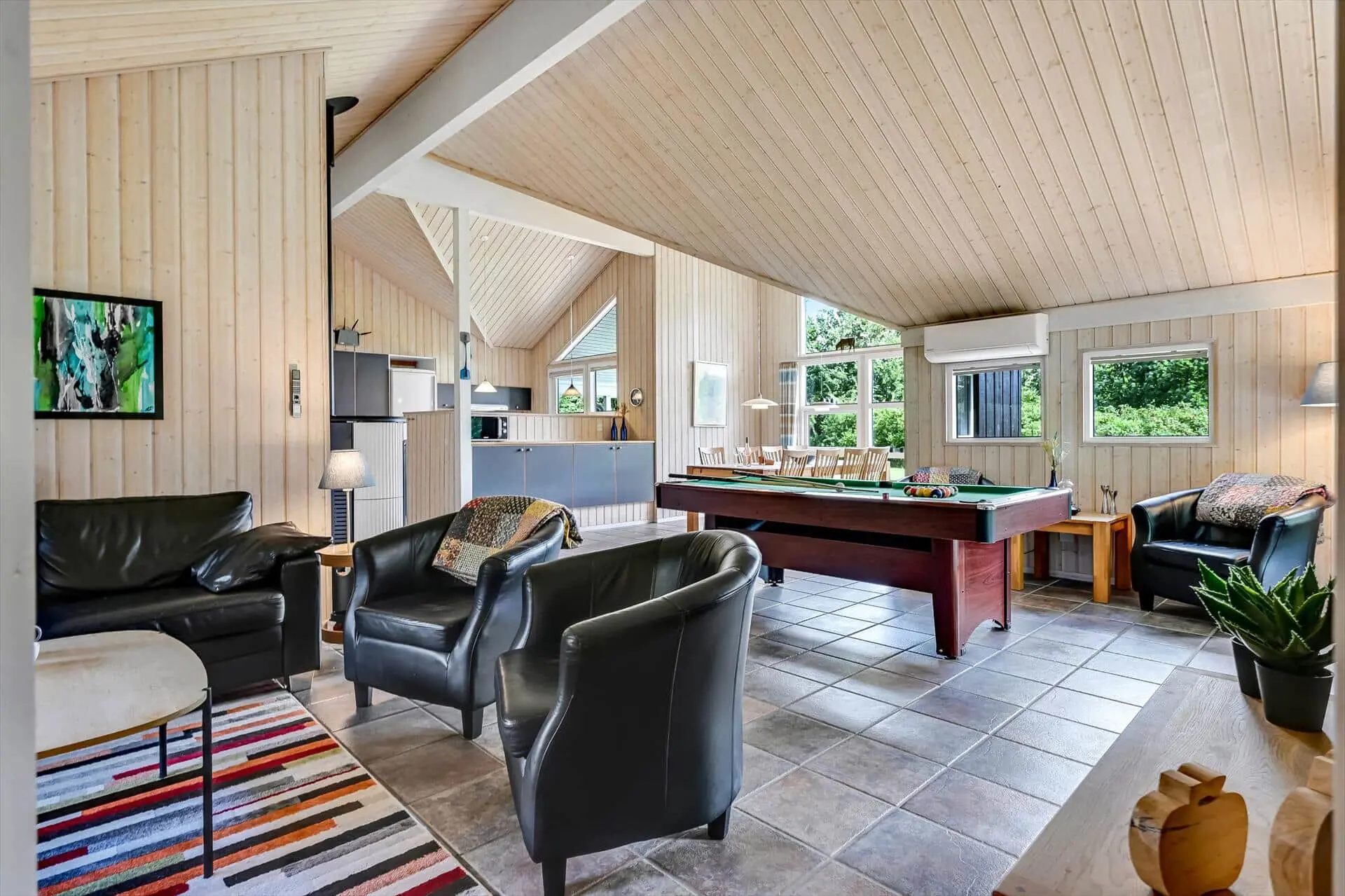 Im Inneren empfängt dich eine warme und einladende Atmosphäre, bei der sowohl Komfort als auch Gemütlichkeit in der Einrichtung berücksichtigt wurden. Im großen Wohnbereich herrscht eine offene Raumgestaltung mit hoher Decke und viel Platz, um gemeinsam Zeit zu verbringen – ob beim Kochen, Spielen oder einfach nur zum Entspannen. Im Wohnzimmer steht ein Billardtisch für freundschaftliche Duelle bereit, und im angrenzenden Aktivitätsraum könnt ihr eine Partie Tischtennis spielen, wenn ihr den Wettbewerb auf die nächste Stufe heben möchtet. Wenn es Zeit für Entspannung ist, laden Whirlpool und Sauna zu purer Selbstverwöhnung ein. Stell dir vor, wie du ins warme Wasser sinkst, während sich Ruhe um dich ausbreitet – oder wie die Wärme der Sauna die letzten Verspannungen deines Körpers löst. Zwei Wärmepumpen und ein Pelletofen sorgen jederzeit für eine angenehme Temperatur, und mit zwei Badezimmern gibt es selbst dann gute Einrichtungen, wenn die ganze Familie zusammenkommt. Hier findest du leicht Ruhe – und kannst trotzdem aktiv sein.