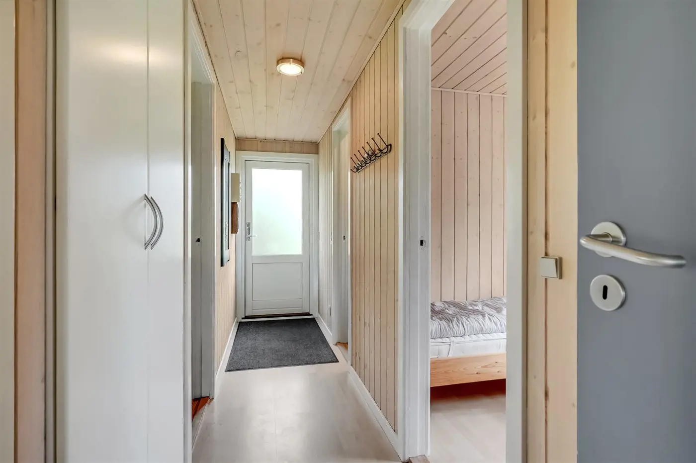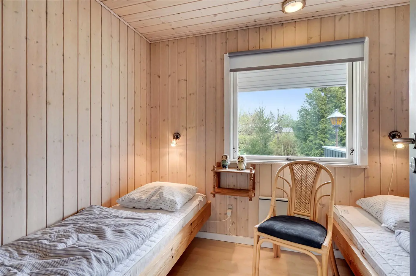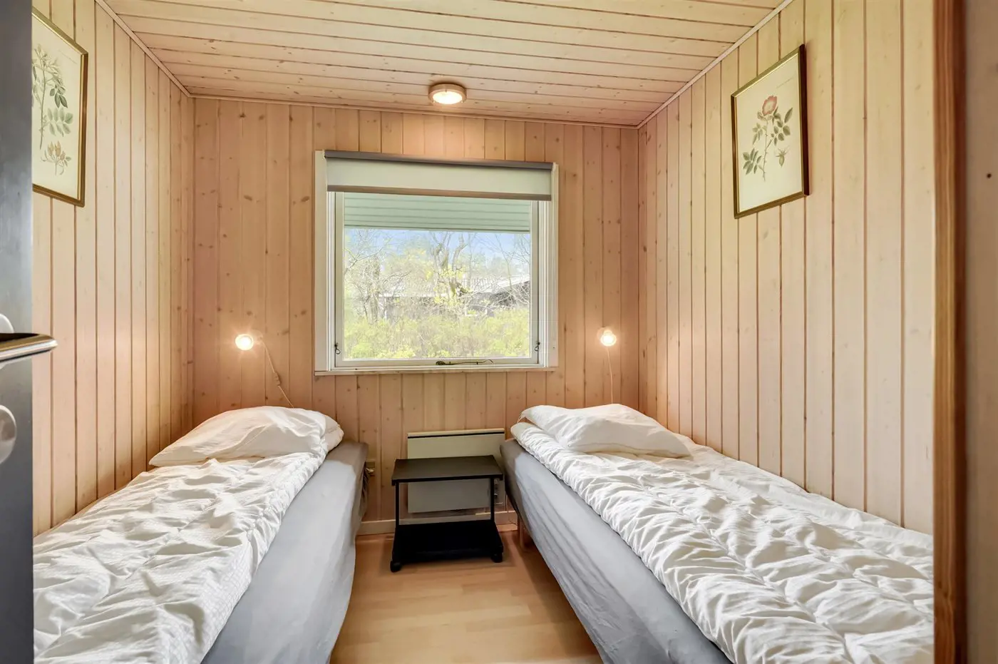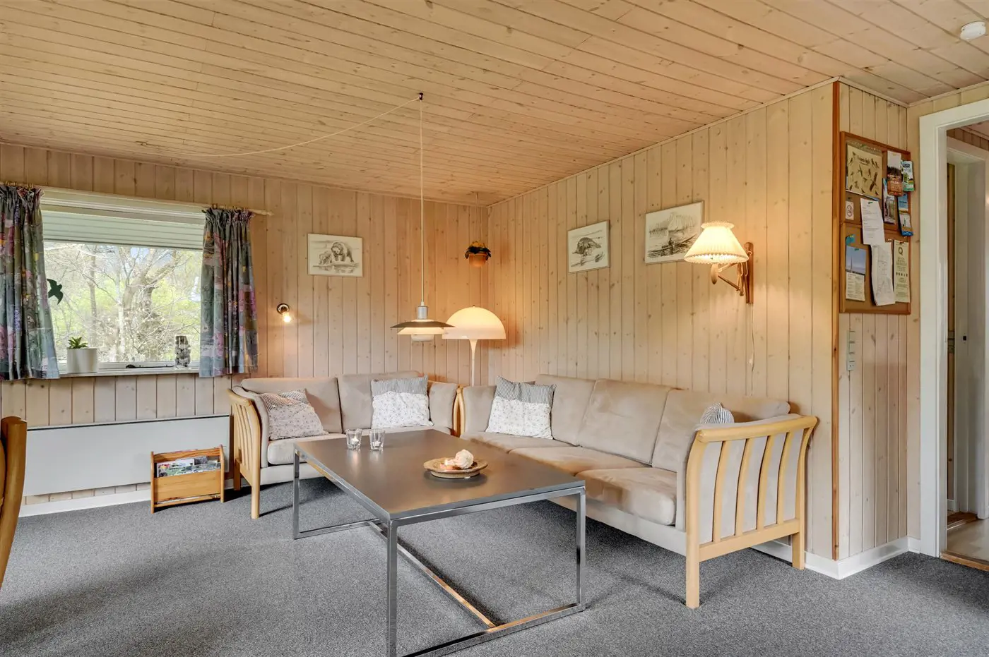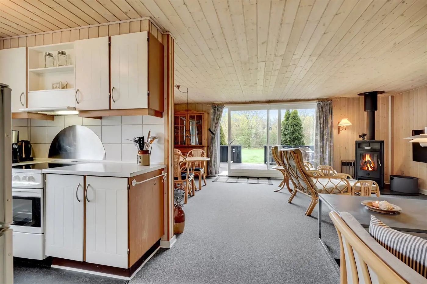 Die Küche des Ferienhauses ist mit dem Wohnzimmer verbunden, wo sich eine große Fensterfront mit Blick auf die Terrasse und den Garten befindet. Von der Fensterfront aus gibt es Zugang zur Terrasse und zum Garten. Neben einem Badezimmer mit Duschnische verfügt das Haus über 3 Schlafzimmer. In einem der Zimmer kann das Bett in zwei Einzelbetten getrennt werden.