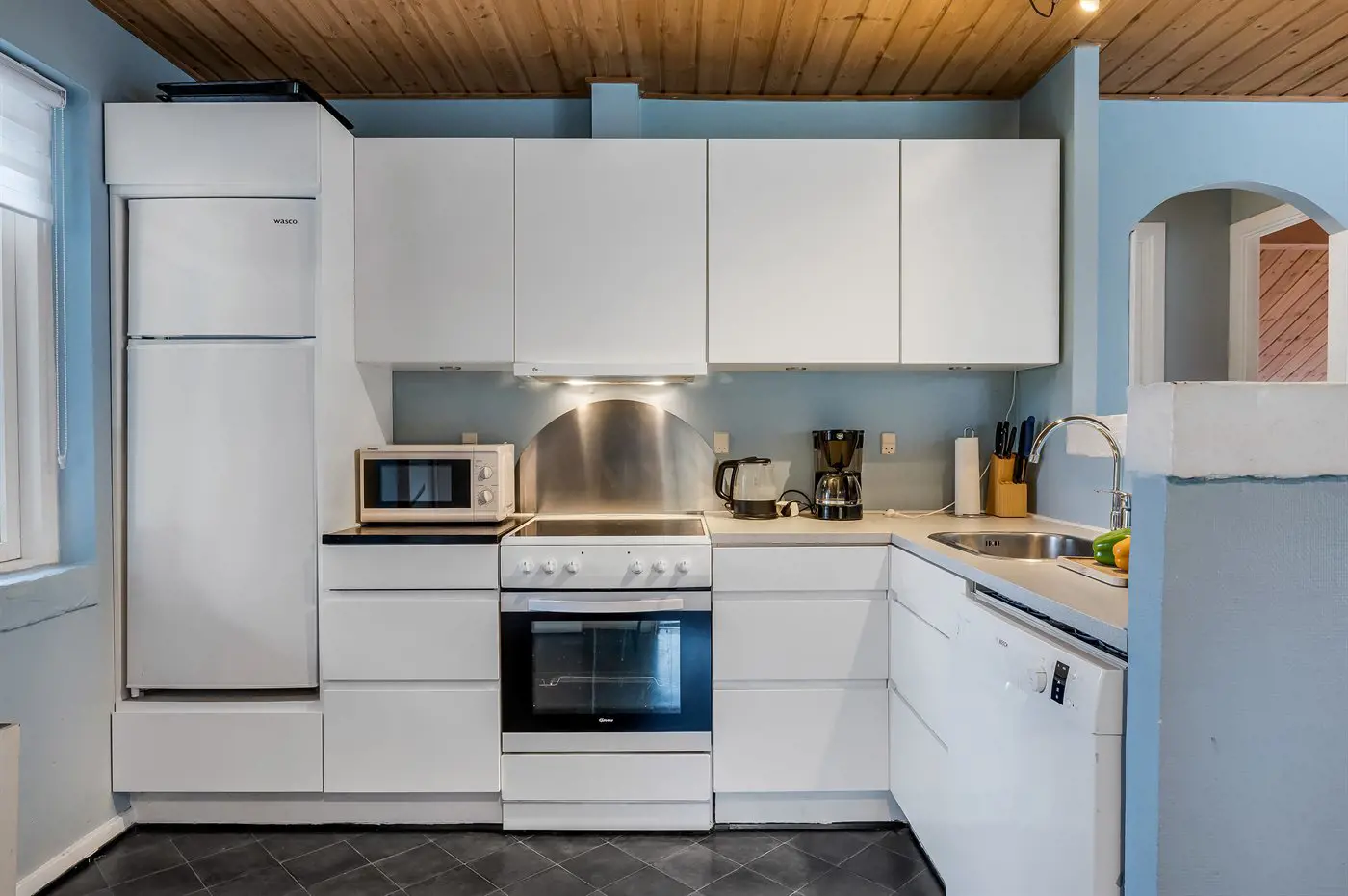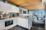 Die Küche ist mit Kühlschrank ausgestattet. Außerdem gibt es 4 Keramik-Kochfelder, Umluftofen, Mikrowelle sowie Geschirrspüler.