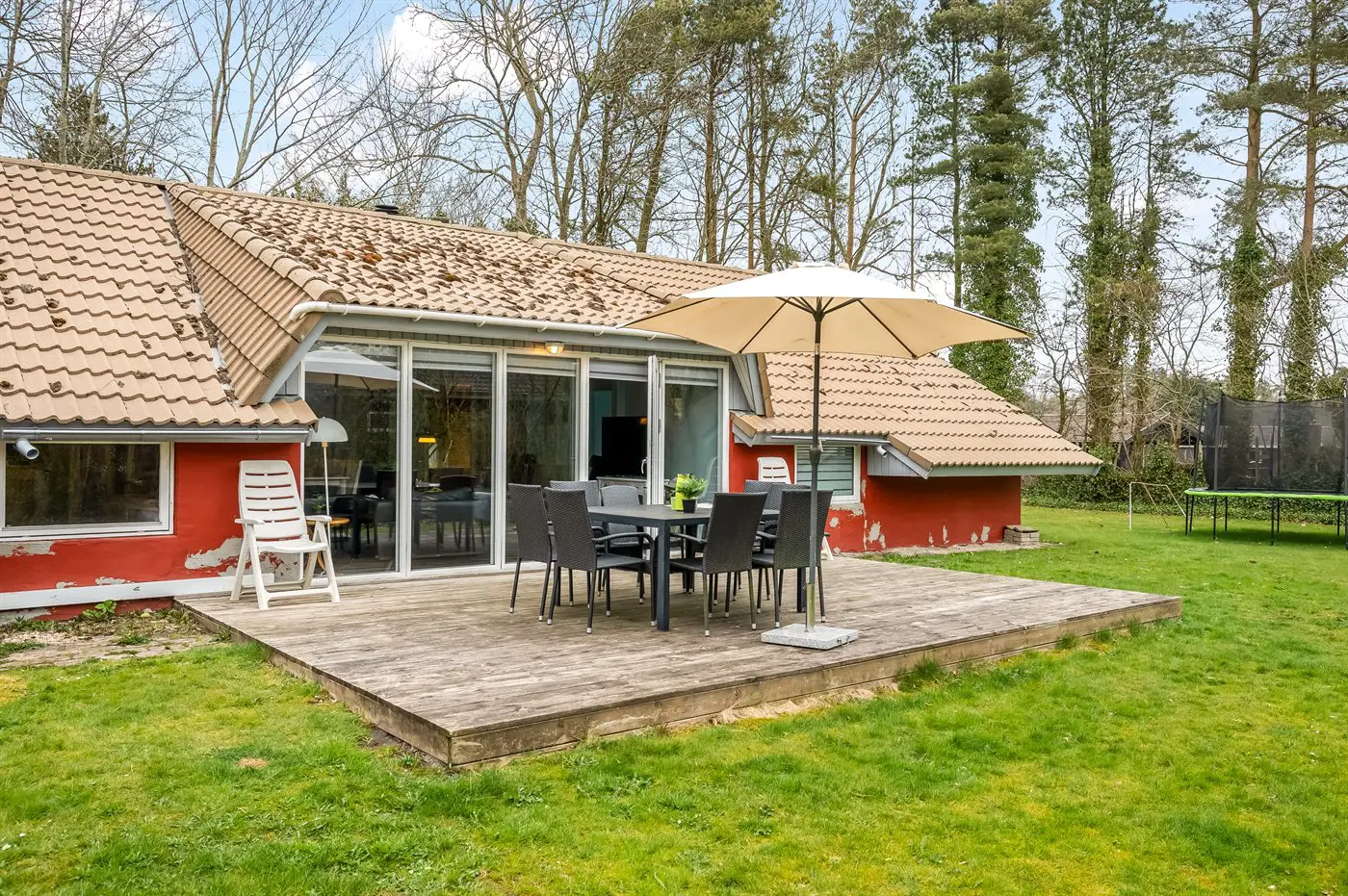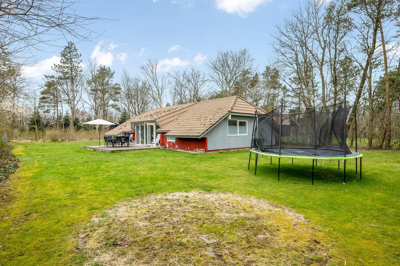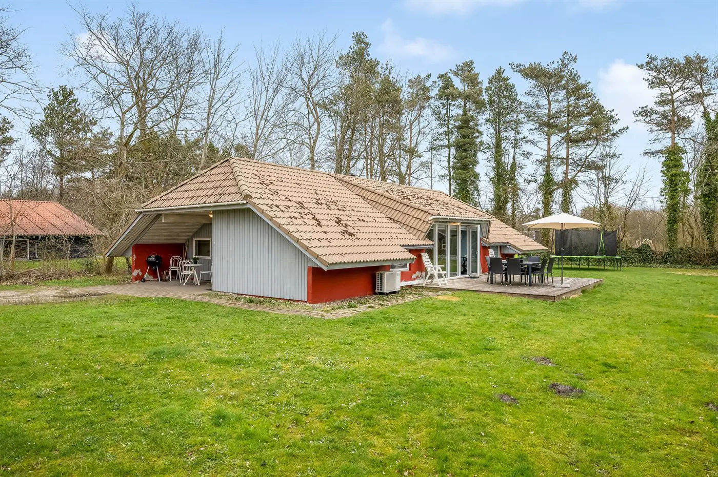 Die Ferienunterkunft liegt auf einem 1579 m² großen Naturgrundstück. Die Entfernung zum Meer beträgt 10000 m. Die Entfernung zu einem See beträgt 200 m. Die nächste Einkaufsmöglichkeit liegt 5000 m entfernt. Es steht ein offenes Terrassenareal zur Verfügung. Schaukel. Sandkasten. Trampolin. Spielturm. Rutsche. Die Entfernung zu einem Spielplatz beträgt 400 m. Es steht ein Grill zur Verfügung. Parkplatz auf dem Grundstück.