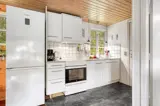 Die Küche ist mit Kühlschrank ausgestattet. Außerdem gibt es 4 Keramik-Kochfelder, Umluftofen.