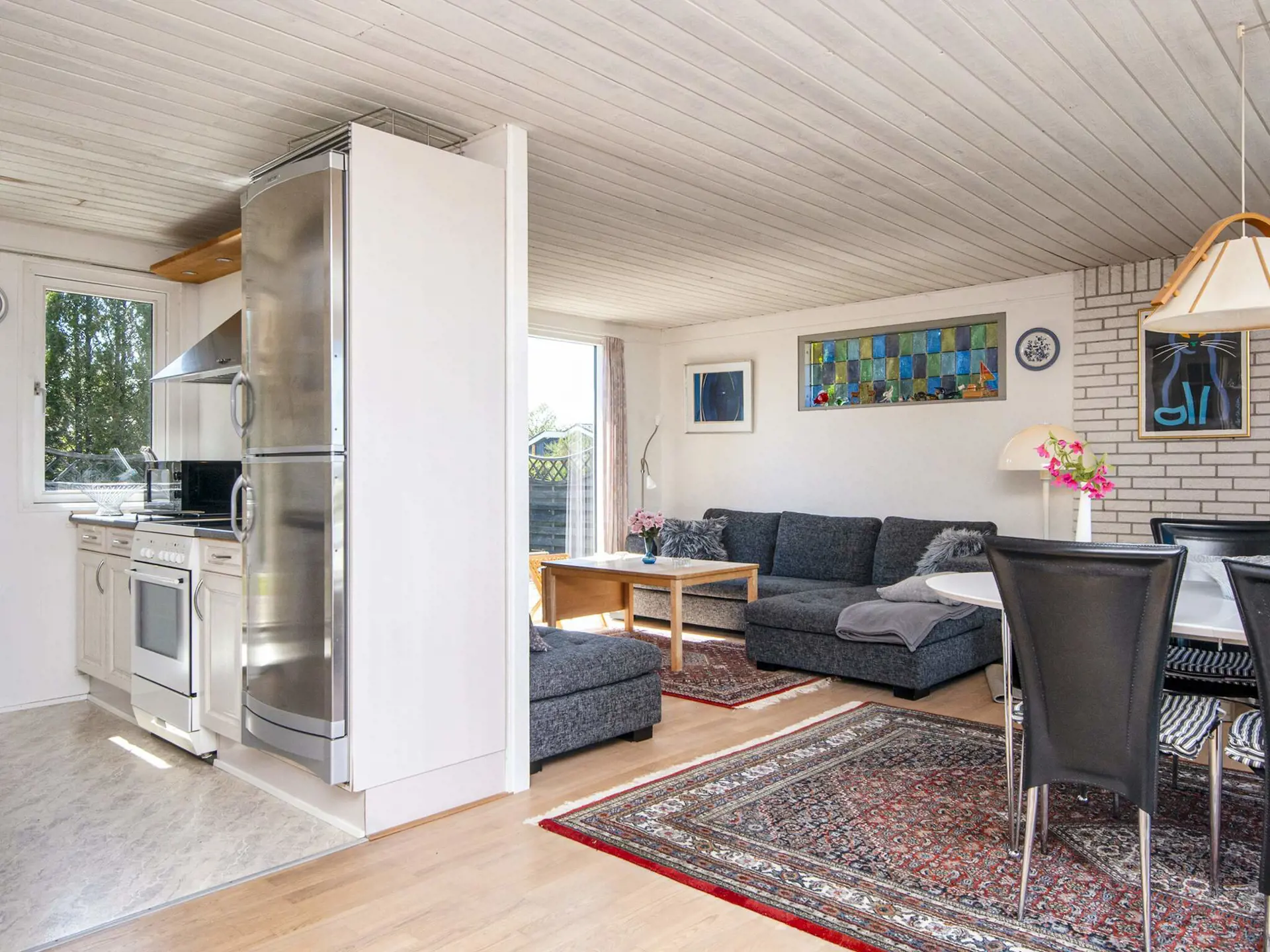 Das Ferienhaus ist mit einem geräumigen Küchen-/Wohnbereich für das Familienleben ausgestattet, inklusive Essecke und Holzofen. Die Kücheneinrichtung ist umfassend. Es stehen auch drei Schlafzimmer mit jeweils einem Doppelbett zur Verfügung.