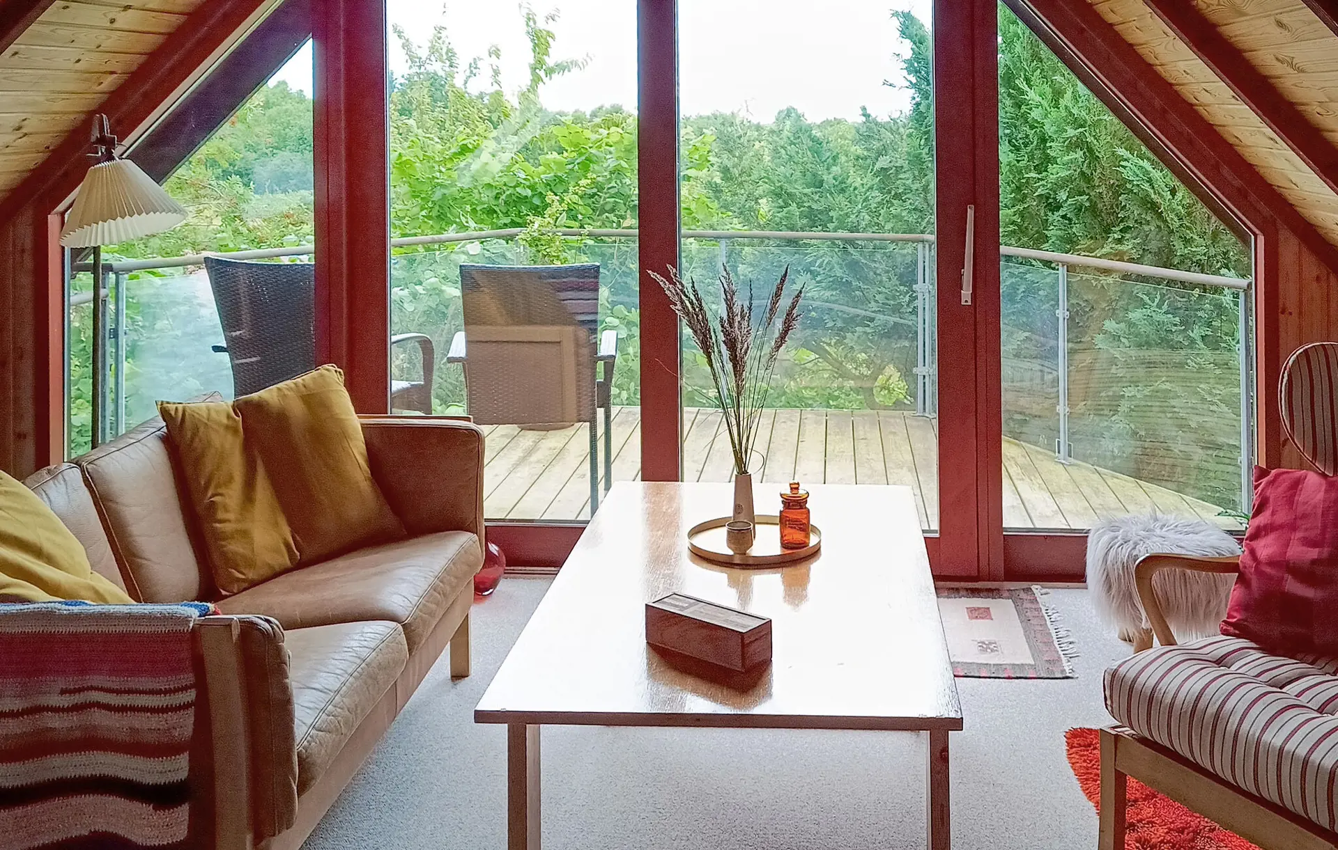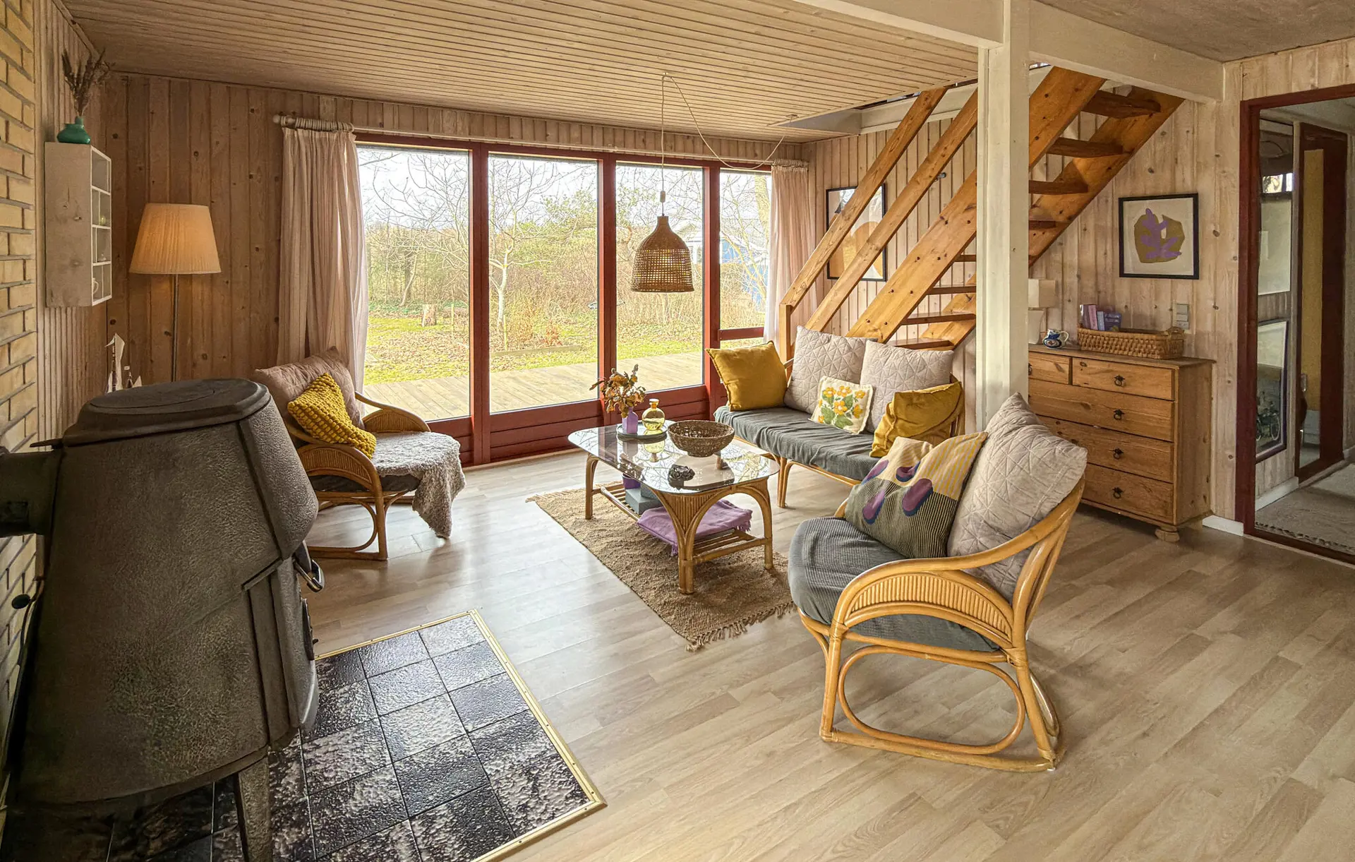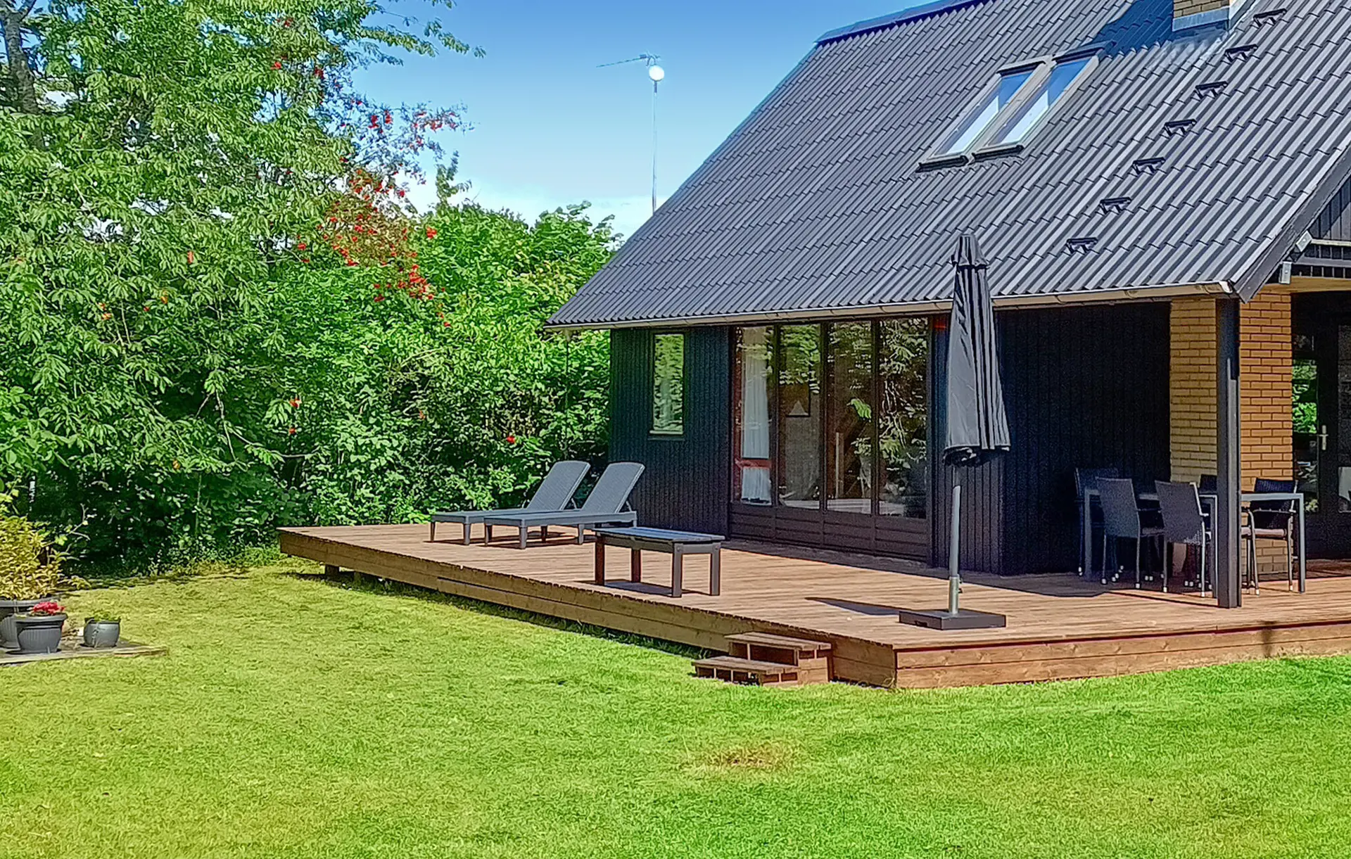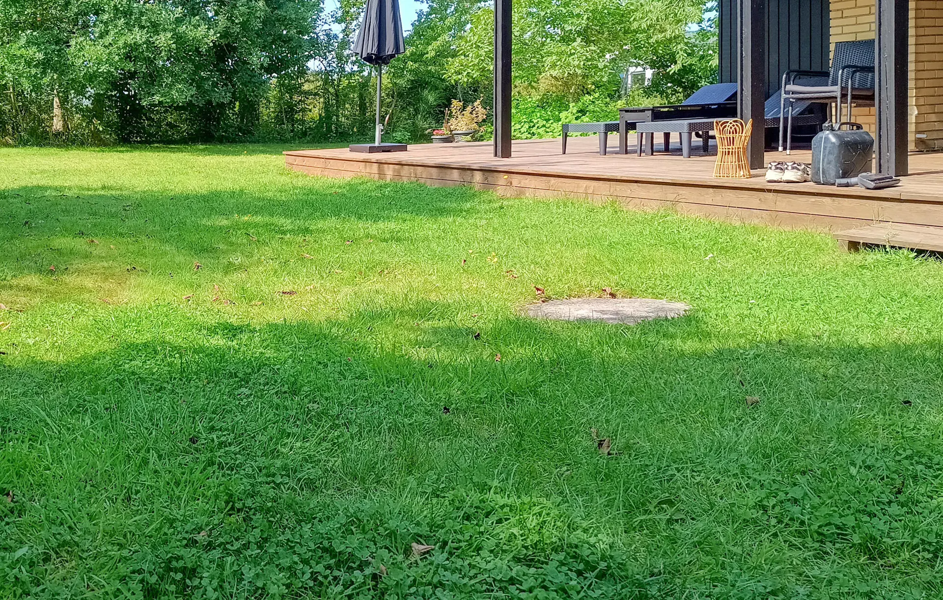 Öffnen Sie die Terrassentüren und treten Sie hinaus auf die überdachte Holzterrasse. Verbringen Sie hier Ihre Mahlzeiten im Freien oder genießen Sie die frische Luft zu jeder Tageszeit. Das von Grün umgebene Grundstück bietet Raum zum Spielen und Erholen. Verweilen Sie draußen und lassen Sie die Ruhe der Umgebung auf sich wirken.