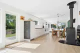 Das helle Wohnzimmer und die Küche sind natürlich verbunden und öffnen sich zur großen Holzterrasse, auf der Sie den ganzen Tag Sonne oder Schatten genießen können. Eines der Schlafzimmer hat direkten Zugang zur Terrasse, und der Anbau bietet flexible Möglichkeiten für Gäste oder größere Familien.
