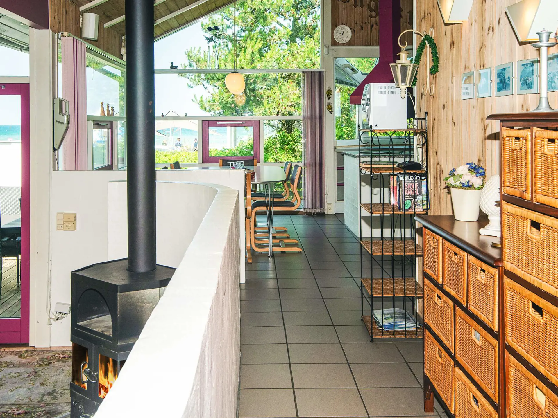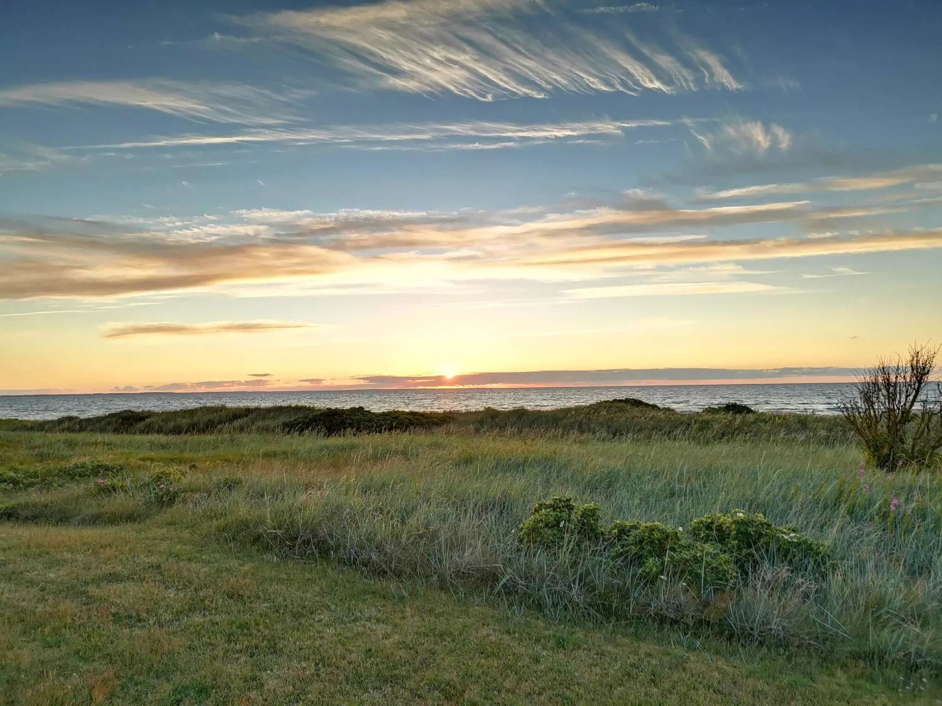 Holzferienhaus mit schöner Panoramaaussicht zum Fjellerup Strand. Die Aussicht lässt sich am besten vom Esstisch im offenen Küchen-/Wohnbereich genießen.