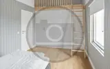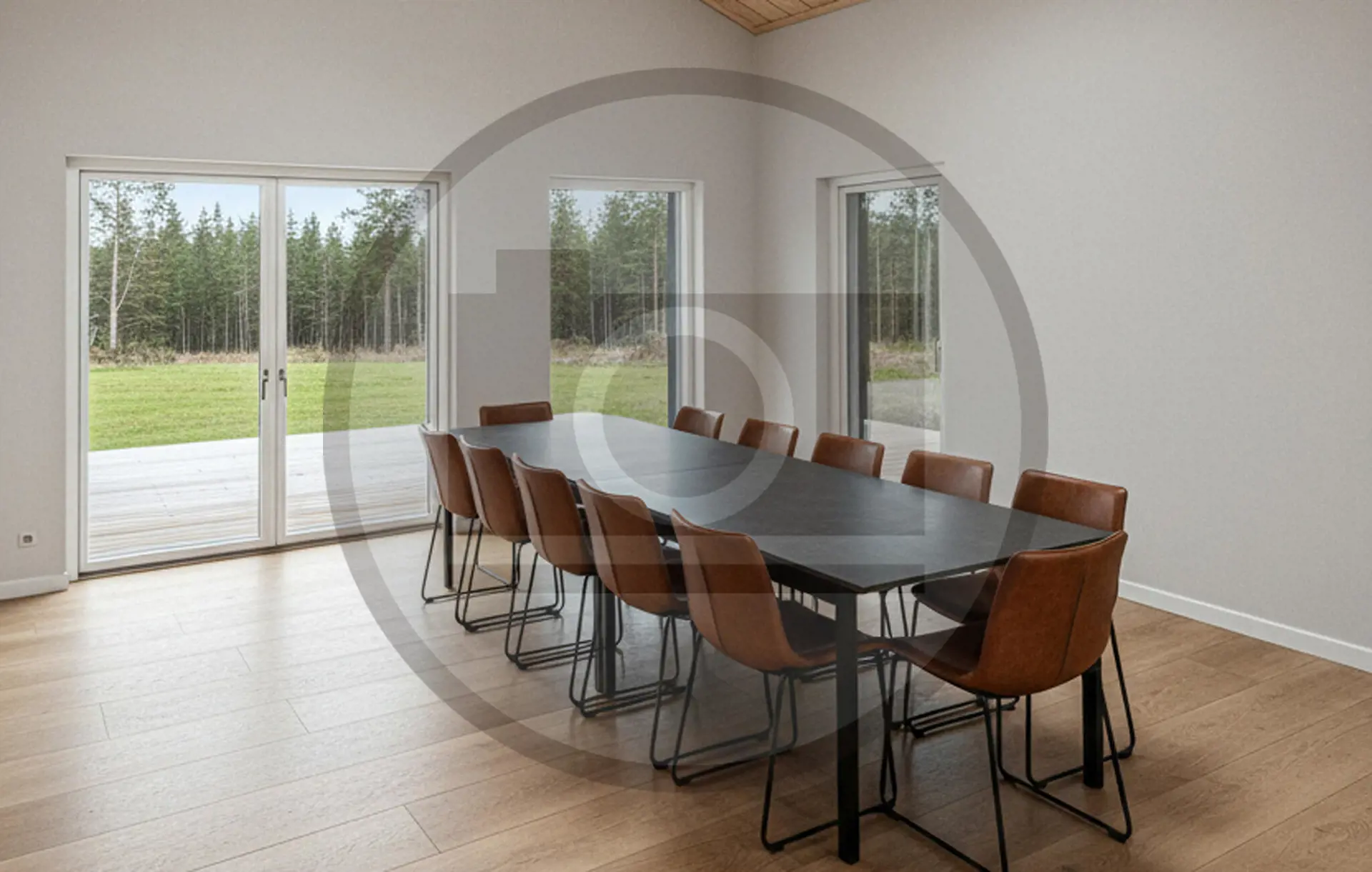 Treten Sie durch die Terrassentüren ins Freie und nutzen Sie die überdachte Holzterrasse für Mahlzeiten an der frischen Luft. Das Grundstück ist von Grünflächen umgeben und bietet Platz zum Spielen oder Ausruhen. Genießen Sie ruhige Stunden im Freien und lassen Sie den Tag mit Blick in die Natur ausklingen.