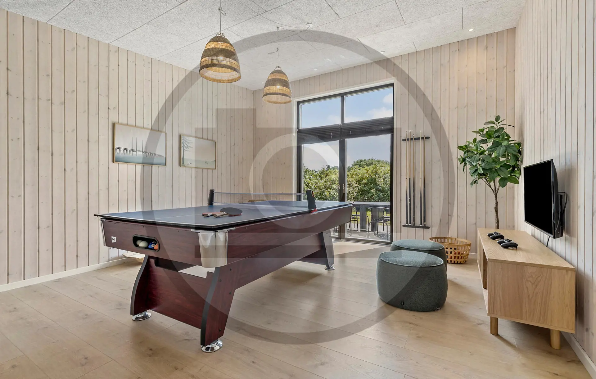 Betreten Sie das Haus und erleben Sie den großzügigen Wohnraum mit weiten Fensterfronten, die für viel Tageslicht sorgen und den Blick in den Garten freigeben. Machen Sie es sich auf dem großen Sofa bequem und genießen Sie gemeinsame Filmabende oder ruhige Lesestunden. Nutzen Sie den langen Esstisch als zentralen Treffpunkt für Mahlzeiten und Gespräche. Die offen integrierte Küche mit Kochinsel bietet Ihnen moderne Geräte und ausreichend Arbeitsfläche, sodass Sie Ihre Gerichte bequem gemeinsam zubereiten können. Gönnen Sie sich danach eine Auszeit im Whirlpool und in der Sauna oder fordern Sie Ihre Mitreisenden zu einer Partie Tischtennis heraus.