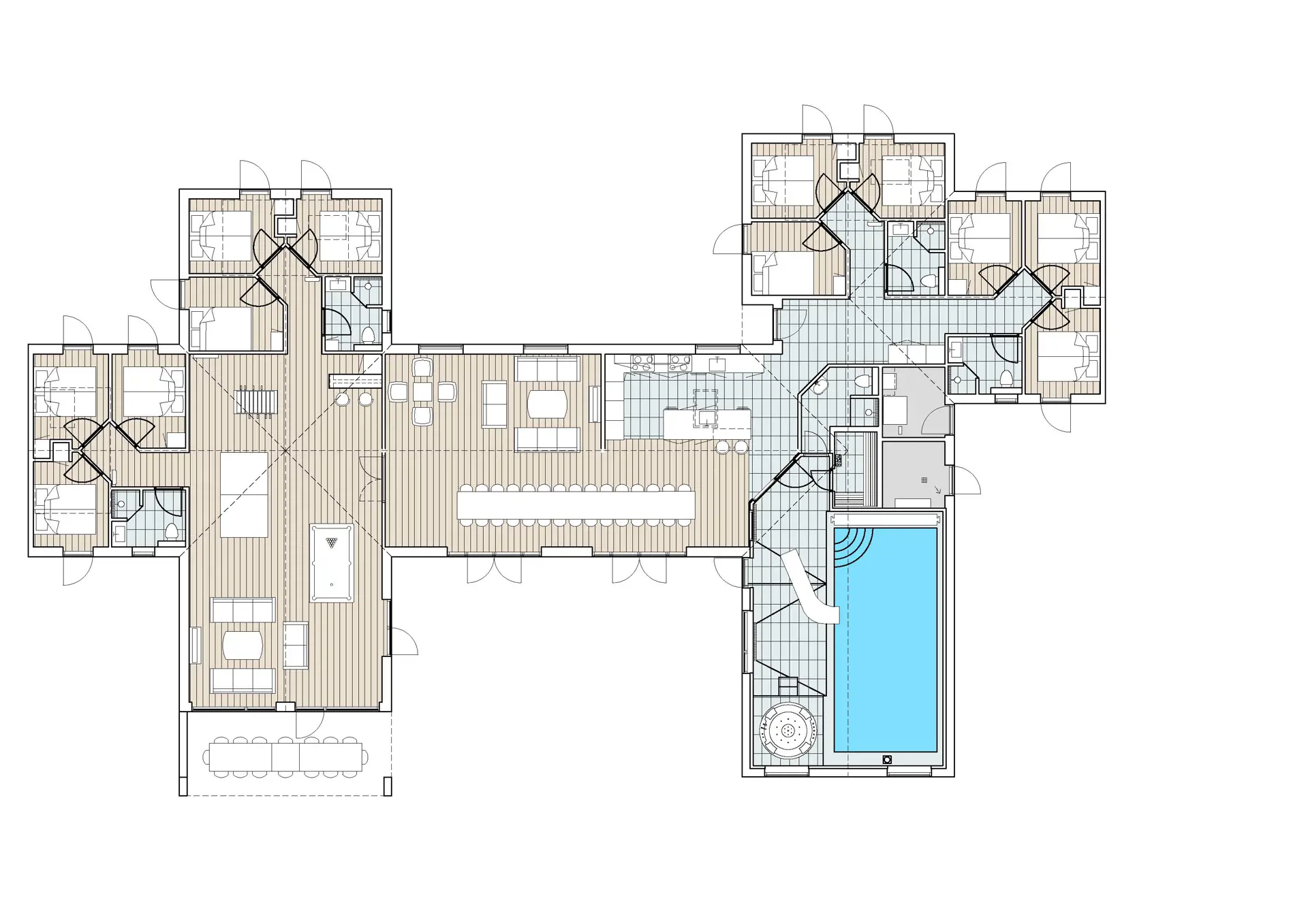 Diese großzügige Ferienvilla im Fjellerup Feriecenter bietet Platz für bis zu 30 Personen und eignet sich perfekt für große Familien, Freundesgruppen oder Betriebsausflüge. Das Haus verfügt über zwölf Schlafzimmer, die auf vier Bereiche mit jeweils eigenem Badezimmer verteilt sind, sowie drei geräumige Dachböden mit Schlafgelegenheiten für insgesamt 18 Personen – besonders ideal für Kinder. Der private Poolbereich mit Wasserrutsche, Whirlpool und Sauna sorgt für Badespaß und Entspannung, während man vom großen Esstisch aus stets den Überblick behält. Im XL-Aktivitätsraum können Sie sich bei Billard, Tischtennis, Darts oder Tischfußball messen, und an der kleinen Bar lassen sich gesellige Stunden verbringen. Die großzügige Küche mit doppelter Ausstattung lädt zum gemeinsamen Kochen ein, und im großen Ess- und Wohnbereich ist reichlich Platz für gemütliche Mahlzeiten und entspannte Abende. Draußen erwarten Sie eine Terrasse, ein multifunktionaler Sportplatz und Spielplätze, die frei genutzt werden können. Mit der Nähe zum Strand und der umgebenden Natur ist dies der perfekte Ort für einen unvergesslichen Urlaub. Hinweis: Das Haus ist noch im Bau, Abweichungen und Baulärm sind möglich.