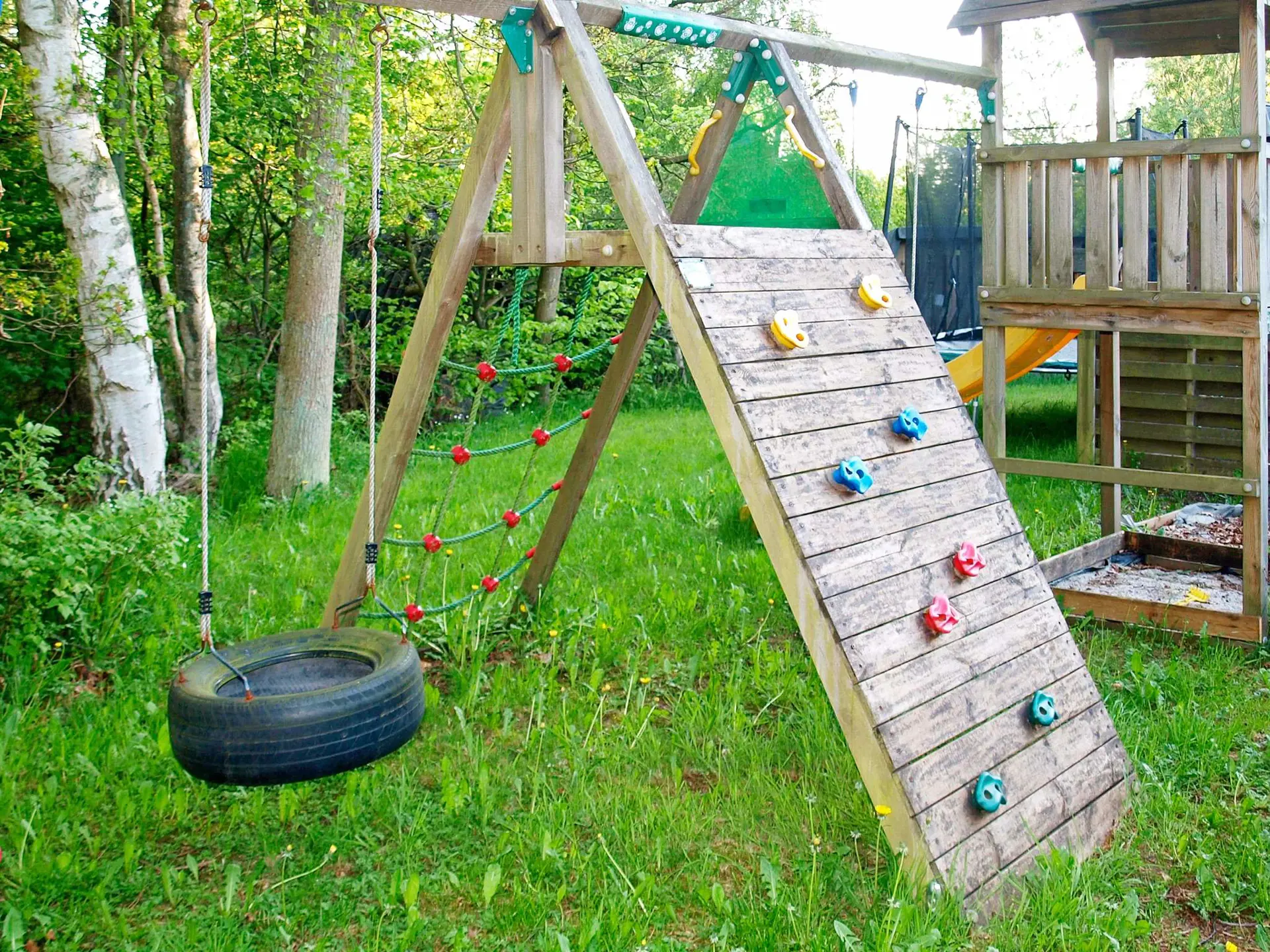 Der Fußboden des Hauses ist teilweise mit Teppichboden ausgelegt, teilweise gefliest. Wände und Decken sind holzverkleidet. Draußen auf dem Naturgrundstück stehen Sandkasten und Schaukel bereit. Das Grundstück liegt schön abgeschirmt und für sich.
