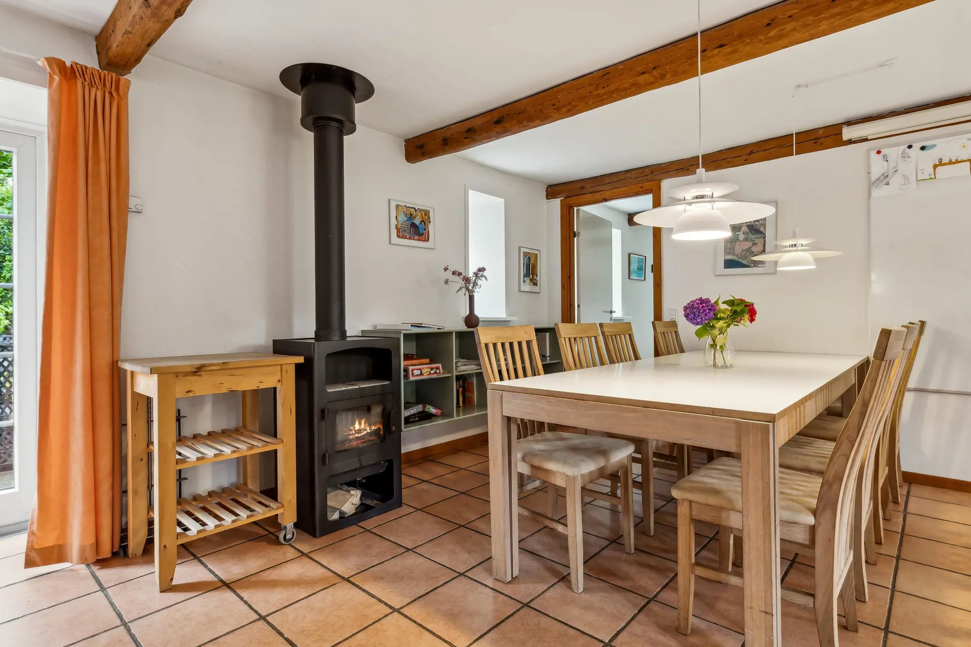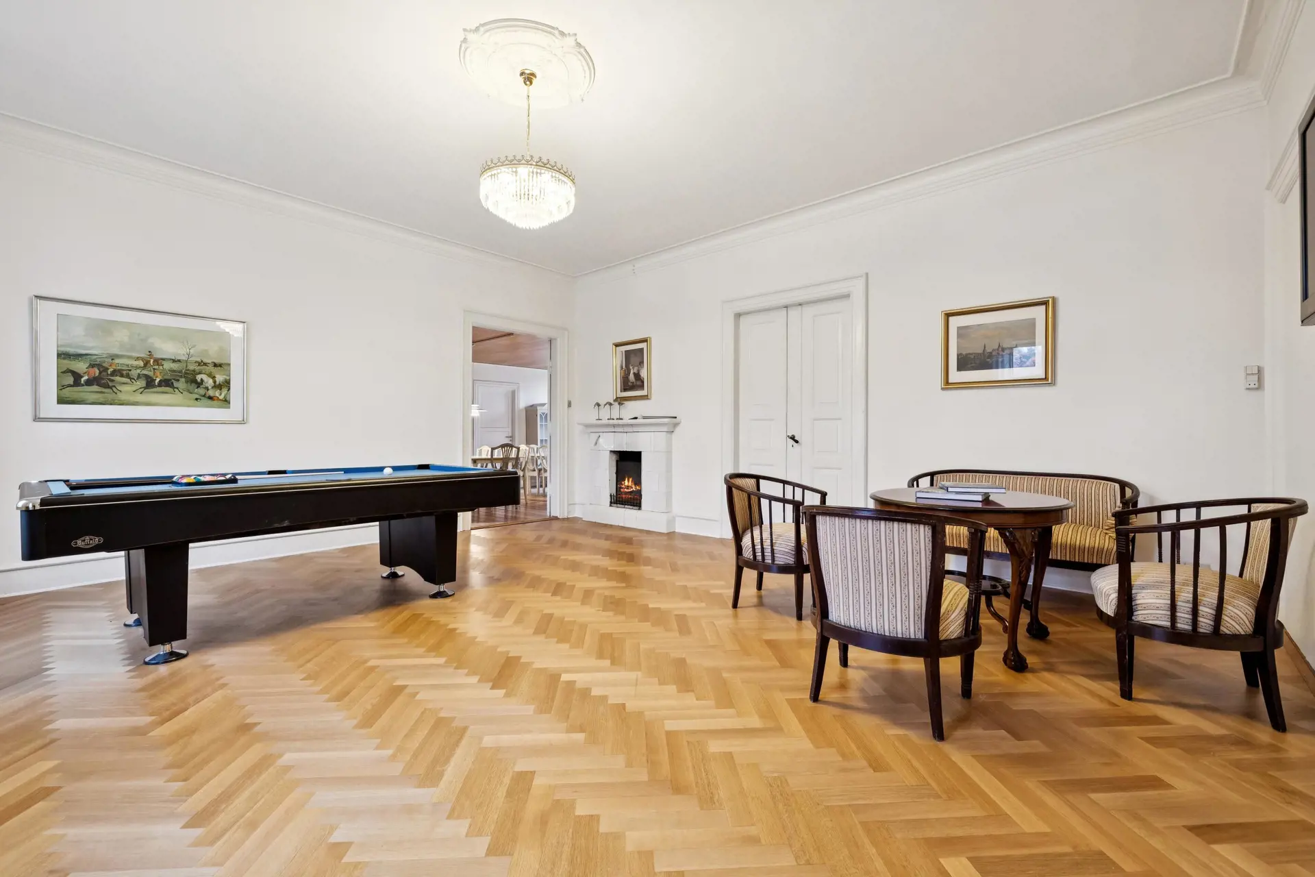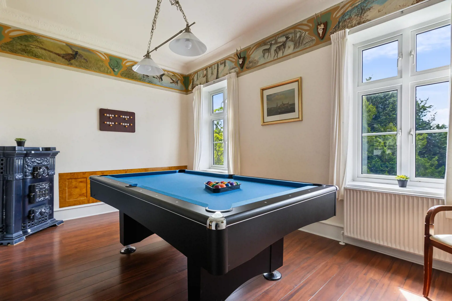 Das Haupthaus strahlt herrschaftliche Eleganz aus – mit hohen Decken, großzügigen Aufenthaltsräumen und Panoramafenstern mit Blick auf das Wasser. Hier können 28 Gäste in acht Schlafzimmern übernachten und gleichzeitig den großen Wohnraum, den Wintergarten mit direktem Zugang zum Garten, den Billardtisch und die gemütliche Spielecke für Kinder genießen. Die Atmosphäre ist luftig, elegant und dennoch einladend – perfekt für gemeinsames Essen, Entspannung und gesellige Momente.