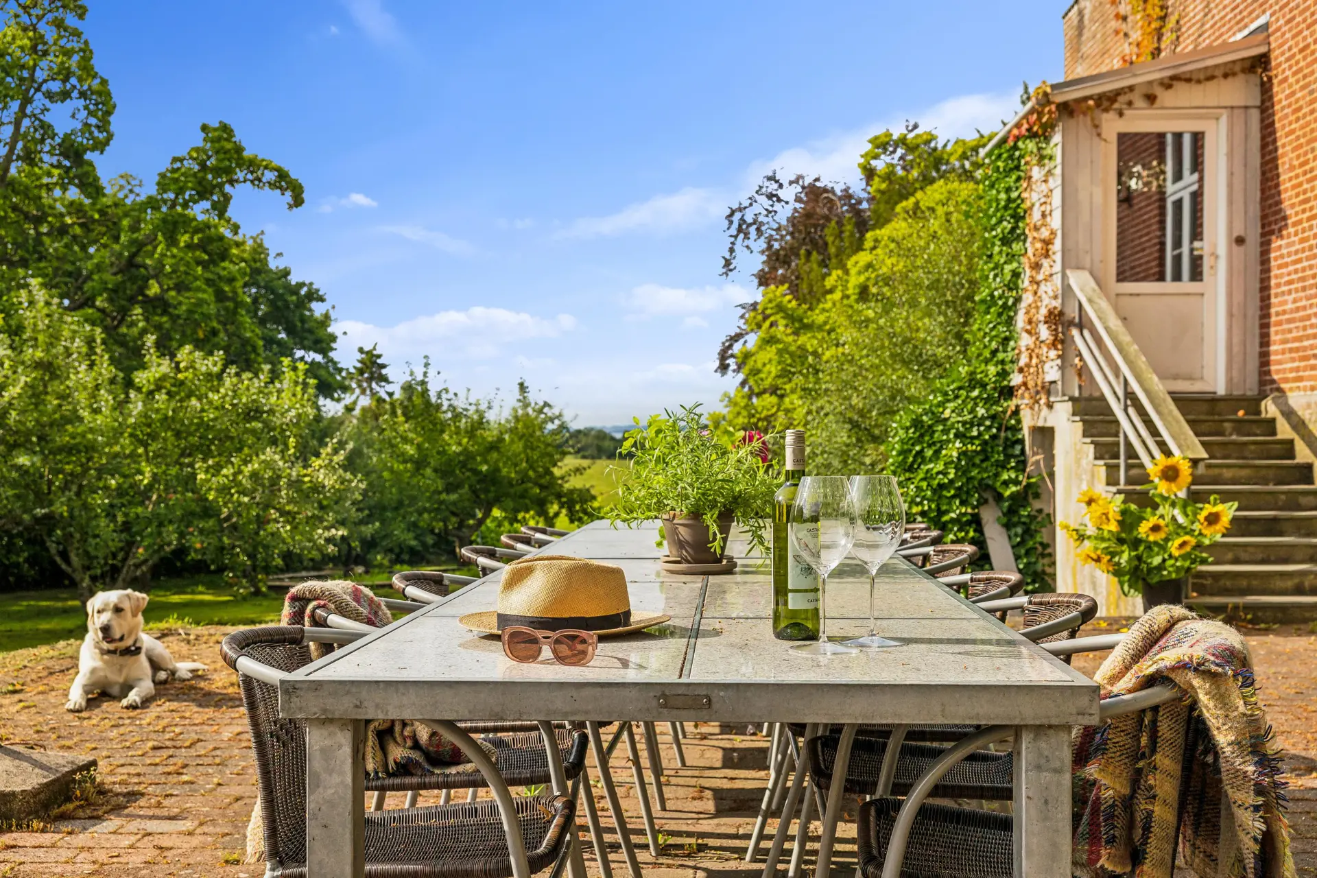 Der Westflügel bietet Platz für 32 Gäste in neun Zimmern und eignet sich ideal für Feierlichkeiten wie auch für ruhige Aufenthalte. Der Festsaal und die Gemeinschaftsbereiche schaffen den Rahmen für Abendessen, gemütliche Zusammenkünfte und gesellige Stunden, während die Bar und die Industrieküche die Versorgung kleiner wie großer Gruppen erleichtern. Vom Flügel aus gelangt man direkt in den Garten, wo die Gäste die Aussicht auf das Wasser und die schöne Natur genießen können.