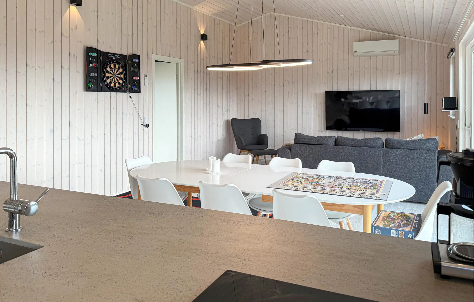 Diese Haus bietet Ihnen alles, was Sie für eine entspannte Auszeit vom Alltag benötigen. Eine große Fensterfront und eine schöne Holzoptik schaffen eine Atmosphäre, in der Sie schnell in den Urlaubsmodus schalten können. Egal ob Sie Ihre Lieblingsserie streamen, einen spannenden Podcast hören oder gemeinsam schmackhafte Mahlzeiten kochen, hier bestimmen Sie den Rhythmus Ihres Tages.