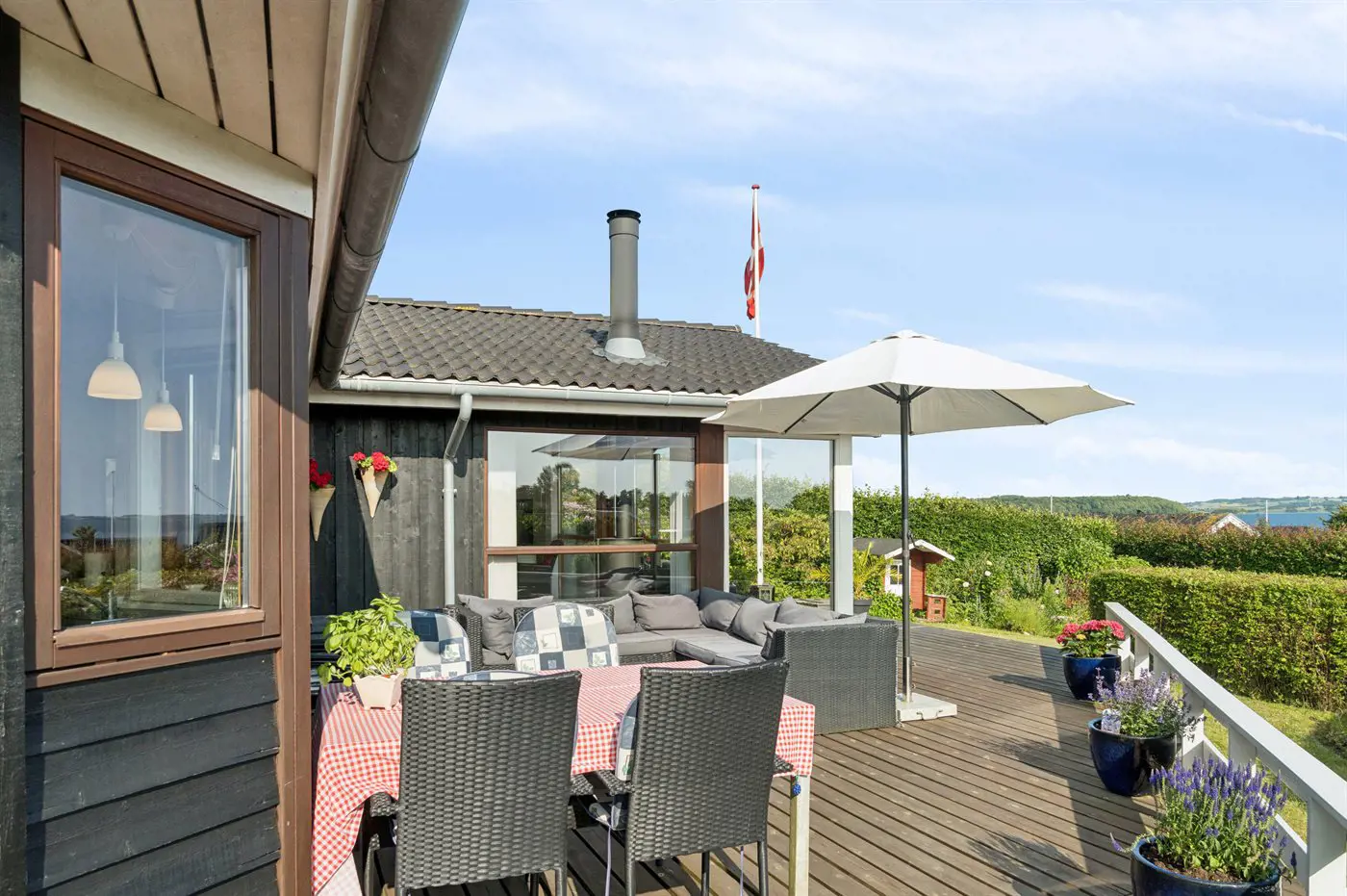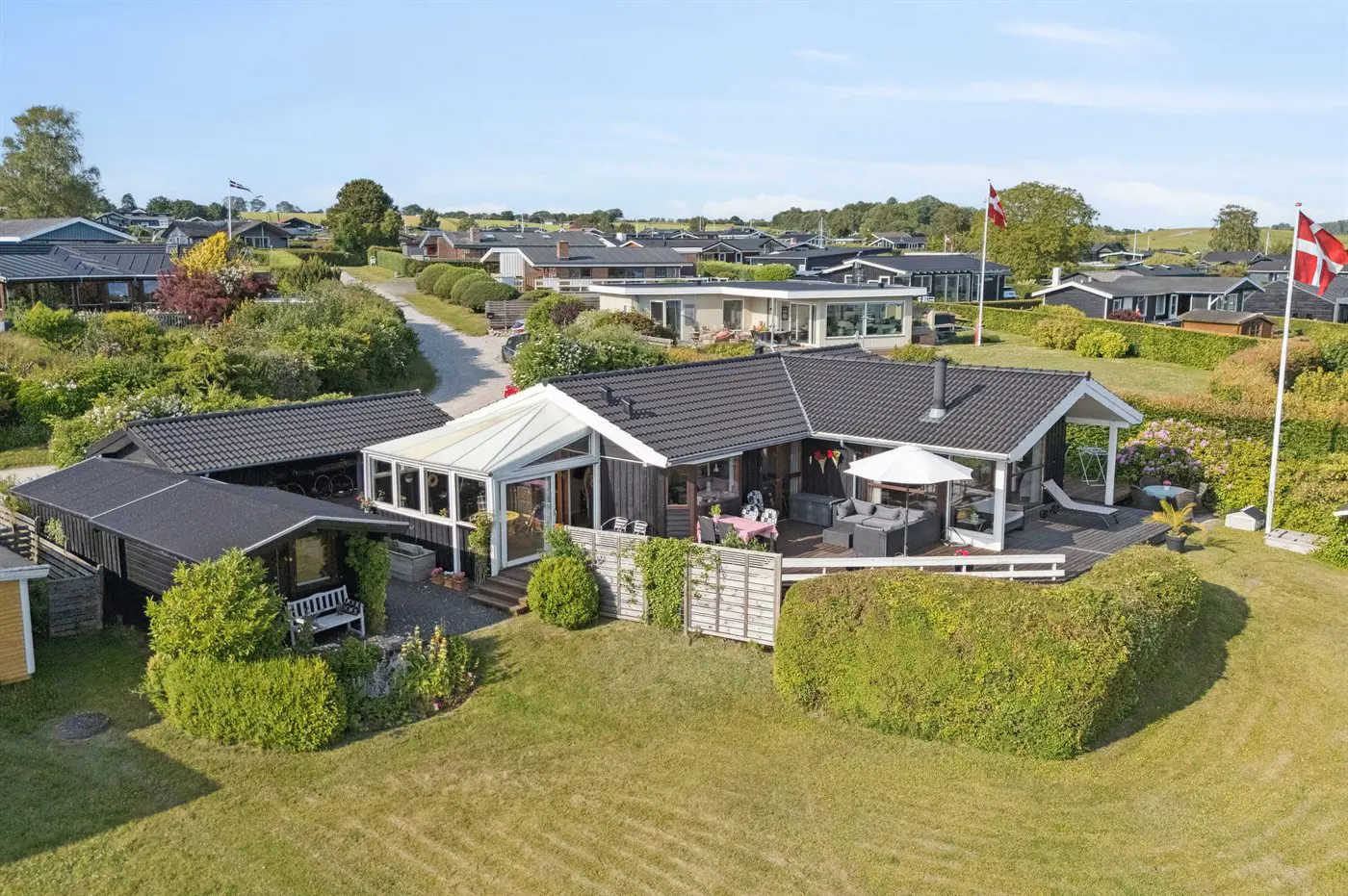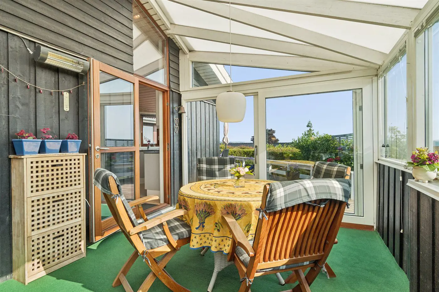 Das Haus verfügt über drei Schlafräume, verteilt auf zwei Zimmer sowie ein separates Gästehaus (Annex). Für das Auto gibt es einen Carport, und den Wintergarten lädt zu langen Abenden ein.