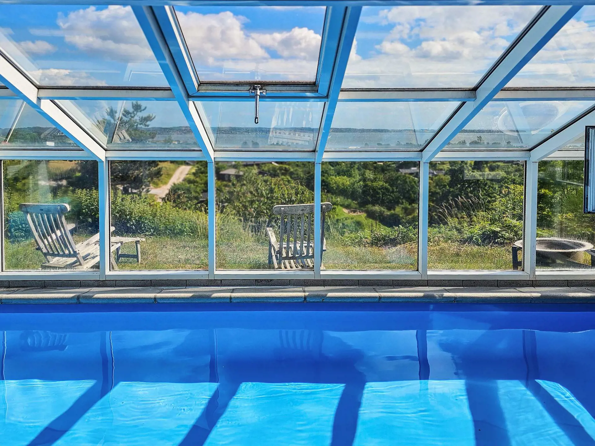 Der 18 m² große, beheizte Swimmingpool wird über eine Wärmepumpe beheizt und befindet sich in Verlängerung eines Badezimmers mit Sauna. Der Poolraum bietet die gleiche schöne Aussicht, sodass Sie das ganze Jahr über Spaß und Entspannung genießen können – auch wenn das Wetter einmal nicht so gut ist.