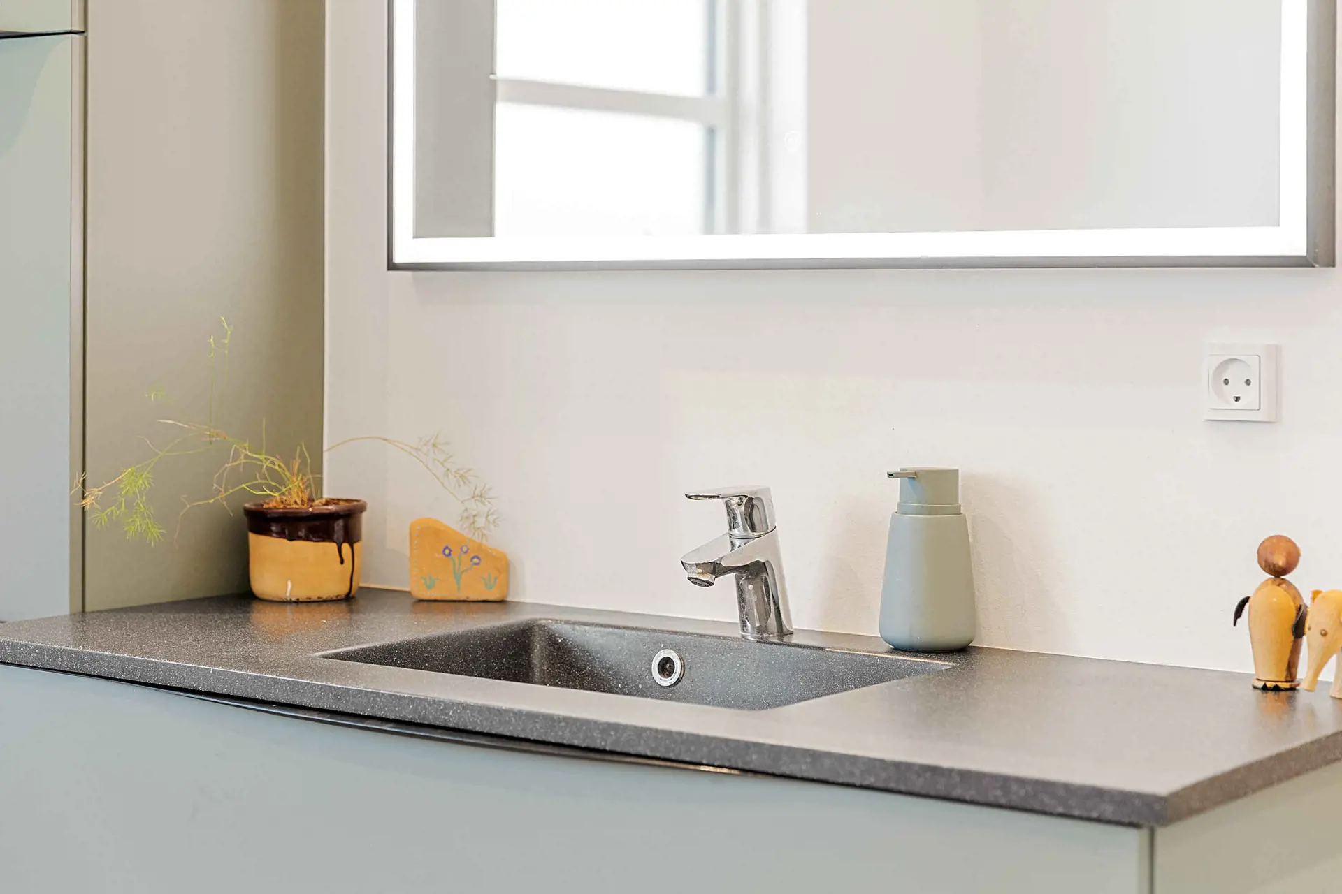 Das Badezimmer ist modern gestaltet und funktional eingerichtet.