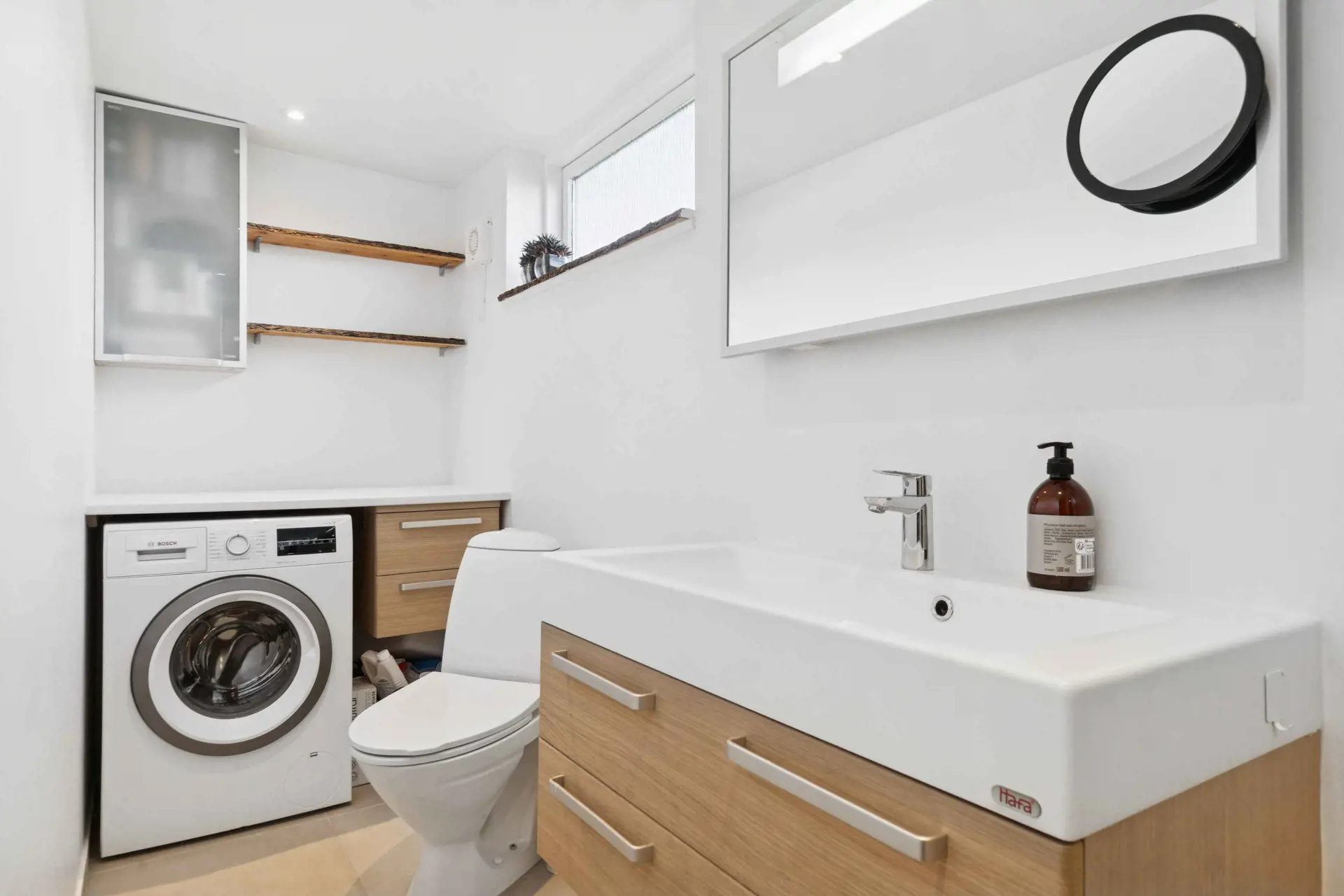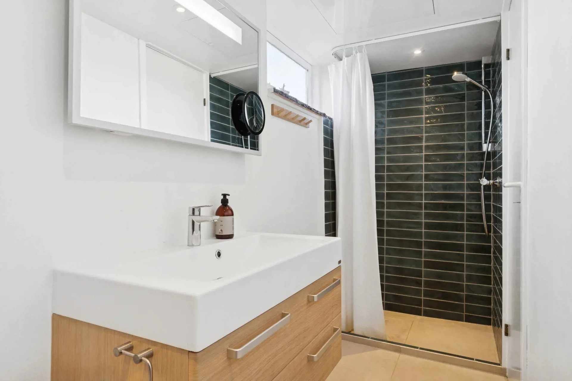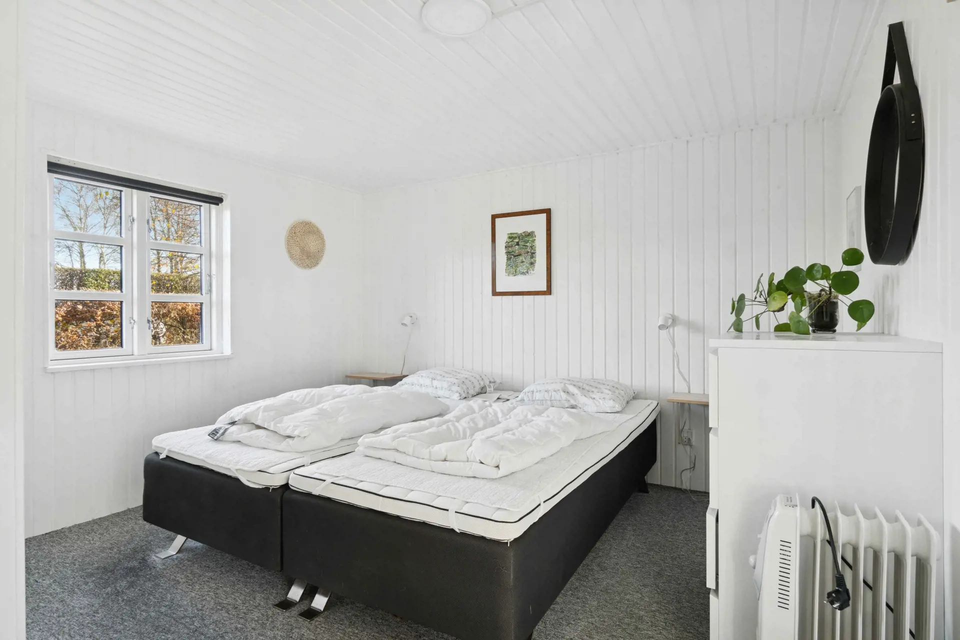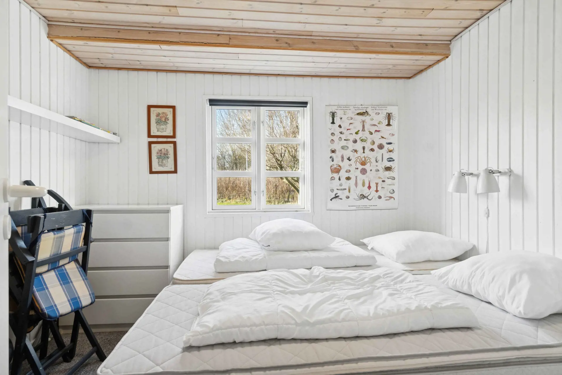 Die hellen Schlafzimmer bieten Platz für sechs Personen in drei Räumen. Das Badezimmer verfügt über eine Dusche und eine praktische Aufteilung. Das ganze Haus ist familienfreundlich gestaltet.