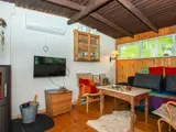 Kleines Ferienhäuschen auf einem reizvollen Naturgrundstück. Innen gemütlich eingerichtet, mit offenem Küchen-/Wohnbereich mit Essecke und Kaminofen. Vom Essbereich hat man schönen Ausblick zur Terrassenfläche davor.