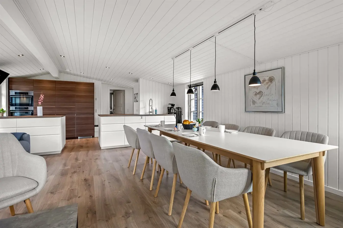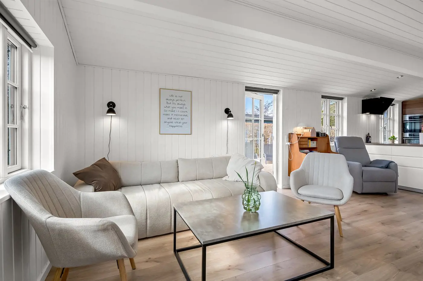 Das Ferienhaus präsentiert sich in sehr gutem Zustand, hell und modern sowie mit einer durchdachten Raumaufteilung. Das Herz des Hauses ist die große offene Küche mit Essbereich, die in direkter Verbindung zum Wohnzimmer steht. Hier kann sich die ganze Familie versammeln und gemeinsam entspannen, und von hier aus hast du direkten Zugang zu den schönen Terrassen. Das Haus hat eine Wohnfläche von 105 m² und bietet damit ausreichend Platz, zum Beispiel für eine Familie mit 2–3 Kindern oder sogar für zwei kleinere Familien, die ihren Urlaub in dieser schönen Umgebung genießen möchten. Es ist außerdem erlaubt, den vierbeinigen Freund der Familie mitzubringen. Zwei der Schlafplätze befinden sich in einem gemütlichen Gästehaus, das sich ideal für größere Kinder eignet.