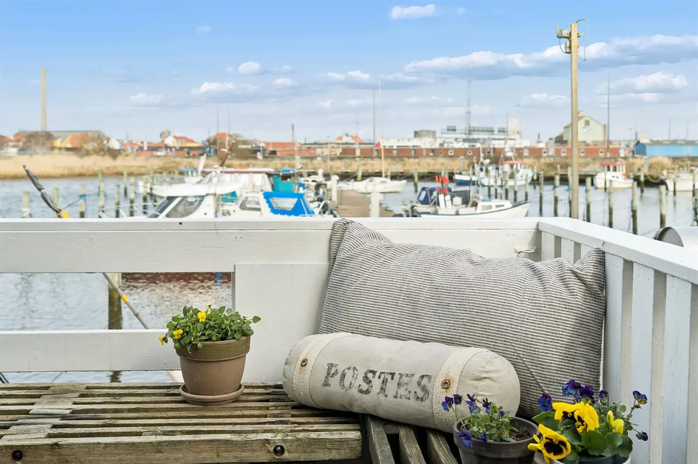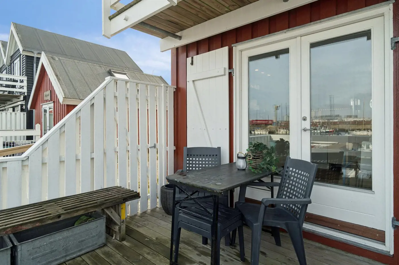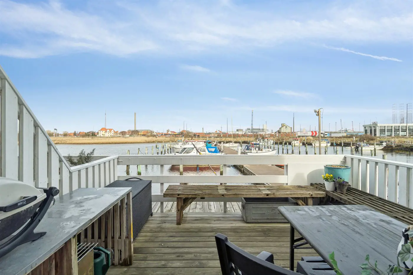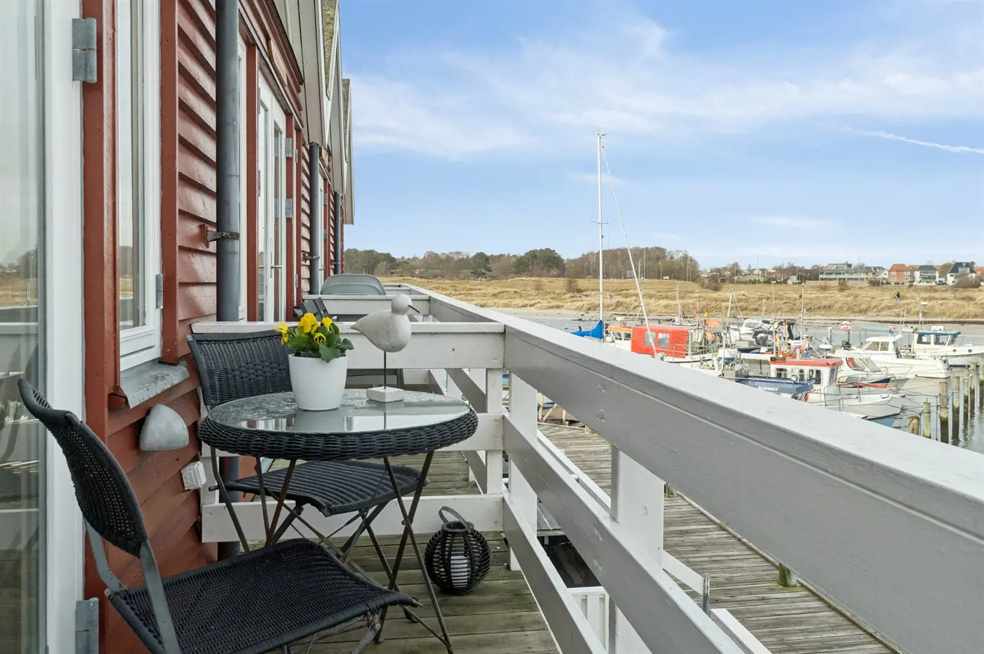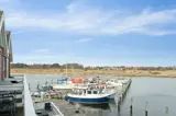 Freie Terrasse mit Blick über den Yachthafen. Gemütlich und charmant eingerichtet mit einer gut ausgestatteten Küche im Erdgeschoss sowie einem warmen und hellen Wohnzimmer im Obergeschoss.