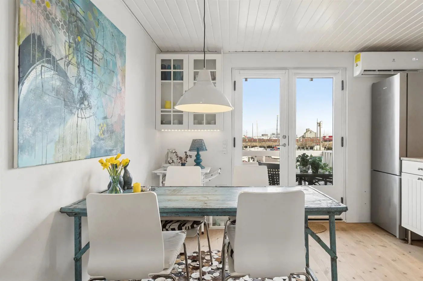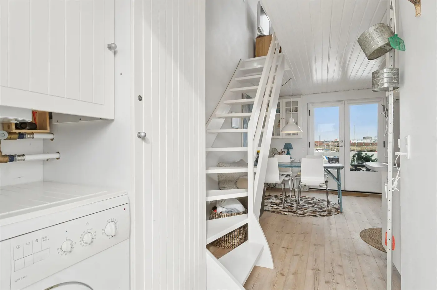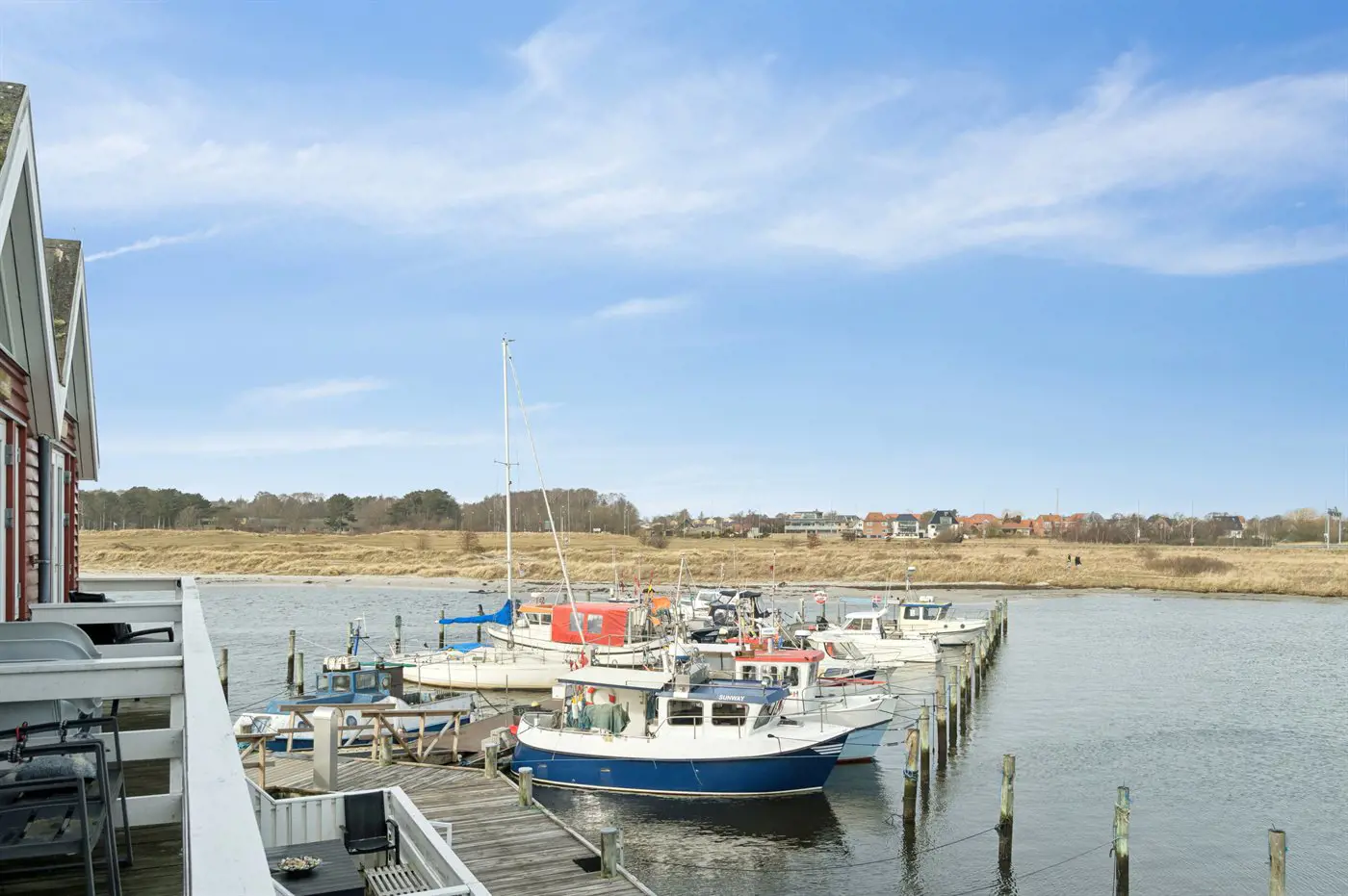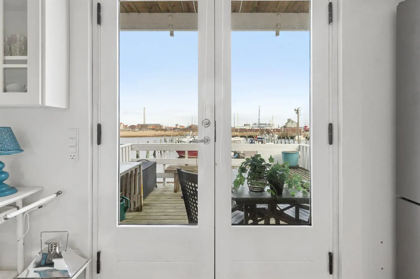 Freie Terrasse mit Blick über den Yachthafen. Gemütlich und charmant eingerichtet mit einer gut ausgestatteten Küche im Erdgeschoss sowie einem warmen und hellen Wohnzimmer im Obergeschoss.