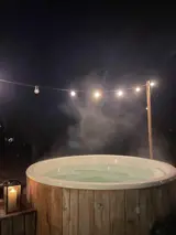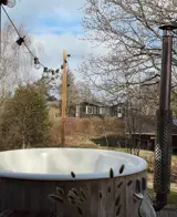 Im Außenbereich erwartet Sie ein grüner Garten mit Bäumen und Sträuchern, ein Trampolin für die Kinder sowie eine Rasenfläche zum Spielen und Entspannen. Genießen Sie lange Abende auf der Holzterrasse, entspannen Sie im Wildnisbad oder verbringen Sie eine Nacht im Shelter unter freiem Himmel.