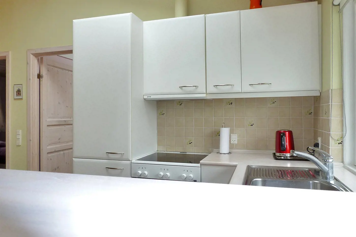 Die Küche ist mit Kühlschrank ausgestattet. Außerdem gibt es 4 Keramik-Kochfelder, Umluftofen, Mikrowelle sowie Geschirrspüler.