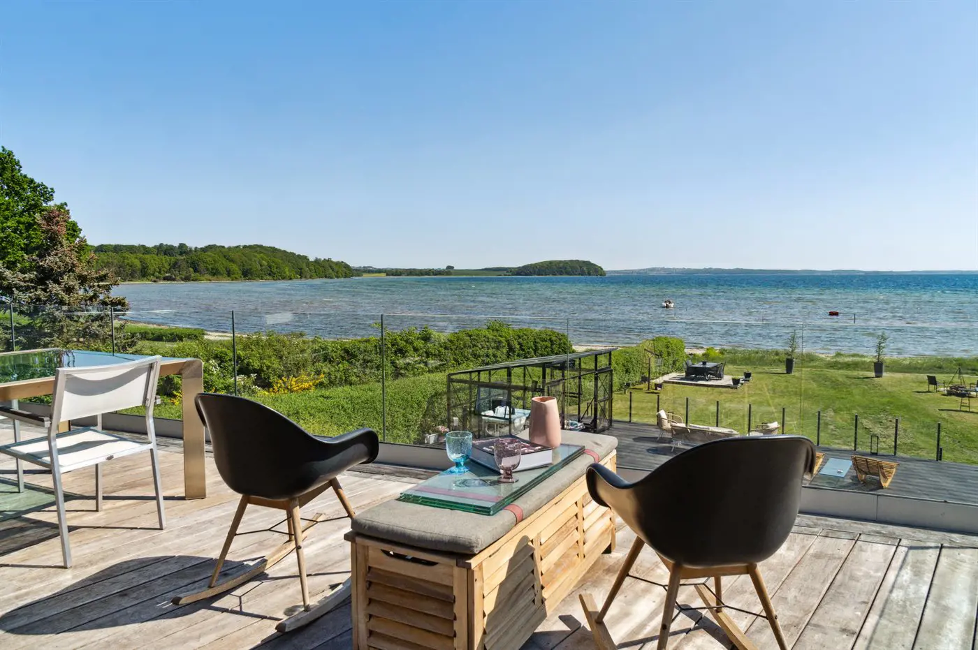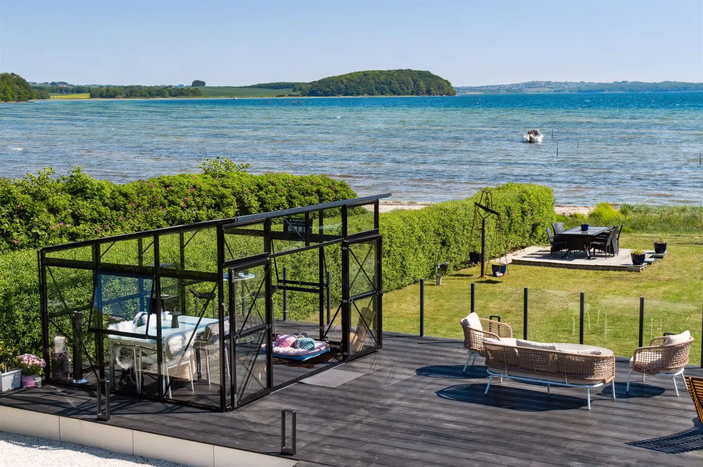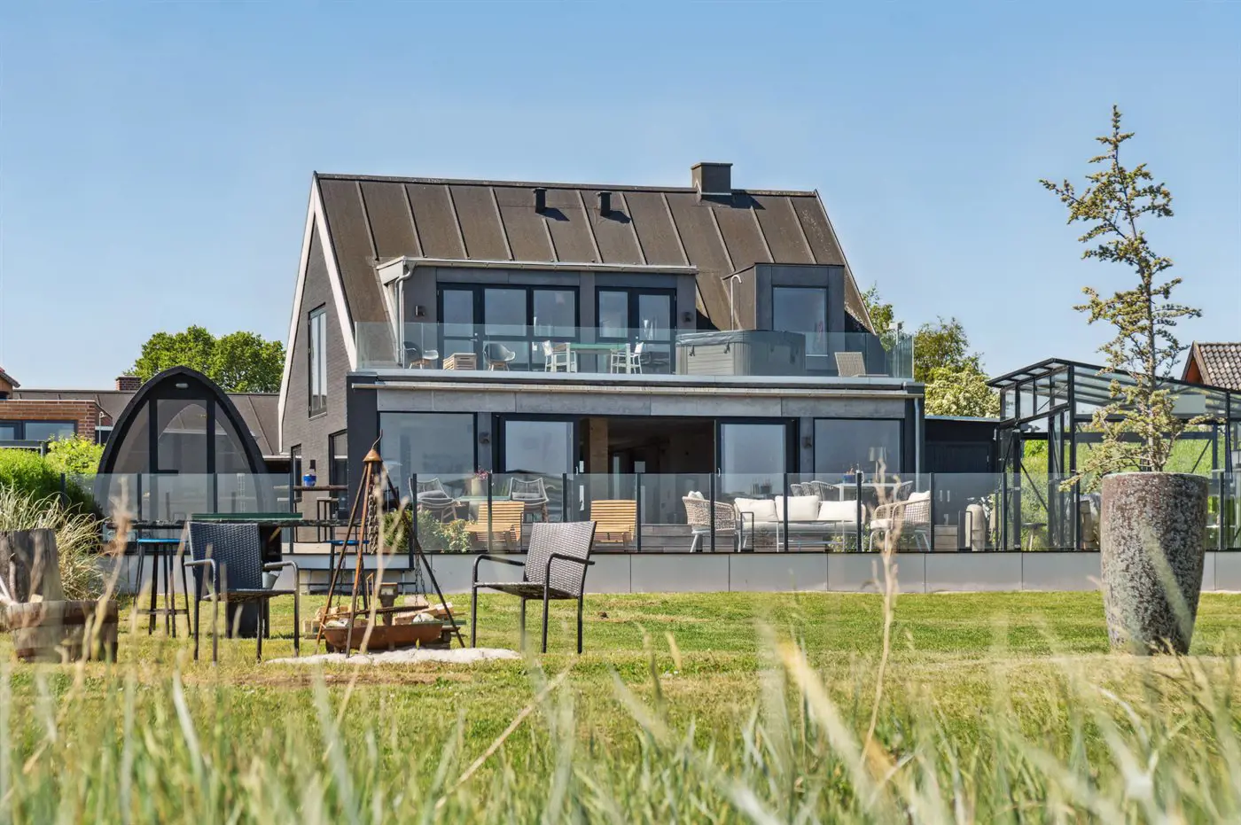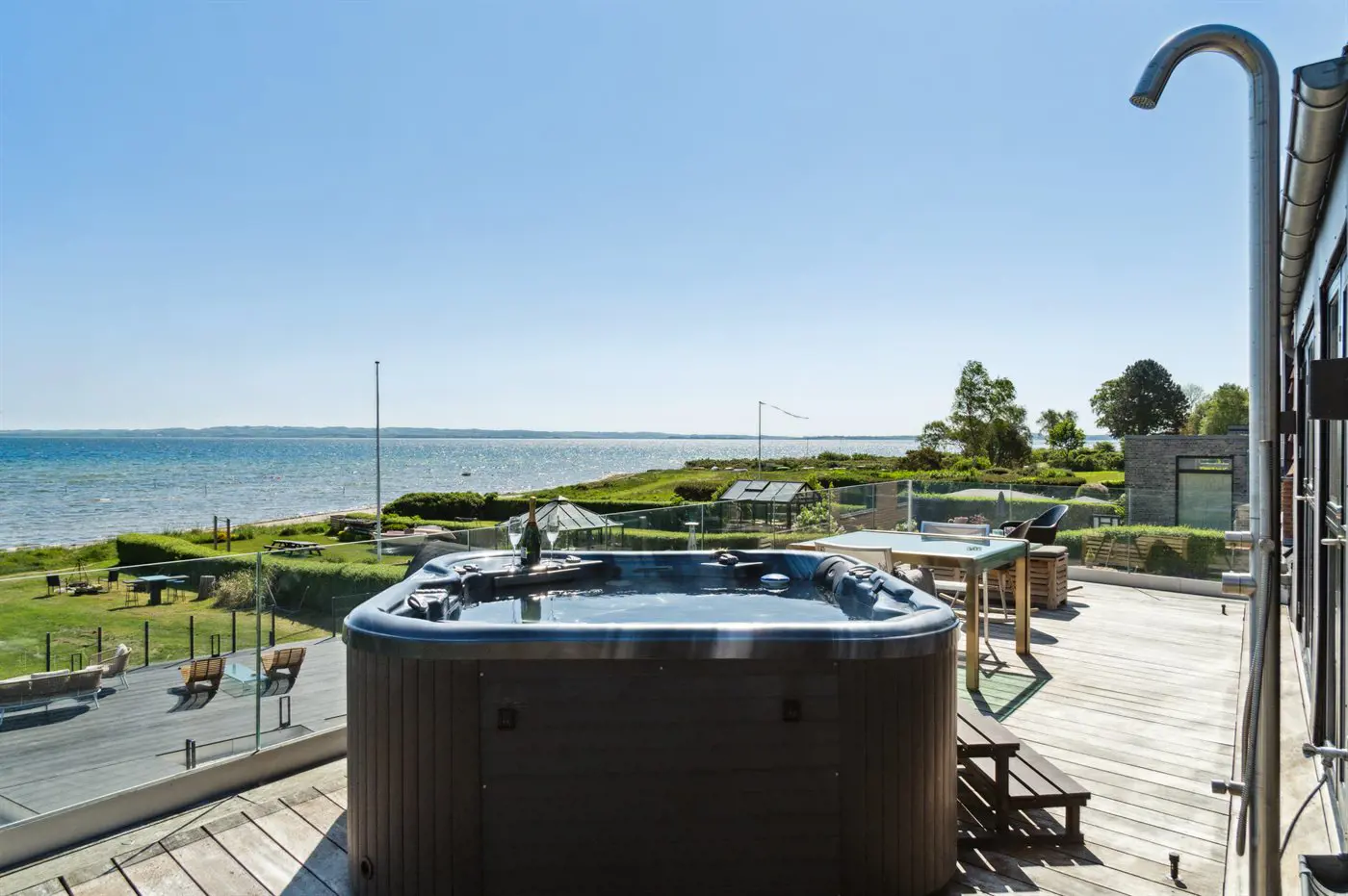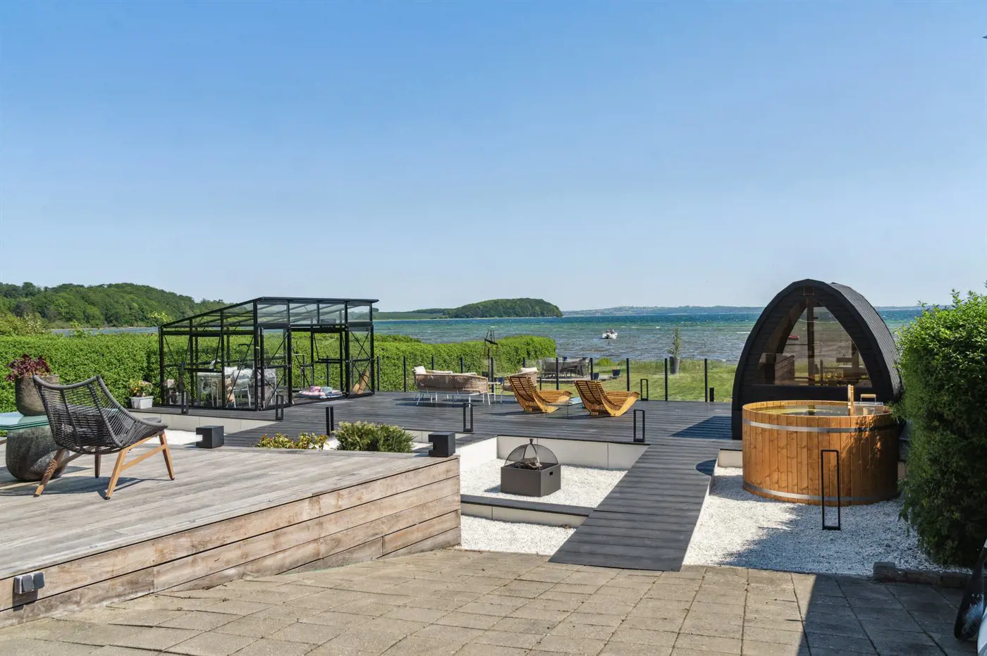 Die Villa beeindruckt auch von der Strandseite aus, wo eine durchdachte und schöne Terrassenlandschaft zum Genießen eines guten Weins oder eines Drinks einlädt. Im Garten befinden sich sowohl eine Sauna, ein Kaltwasserbecken als auch eine Außendusche, und auf der Terrasse der Villa im ersten Stock steht ein großes Außen-Whirlpool mit Platz für die ganze Familie - auch mit einem herrlichen Ausblick.