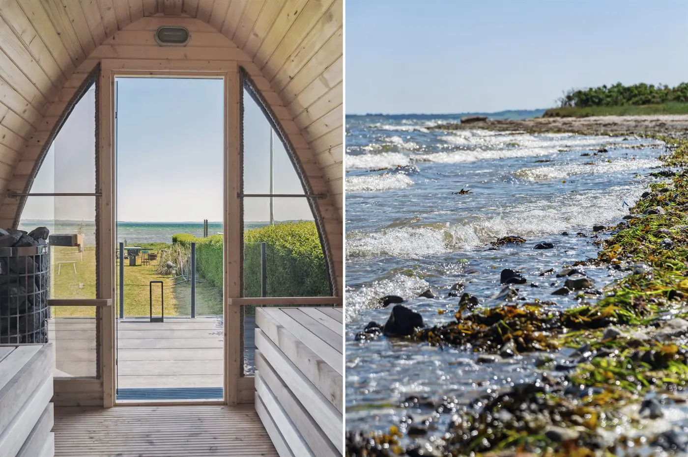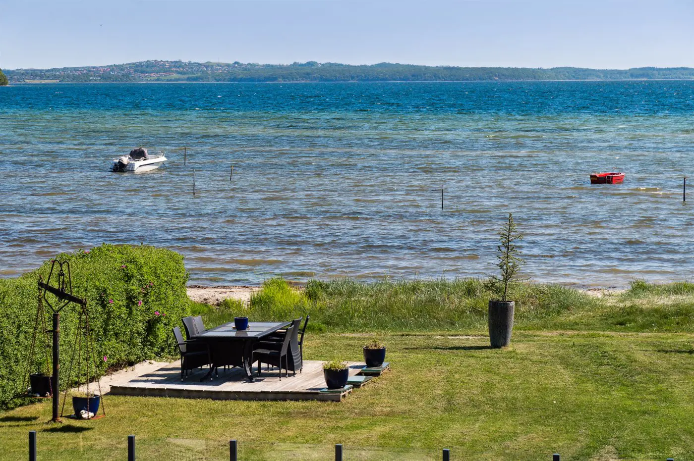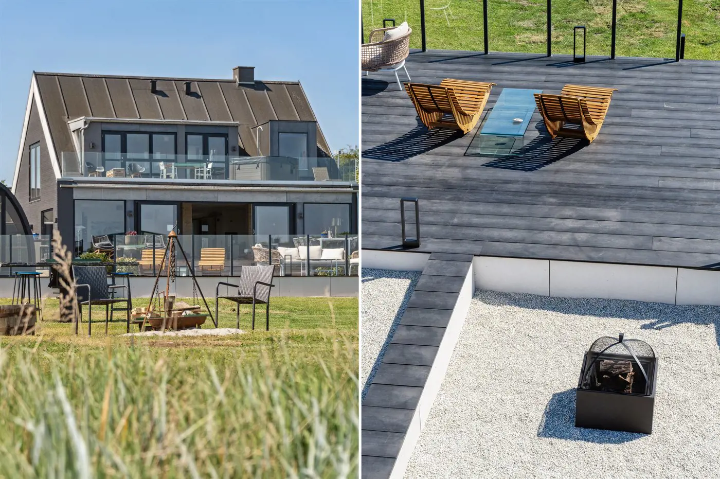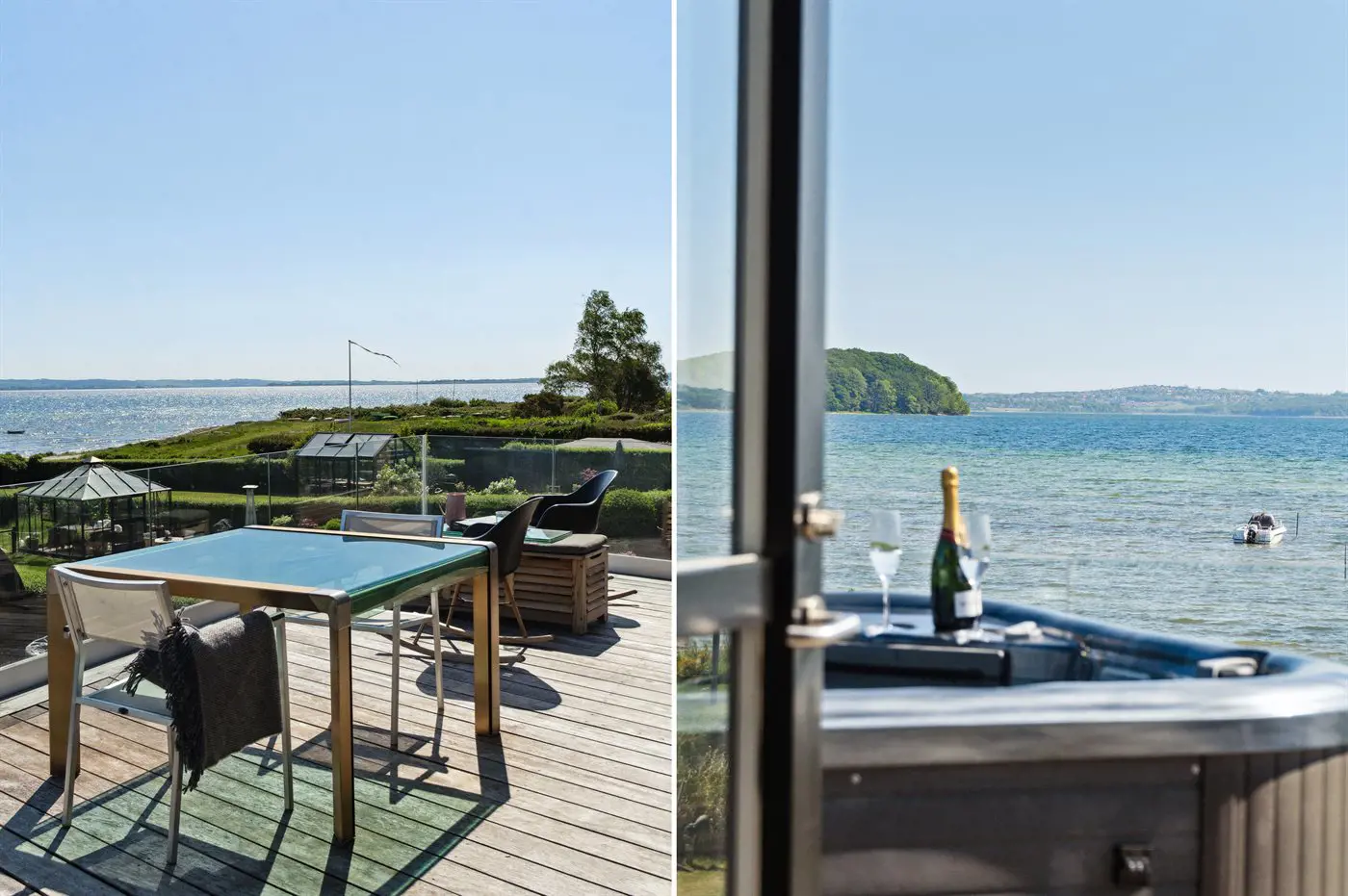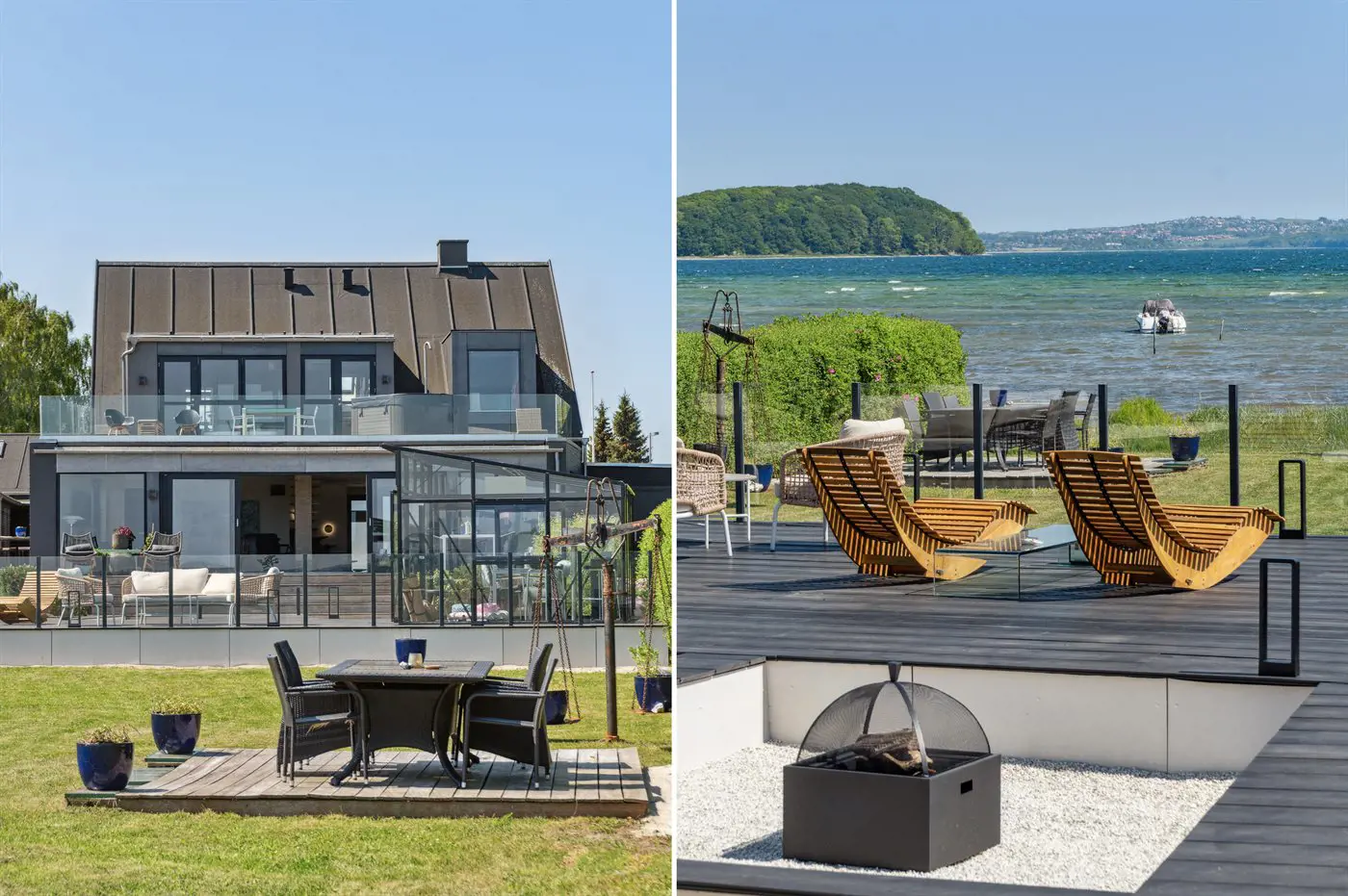 Die Villa beeindruckt auch von der Strandseite aus, wo eine durchdachte und schöne Terrassenlandschaft zum Genießen eines guten Weins oder eines Drinks einlädt. Im Garten befinden sich sowohl eine Sauna, ein Kaltwasserbecken als auch eine Außendusche, und auf der Terrasse der Villa im ersten Stock steht ein großes Außen-Whirlpool mit Platz für die ganze Familie - auch mit einem herrlichen Ausblick.