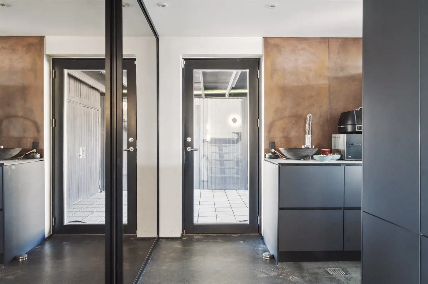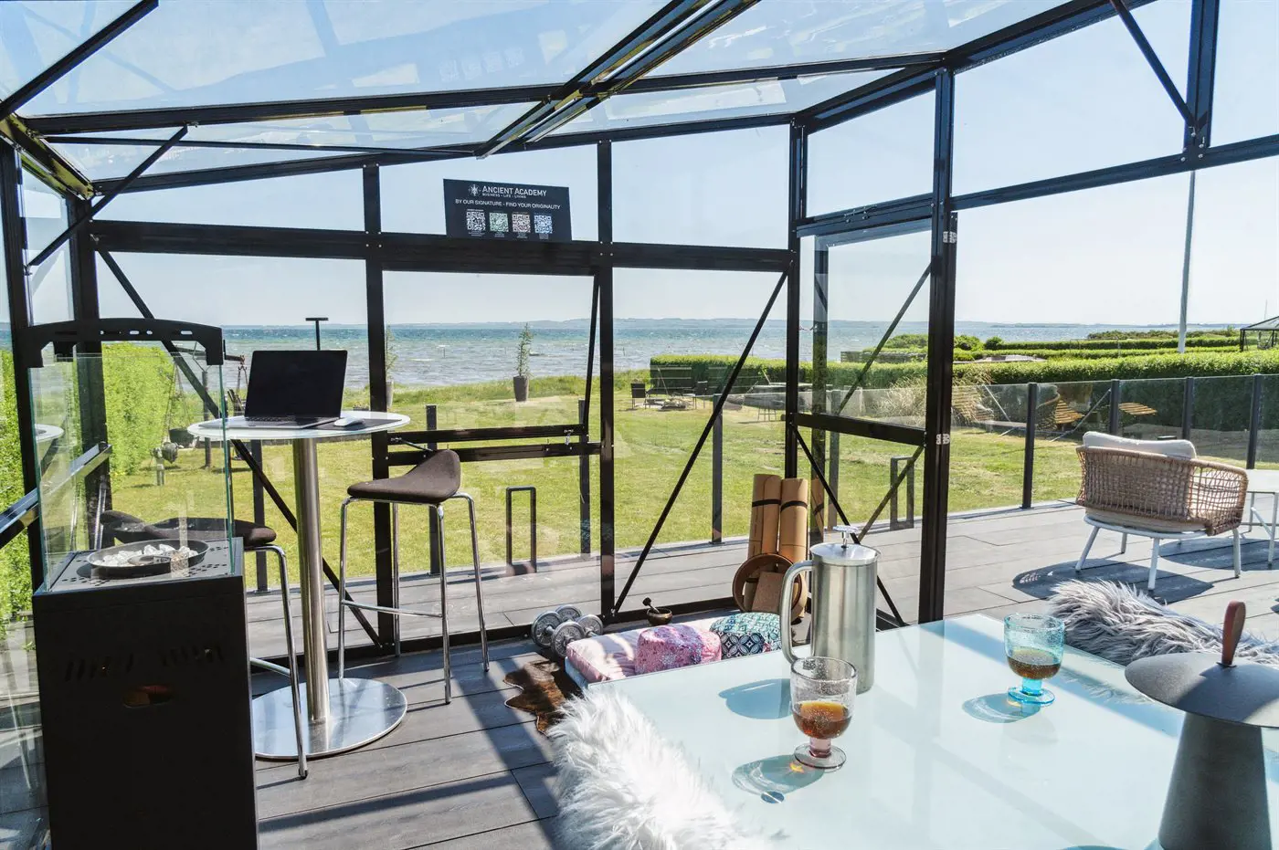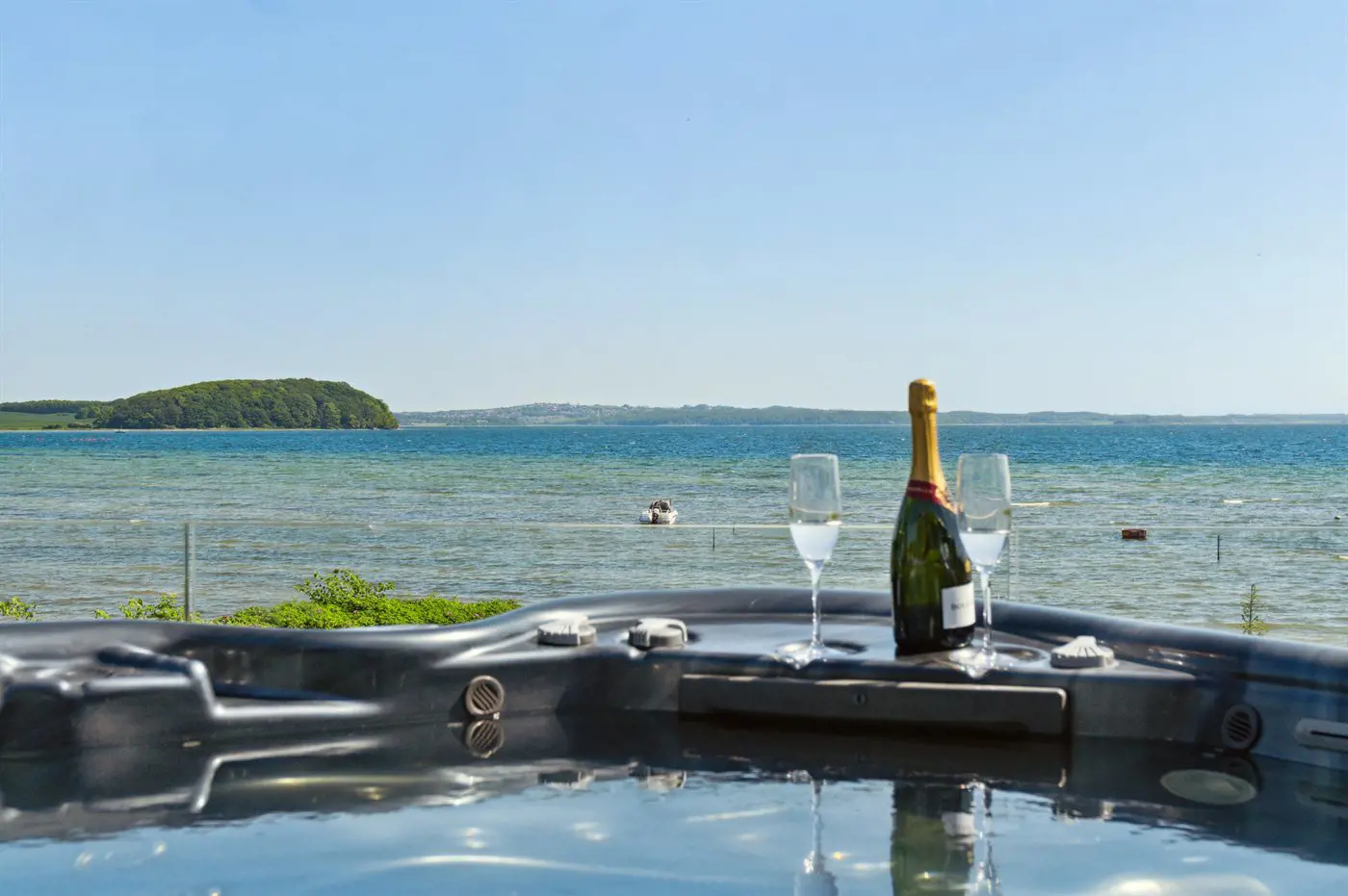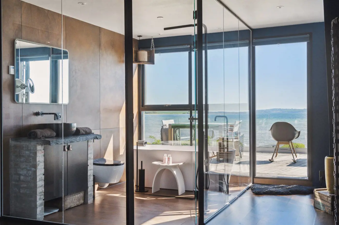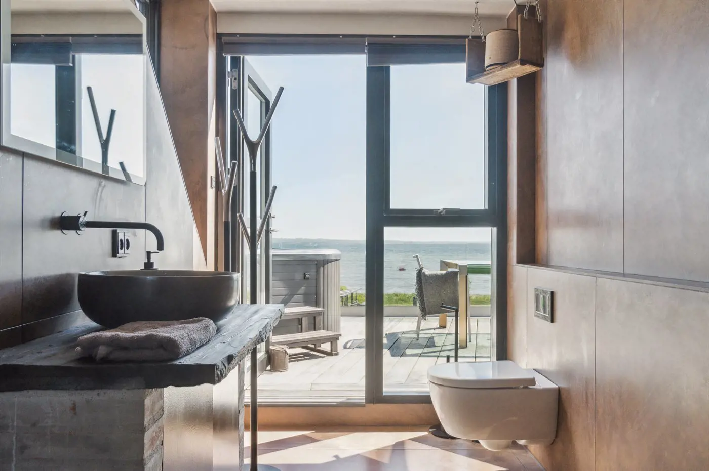 Die Villa beeindruckt auch von der Strandseite aus, wo eine durchdachte und schöne Terrassenlandschaft zum Genießen eines guten Weins oder eines Drinks einlädt. Im Garten befinden sich sowohl eine Sauna, ein Kaltwasserbecken als auch eine Außendusche, und auf der Terrasse der Villa im ersten Stock steht ein großes Außen-Whirlpool mit Platz für die ganze Familie - auch mit einem herrlichen Ausblick.