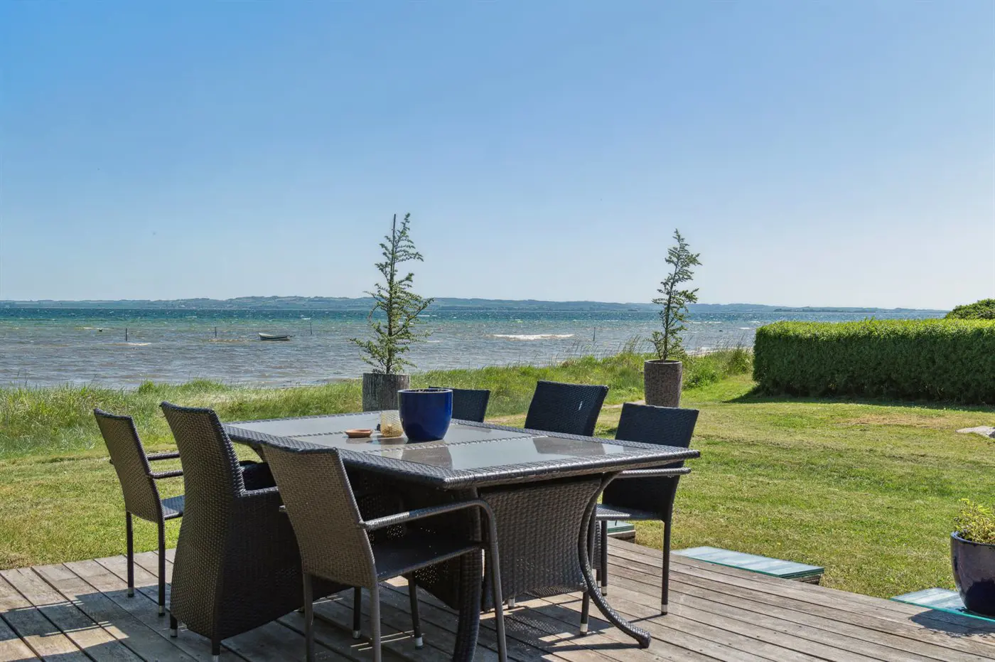 Die Ferienunterkunft liegt auf einem 1068 m² großen Gartengrundstück. Die Entfernung zum Meer beträgt 10 m. Die nächste Einkaufsmöglichkeit liegt 1500 m entfernt. In einem Abstand von 1200 m gibt es einen Golfplatz. Es steht ein offenes Terrassenareal zur Verfügung. Die Entfernung zu einem Spielplatz beträgt 100 m. Außensauna. Parkplatz auf dem Grundstück.