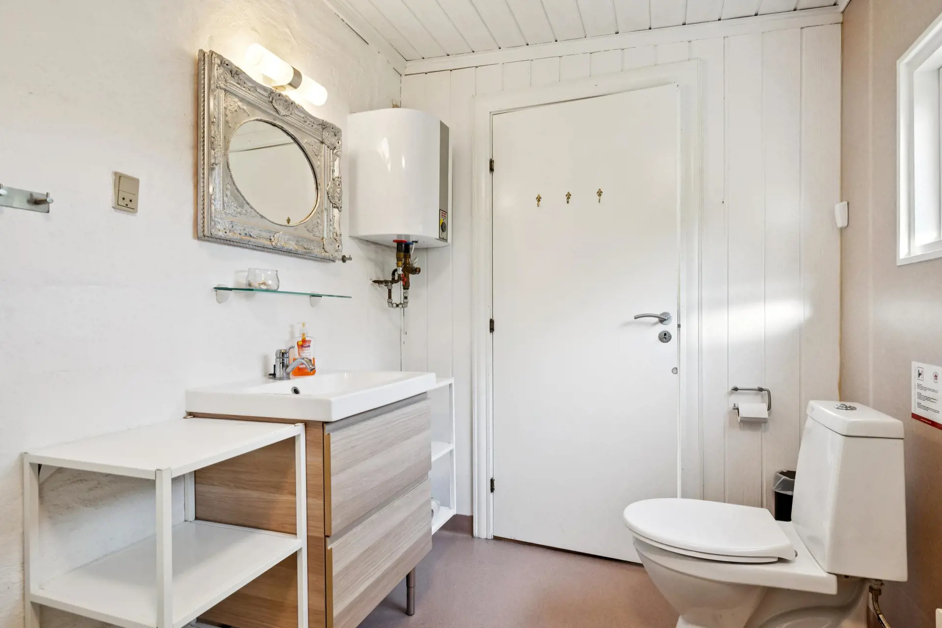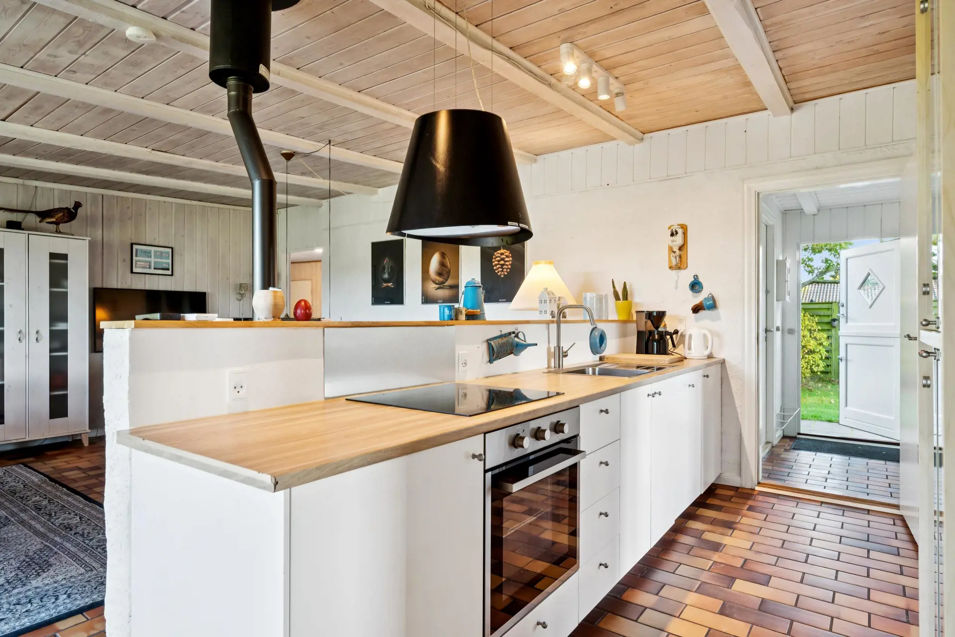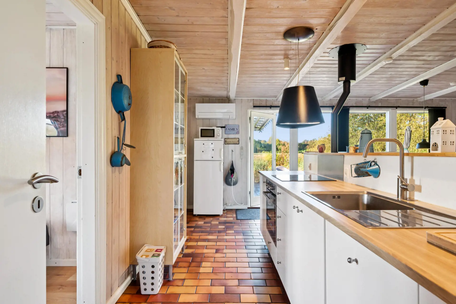 In der schönen Natur bei St. Sjørup liegt dieses gemütliche Ferienhaus. Hier erwartet Sie ein helles und freundlich eingerichtetes Wohnzimmer mit unter anderem Holzofen und Wärmepumpe. Angrenzend an das Wohnzimmer befindet sich die gut ausgestattete und funktionale Küche mit unter anderem Geschirrspüler. Von der Küche aus haben Sie direkten Zugang zu einer herrlichen überdachten Terrasse mit Gartenmöbeln und Grill.