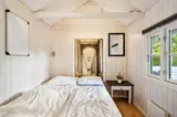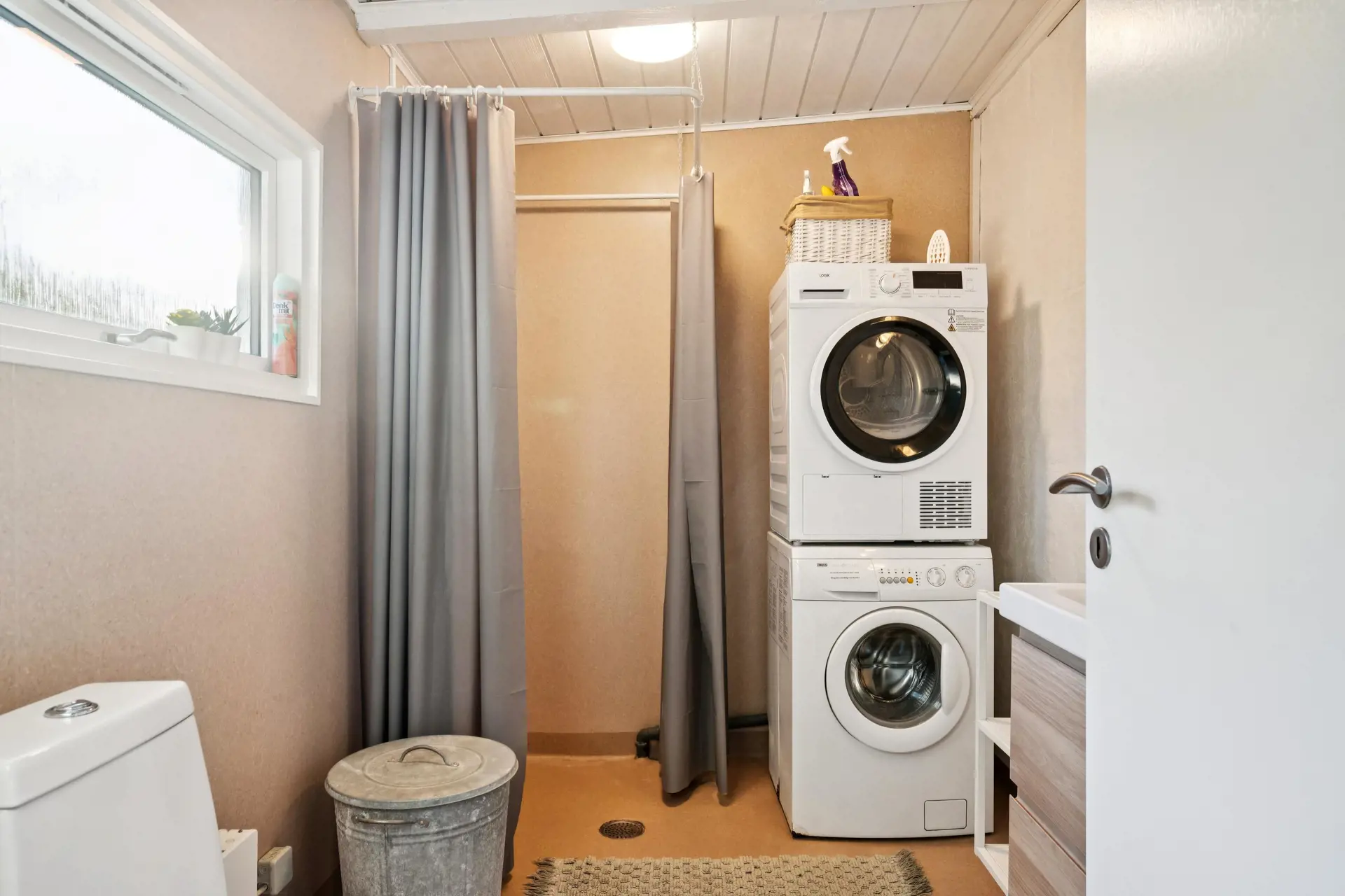 Das geräumige Badezimmer verfügt über eine Dusche sowie Zugang zu Waschmaschine und Trockner.