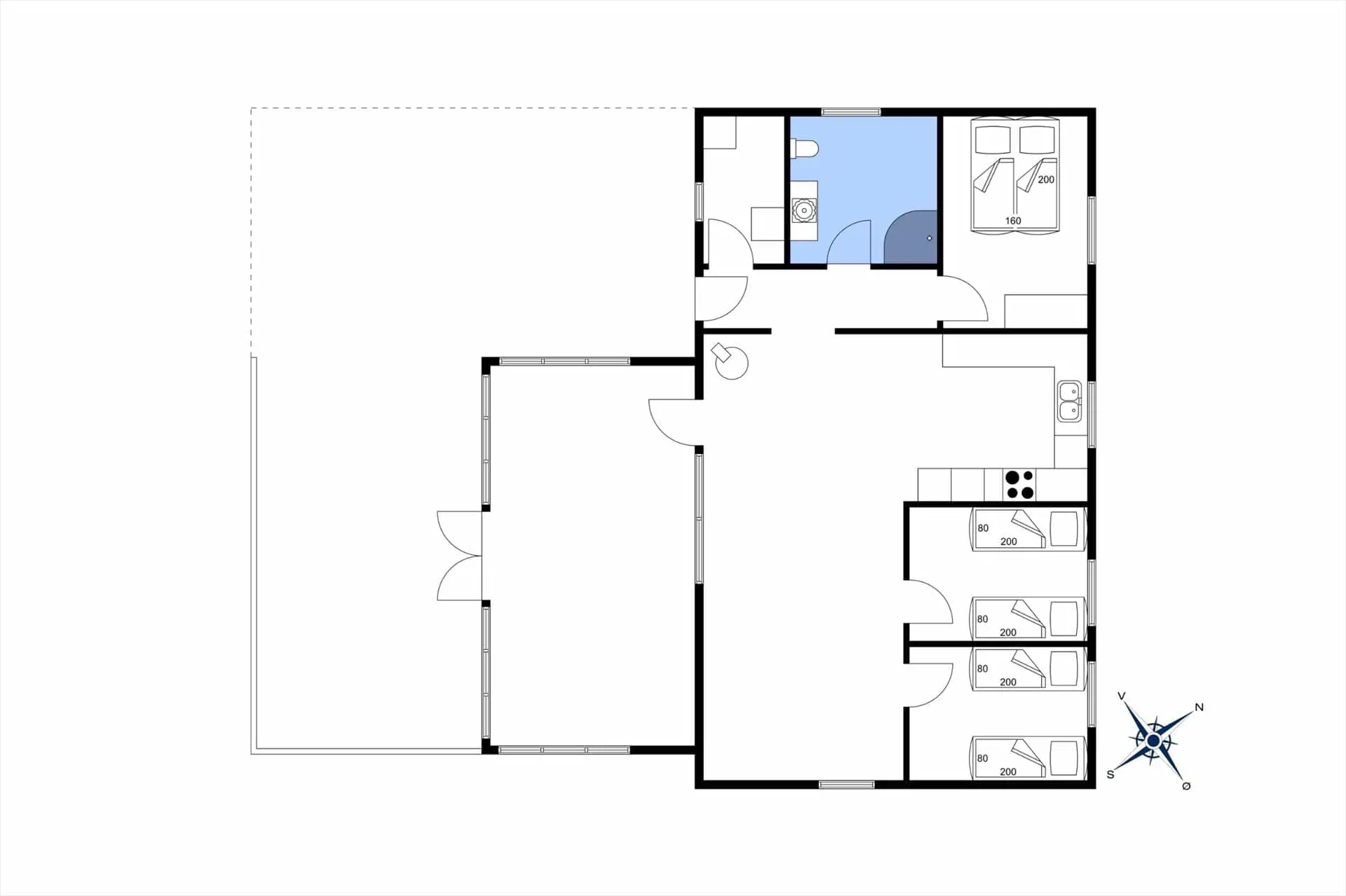 Stell dir vor, wie du dieses schöne Ferienhaus in Store Sjøstrup betrittst und von der überaus gemütlichen und erholsamen Wohnatmosphäre in Empfang genommen wirst. Das Haus begrüßt dich mit einem offenen, hellen Küchen- und Essbereich, der im Nu zum zentralen Sammelpunkt deiner Familie avancieren wird. Euch erwarten eine zeitgemäße Ausstattung und richtig viel Platz für das gemeinsame Zubereiten eurer Mahlzeiten. Das Besondere an diesem Mietobjekt ist der neue geräumige Wintergarten, in dem ihr euch gern und viel aufhalten werdet. Mit großen Fenstern, hellen Holzwänden und einer modernen Möblierung ist der Wintergarten ein wunderbarer Rückzugsort für erholsame Stunden - am Morgen mit einem frischen Kaffee und am Abend mit einem spannenden Buch. Der eigentliche Wohnraum präsentiert sich nicht weniger schön und verwöhnt dich und deine Lieben mit einem behaglich knisternden Pelletofen, der an kühlen Abenden wohlige Wärme spendet. In den drei Schlafräumen könnt ihr euch nach Herzenslust ausschlafen. Einer der Schlafräume beinhaltet ein Doppelbett. In den anderen beiden stehen Einzelbetten bereit. Falls ihr weitere Schlafgelegenheiten für Gäste benötigt, steht ein Nebenhaus zur Verfügung. Dieses besticht mit einem eigenen Badezimmer und umfasst ein Doppel- und ein Etagenbett - perfekt für die Großeltern, deine größeren Kinder oder eine kleine befreundete Familie.
