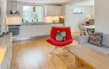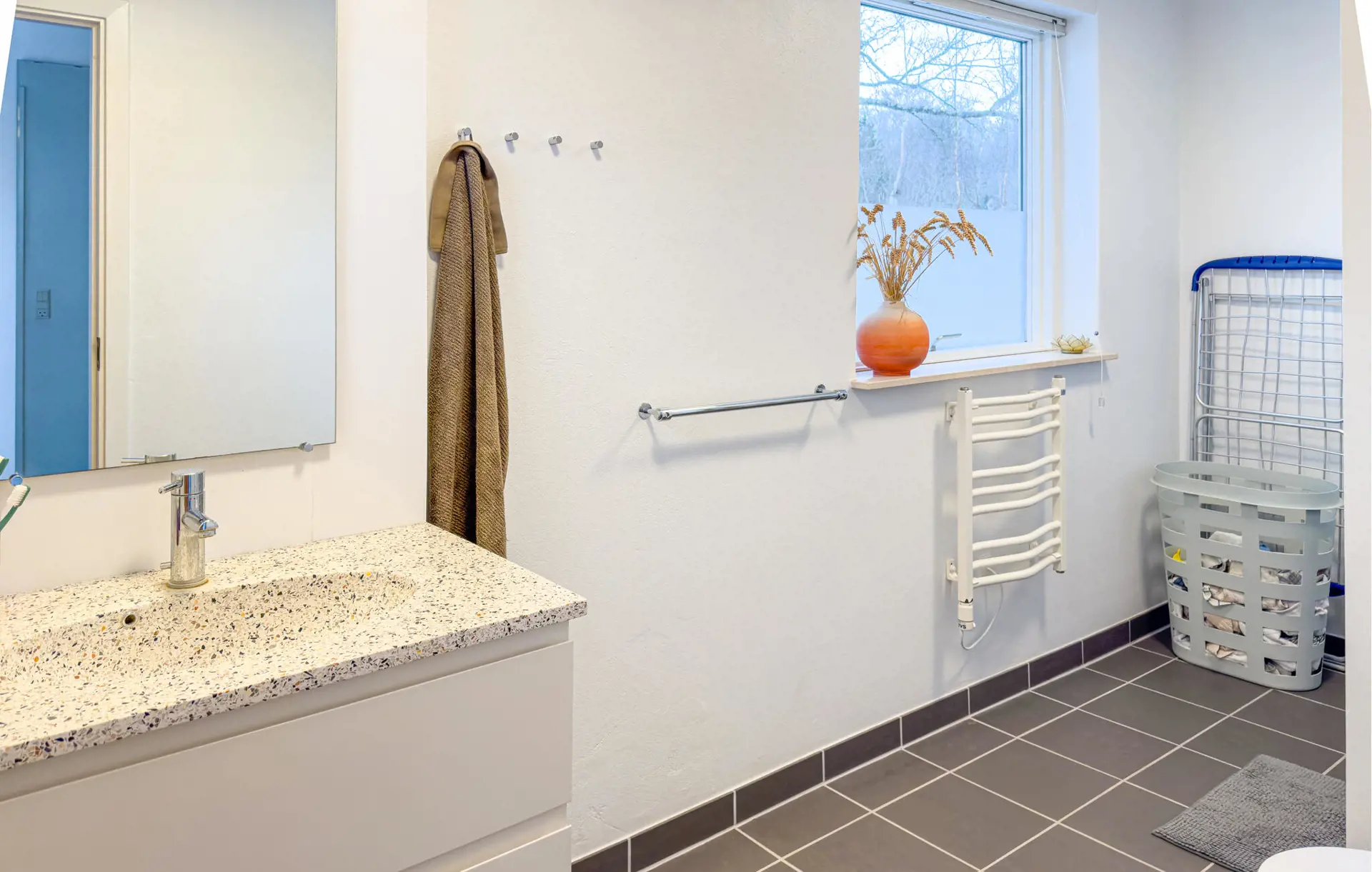 Dieses Haus vermittelt eine helle, gemütliche Atmosphäre mit klaren Linien, gemütlichem Sofa und einem behaglichen Kaminofen. Machen Sie es sich im Wohnbereich bequem, schauen Sie gemeinsam Filme oder genießen Sie vergnügte Abende beim Kartenspielen. Die entspannte Umgebung lädt dazu ein, zur Ruhe zu kommen und den Alltag hinter sich zu lassen.